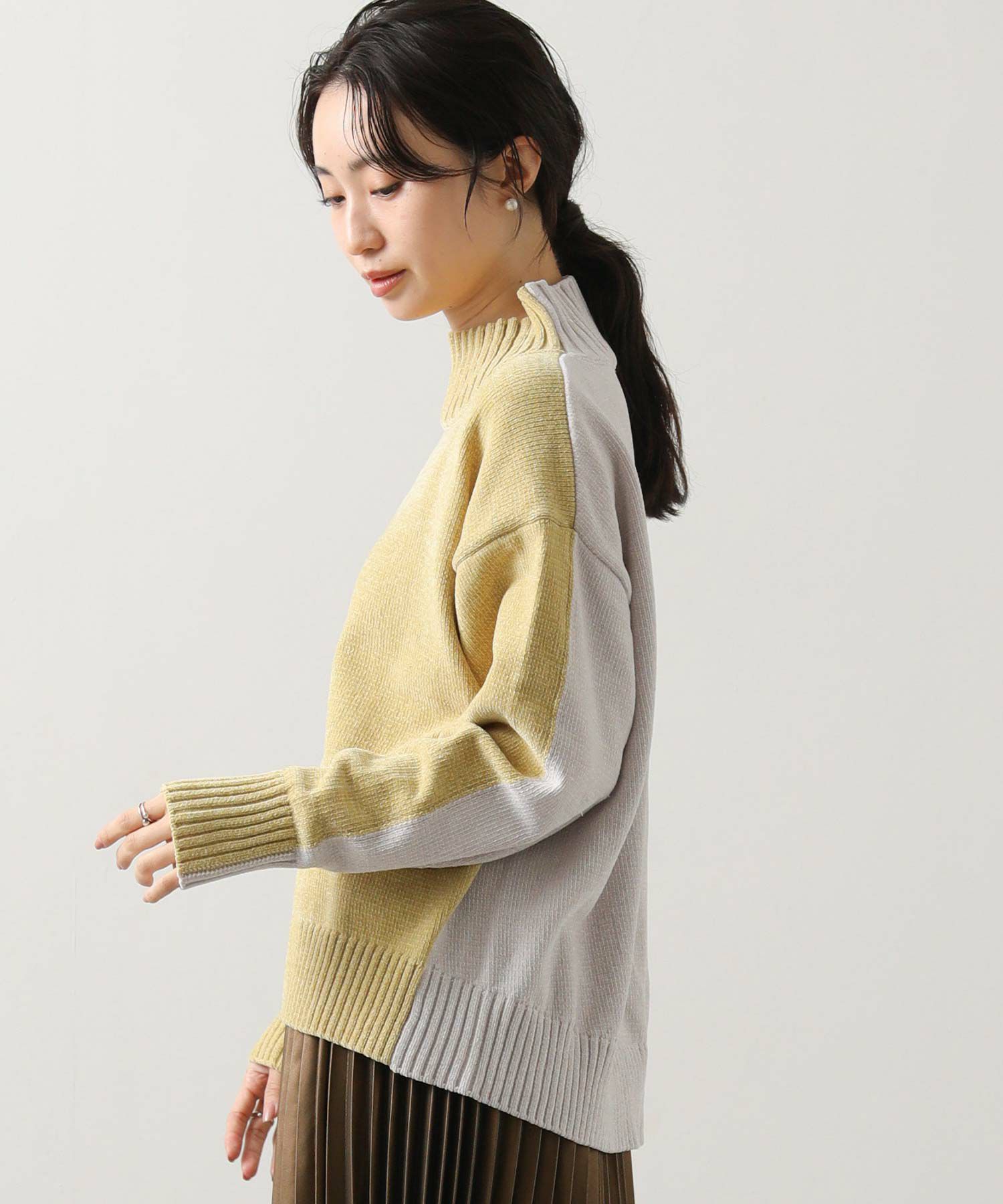 前後のバイカラーが目を惹くハイネックニット。