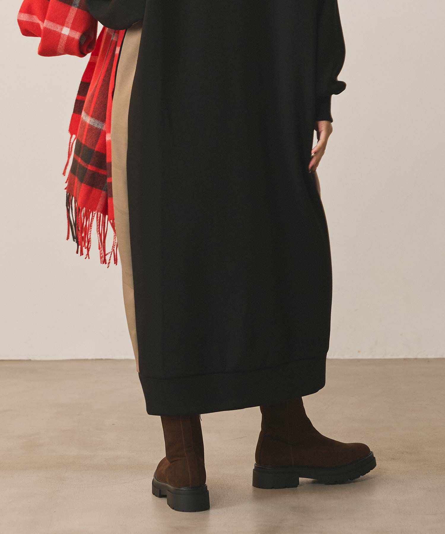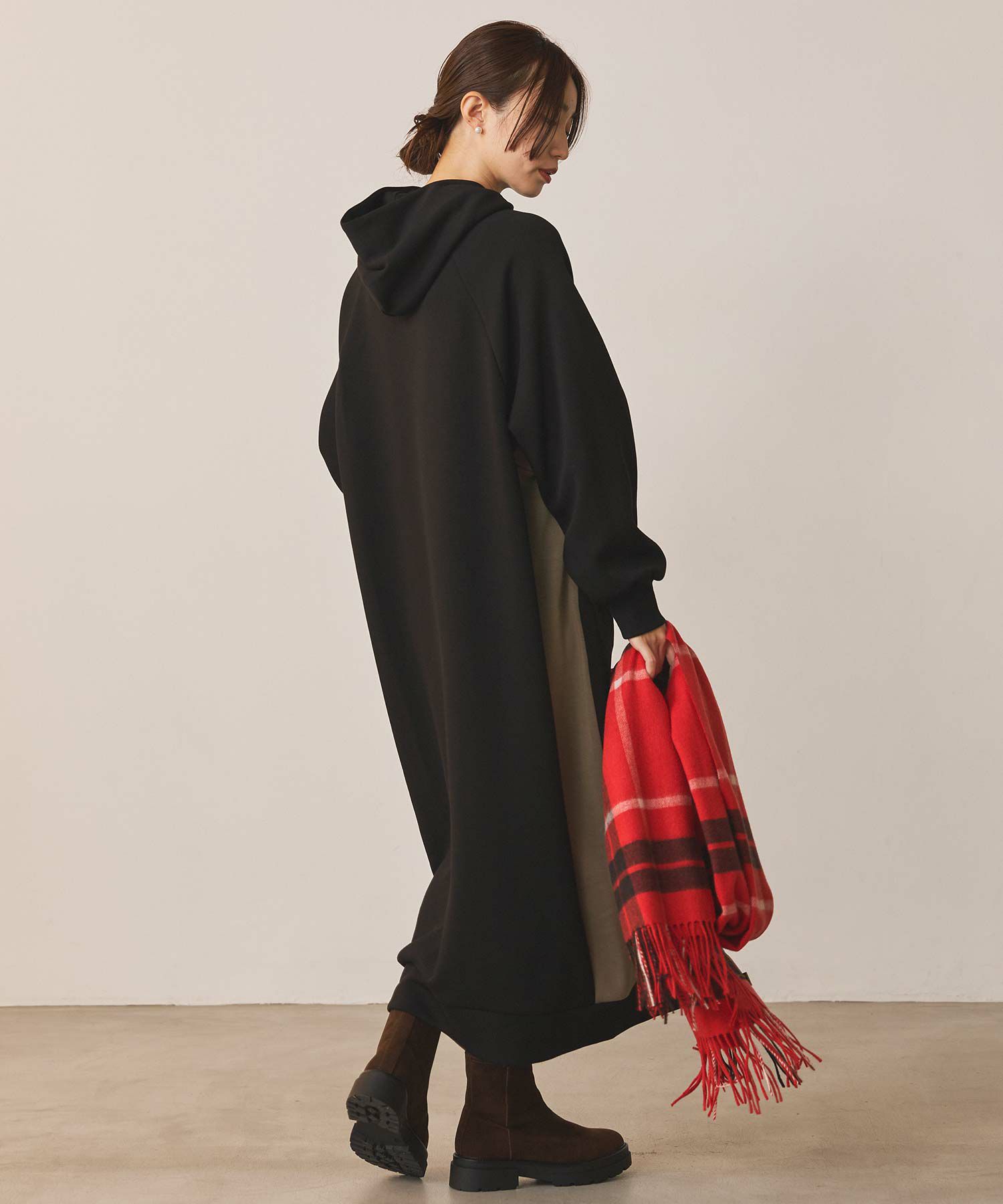 サイドラインから袖下のバイカラーがポイントのフーディワンピース。