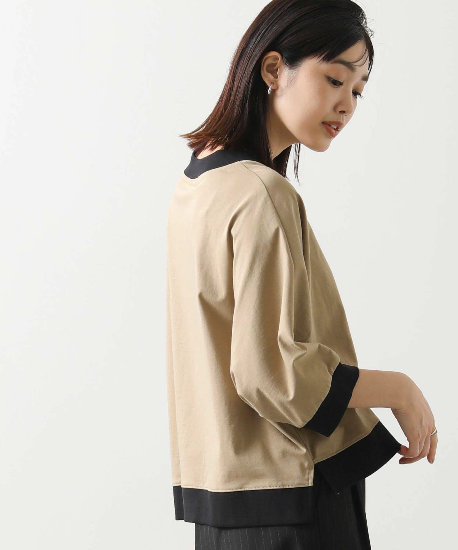 身体から離れるゆとりのあるドルマンシルエットで、気になる二の腕から肘をカバーしてくれる袖丈。