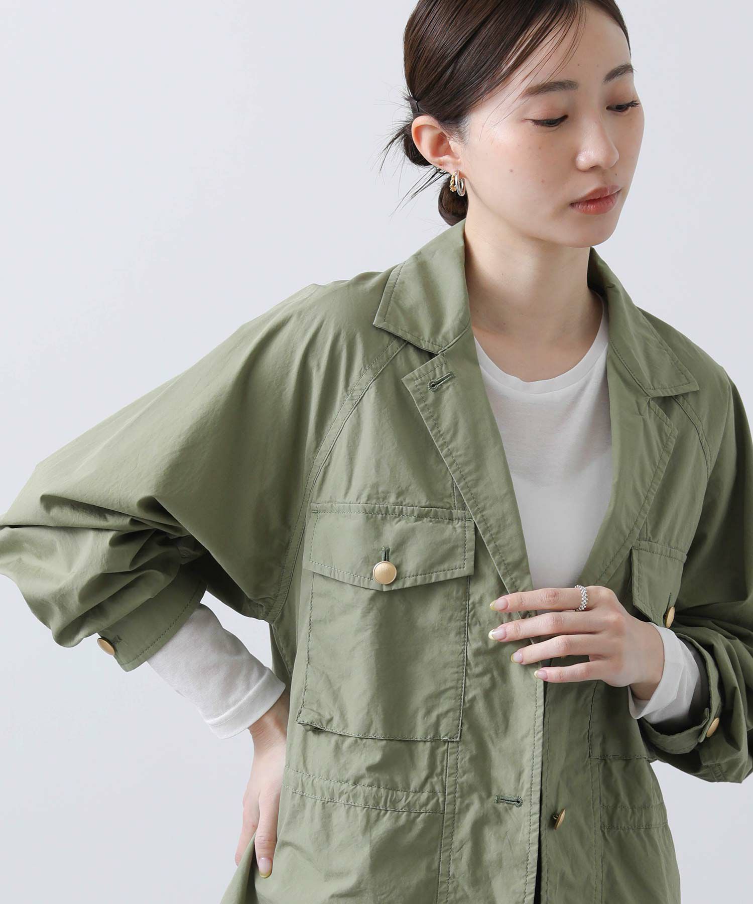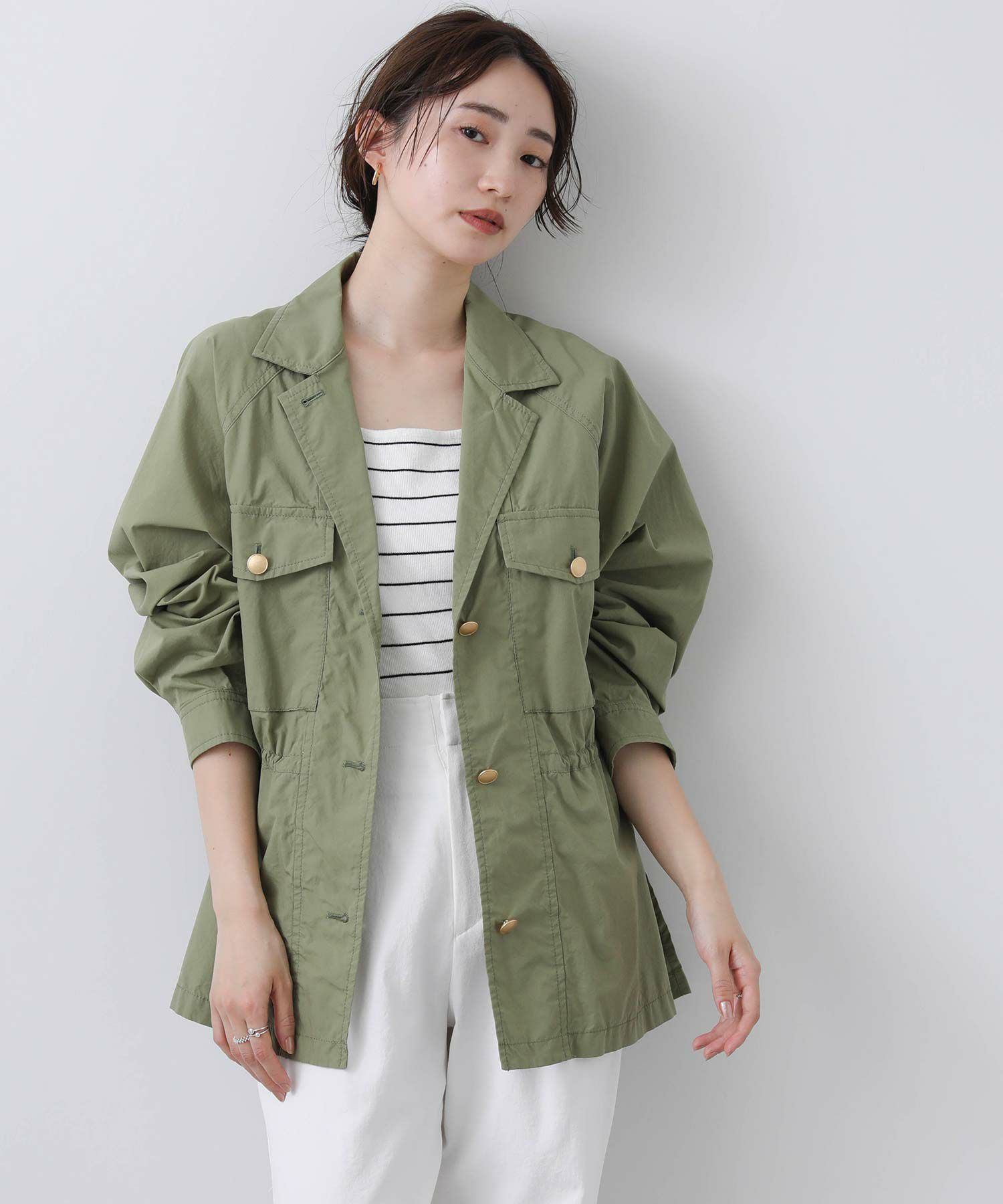 明るめのカーキと爽やかな白の2色展開で、春らしい軽やかなスタイリングが叶います。