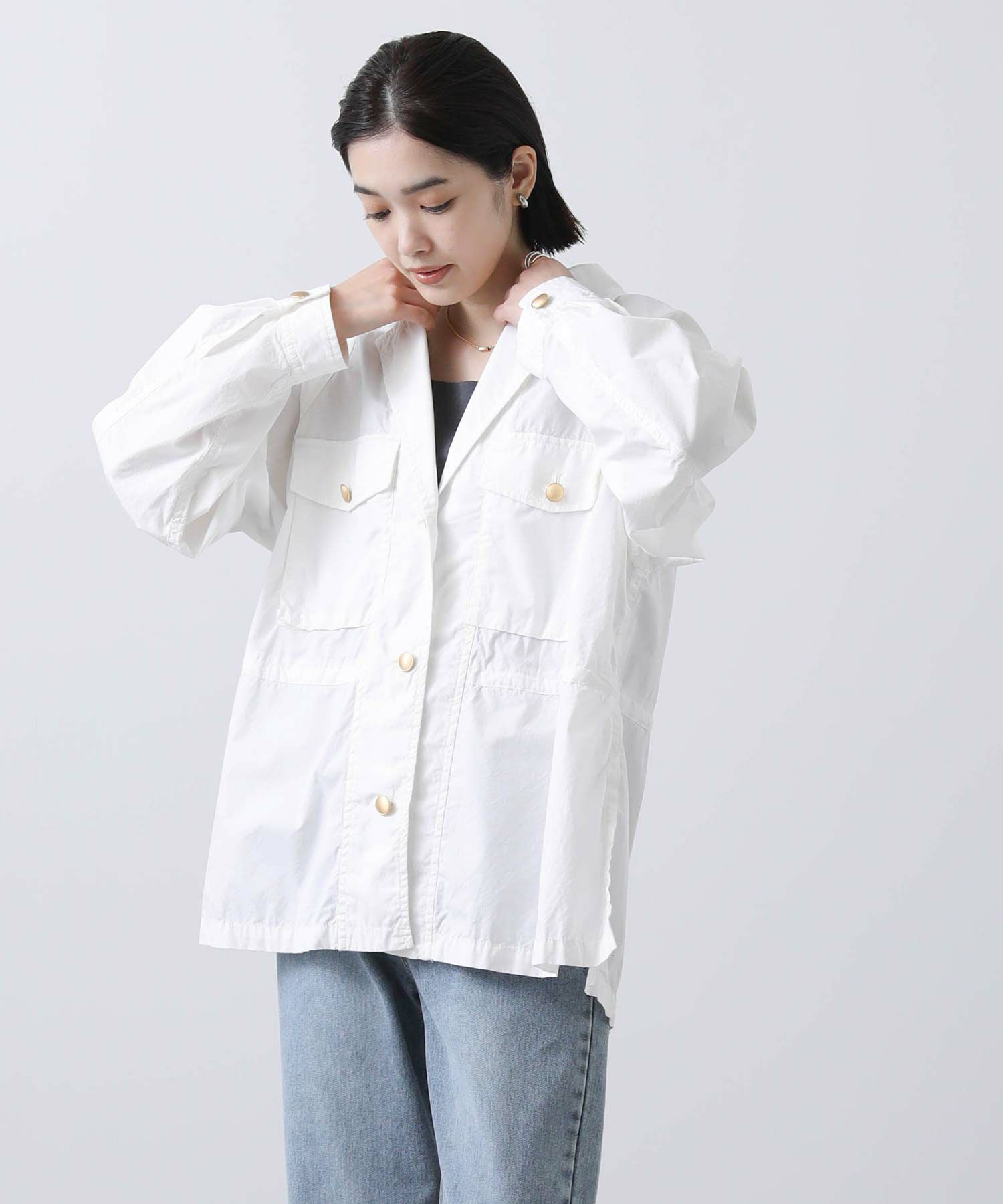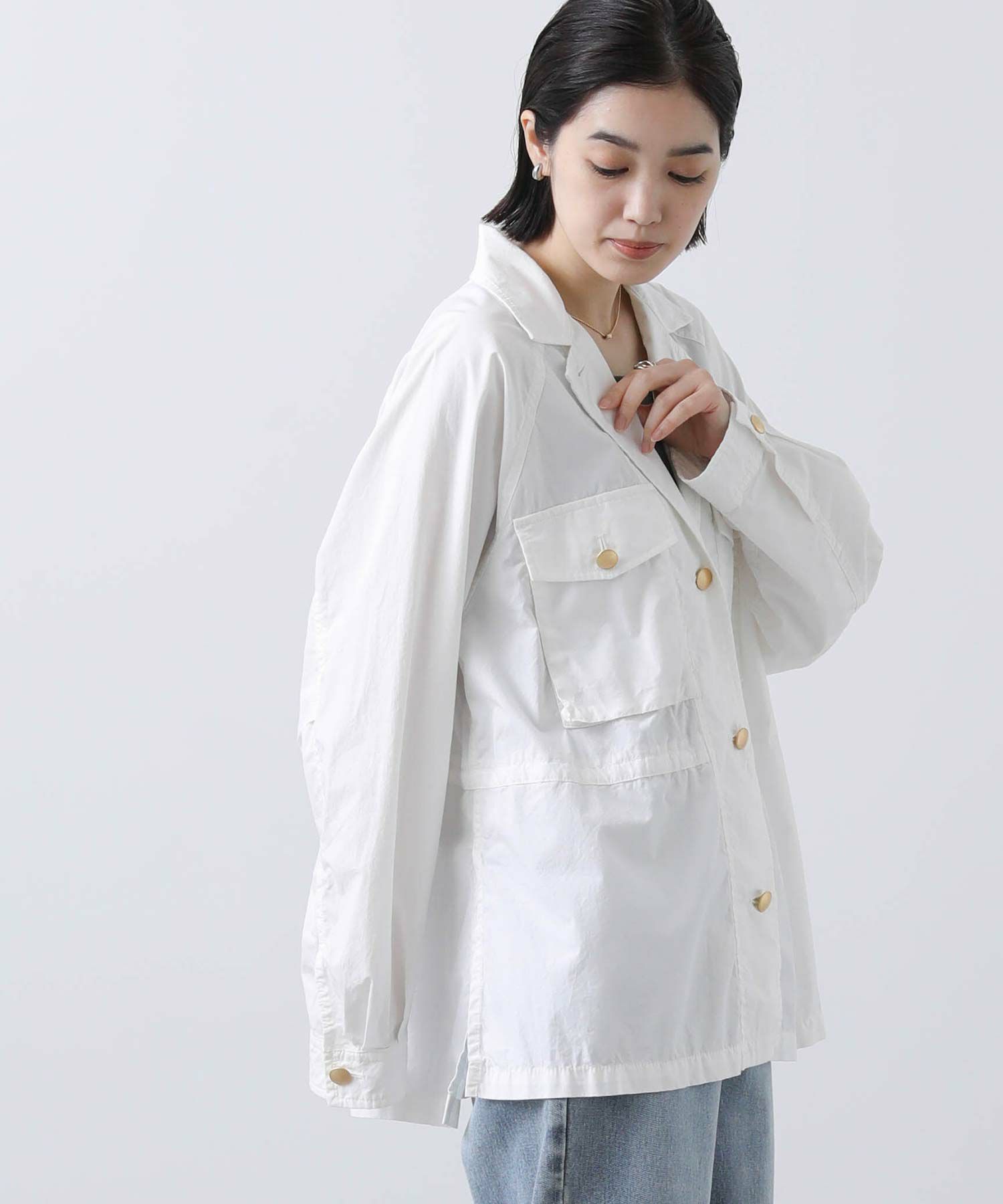 金釦がアクセントになるミリタリージャケット。