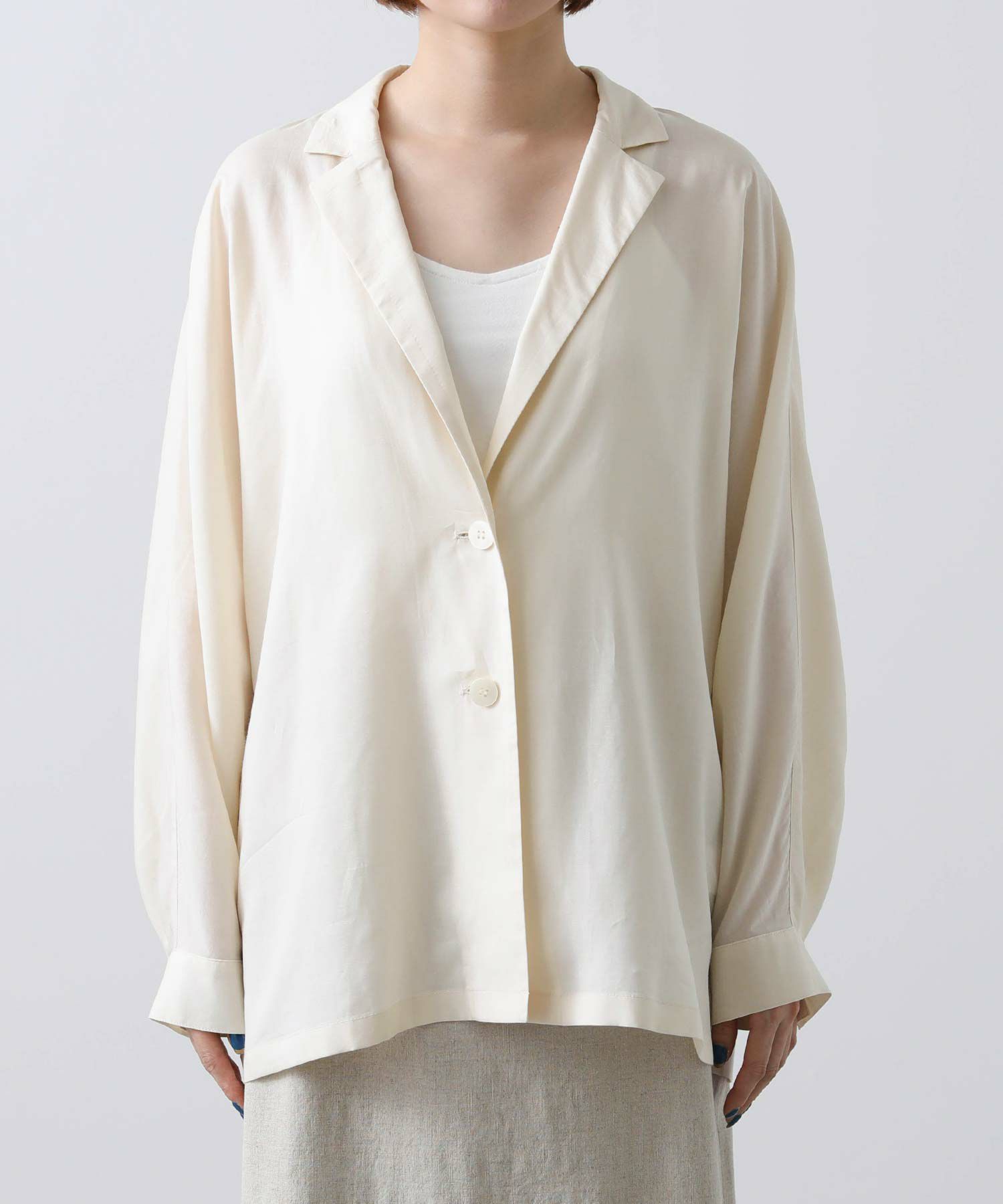 羽織としてはもちろん、今季はボトムインしてブラウスのような着こなしもおすすめです。