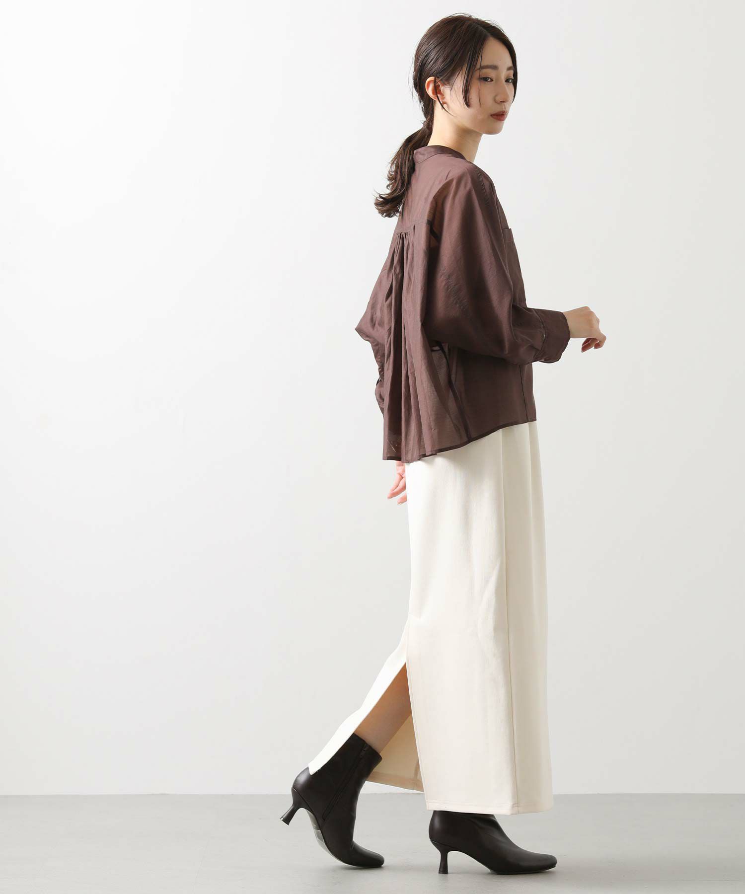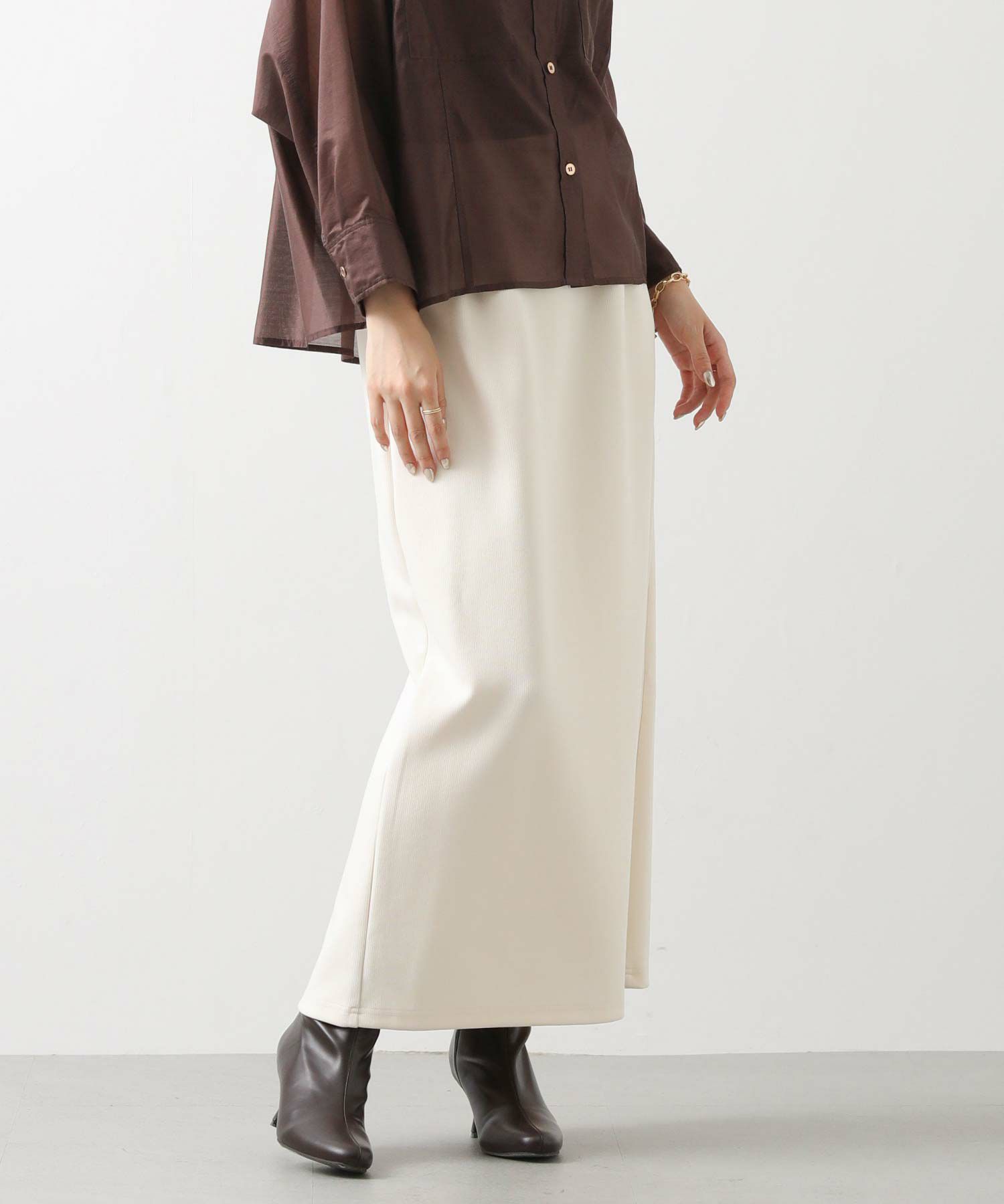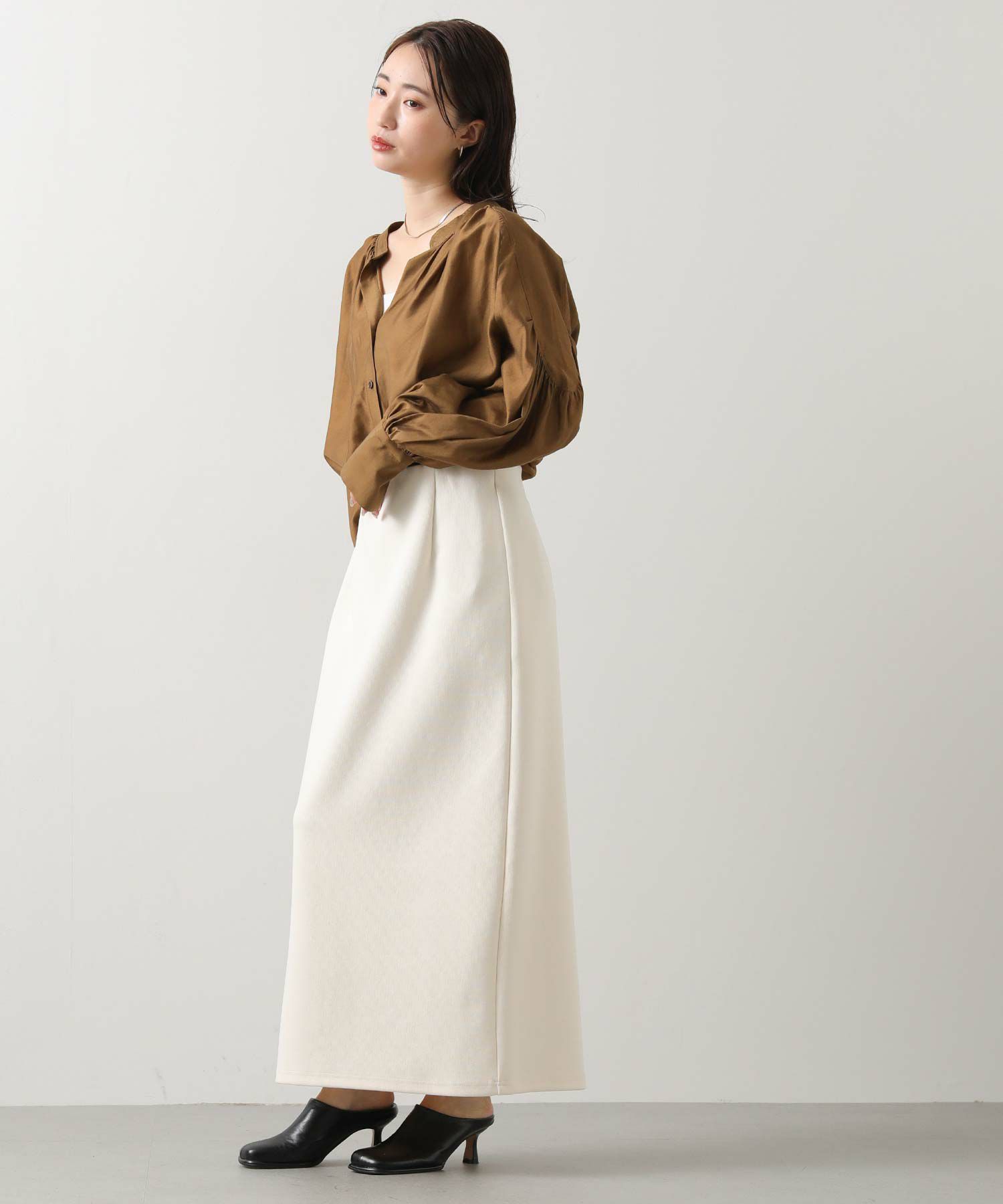 程よくフィット感のあるサイジングは、下半身をすっきり見せ、女性らしさを引き立ててくれます。