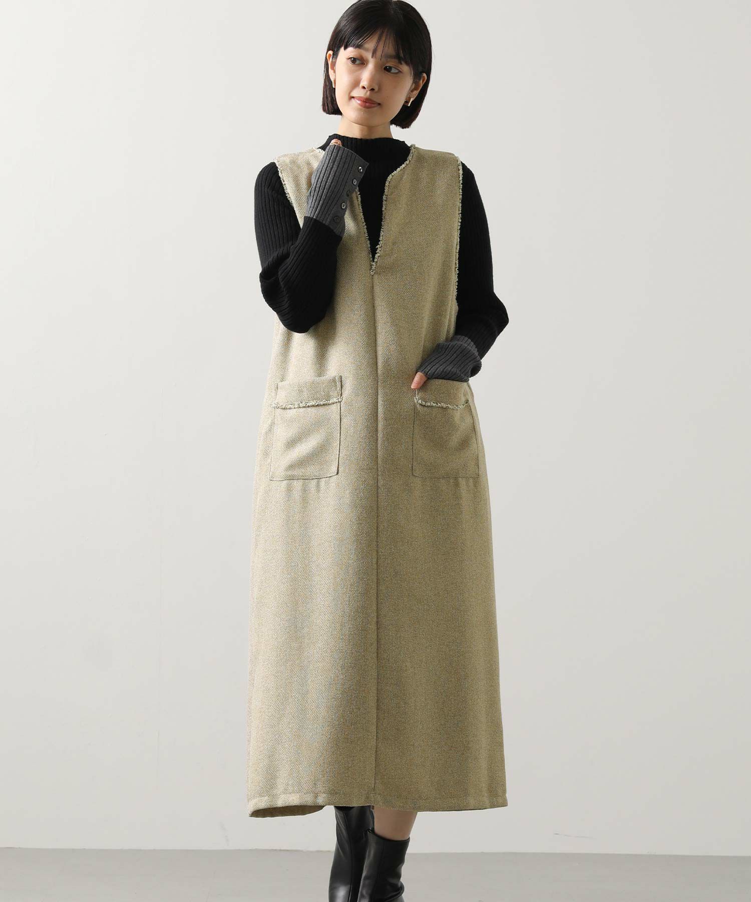 衿元とポケット口を彩る華やかなフリンジが目を惹く、ツィード調のジャンスカ。