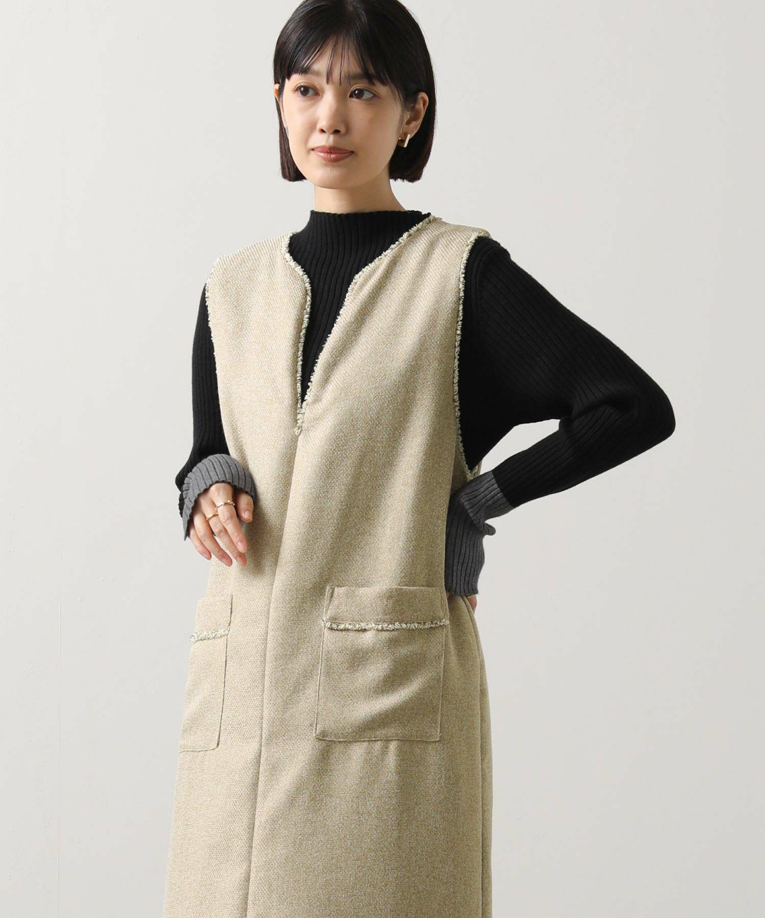 ブラウスやニットなどとレイヤードしやすい大きめアームホールにしています。