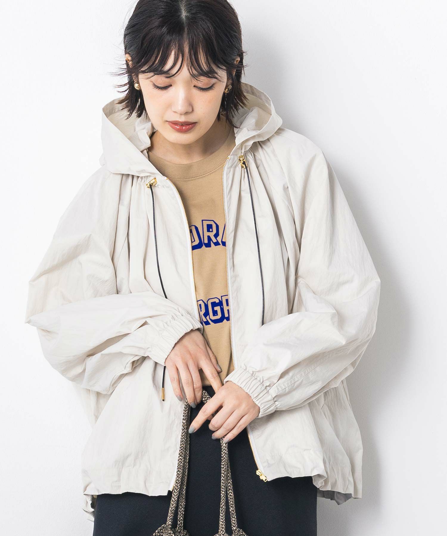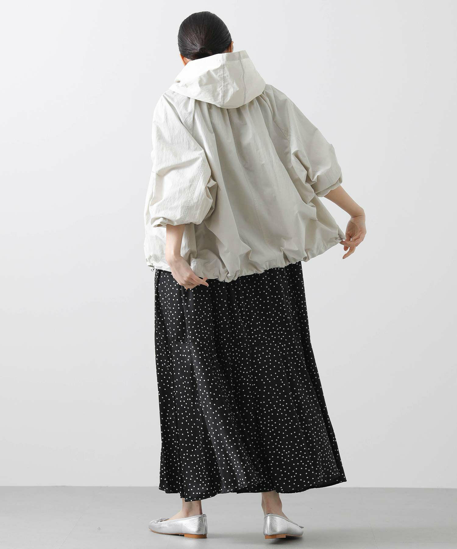 ギャザ-たっぷりの丸みのあるフォルムがかわいく、裾のドロストコードを絞ることで、ころんとしたシルエットに。