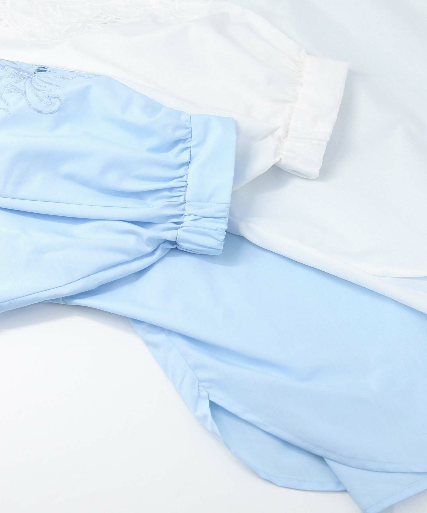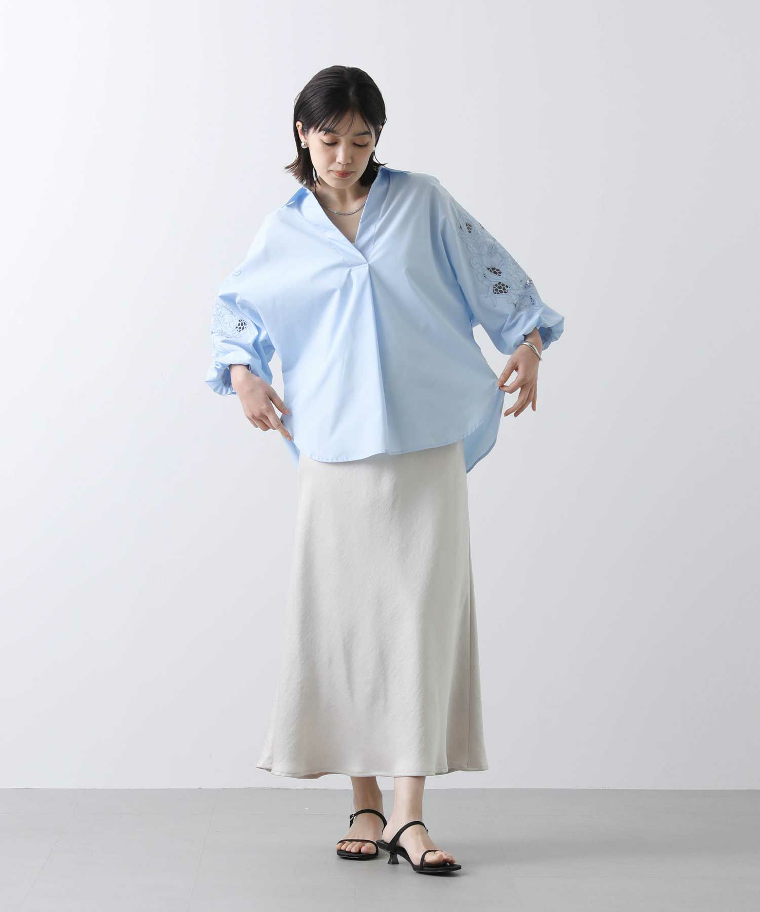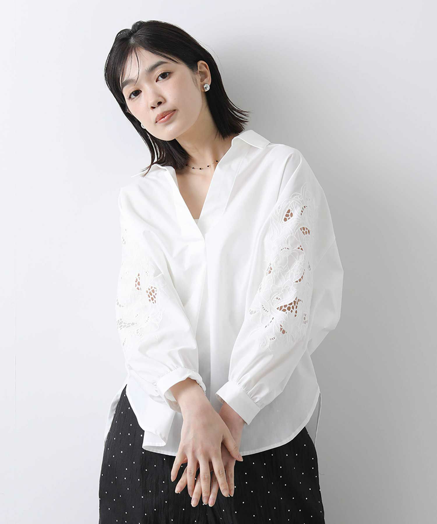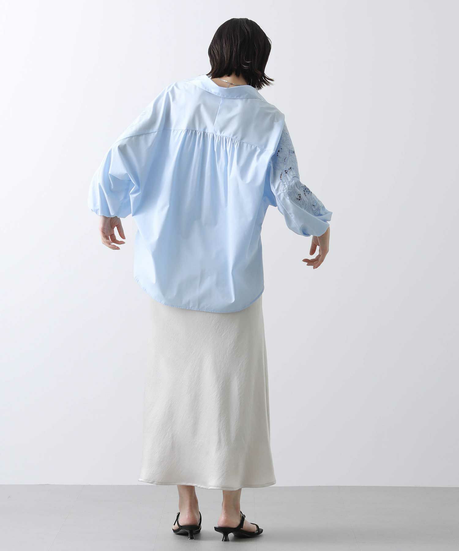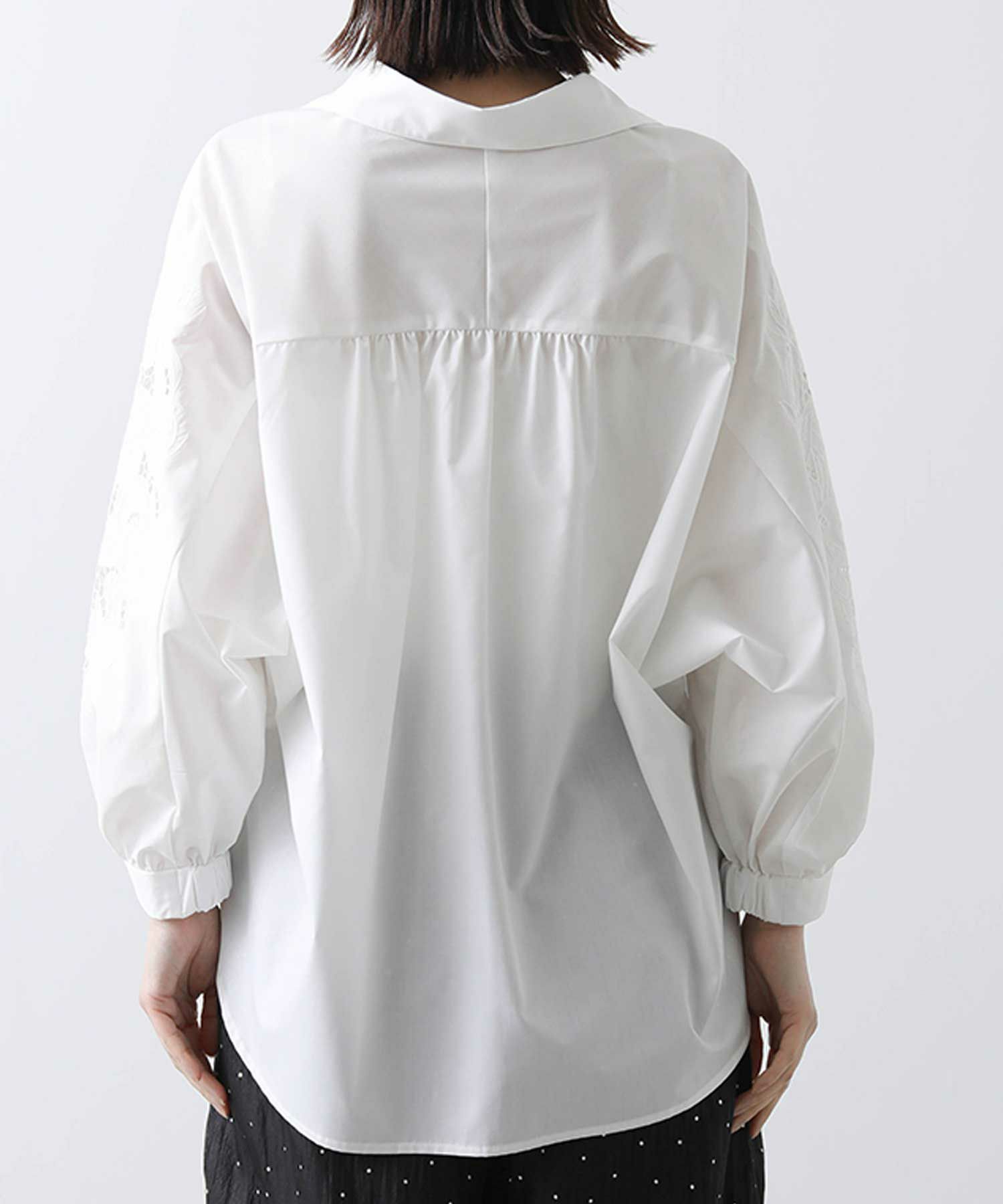 大胆な袖の刺繍が目を惹くエレガントなシャツブラウス。