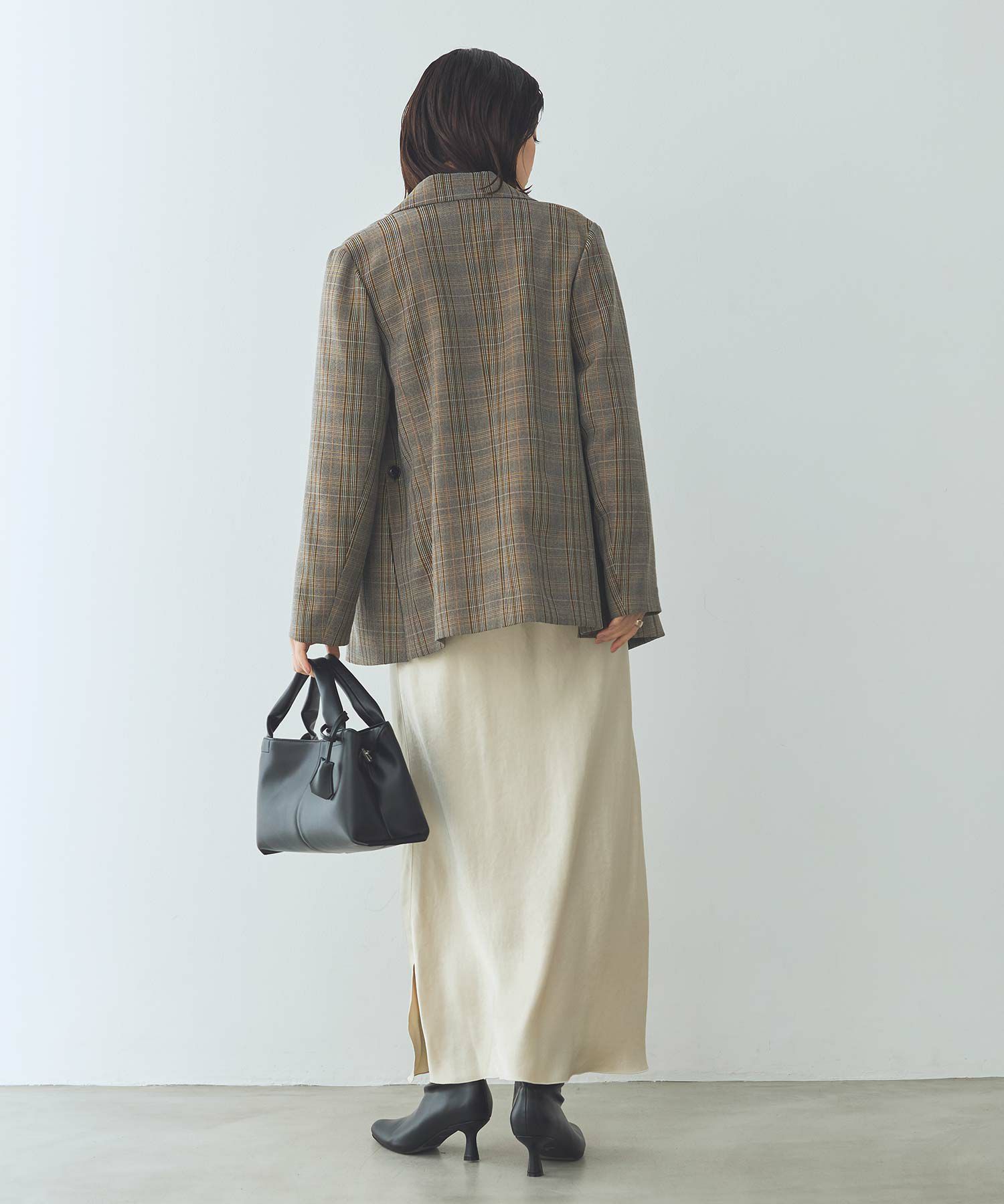トラッドな印象ながら、ボクシーなシルエットやサイドのスリットで抜け感を演出。落ち着いたトーンと馴染みが良い柄で、着やすいチェックに。