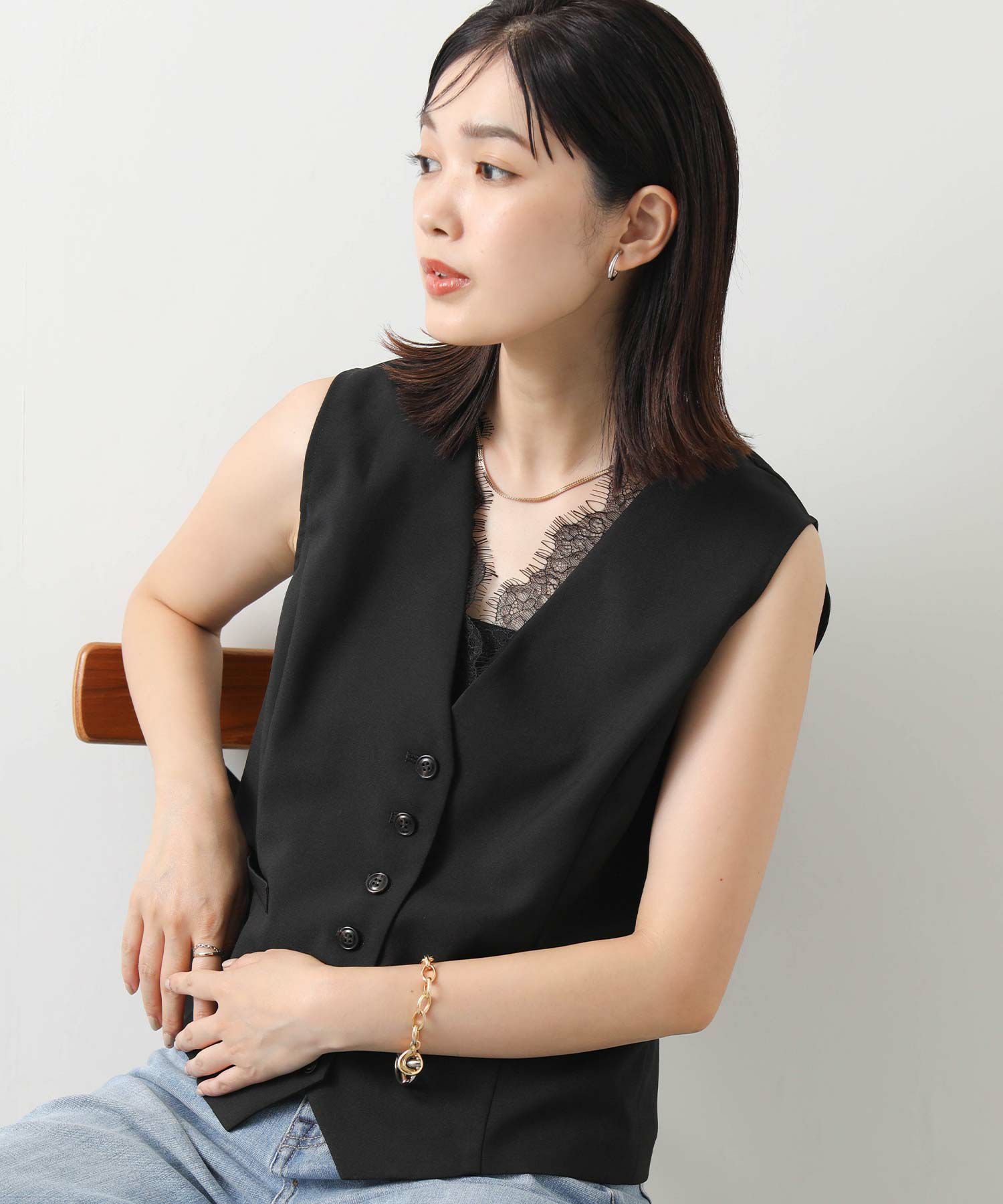 衿元からレースを覗かせる、レースカシュクールジレ(KO301414002)とのレイヤードスタイルがオススメ。