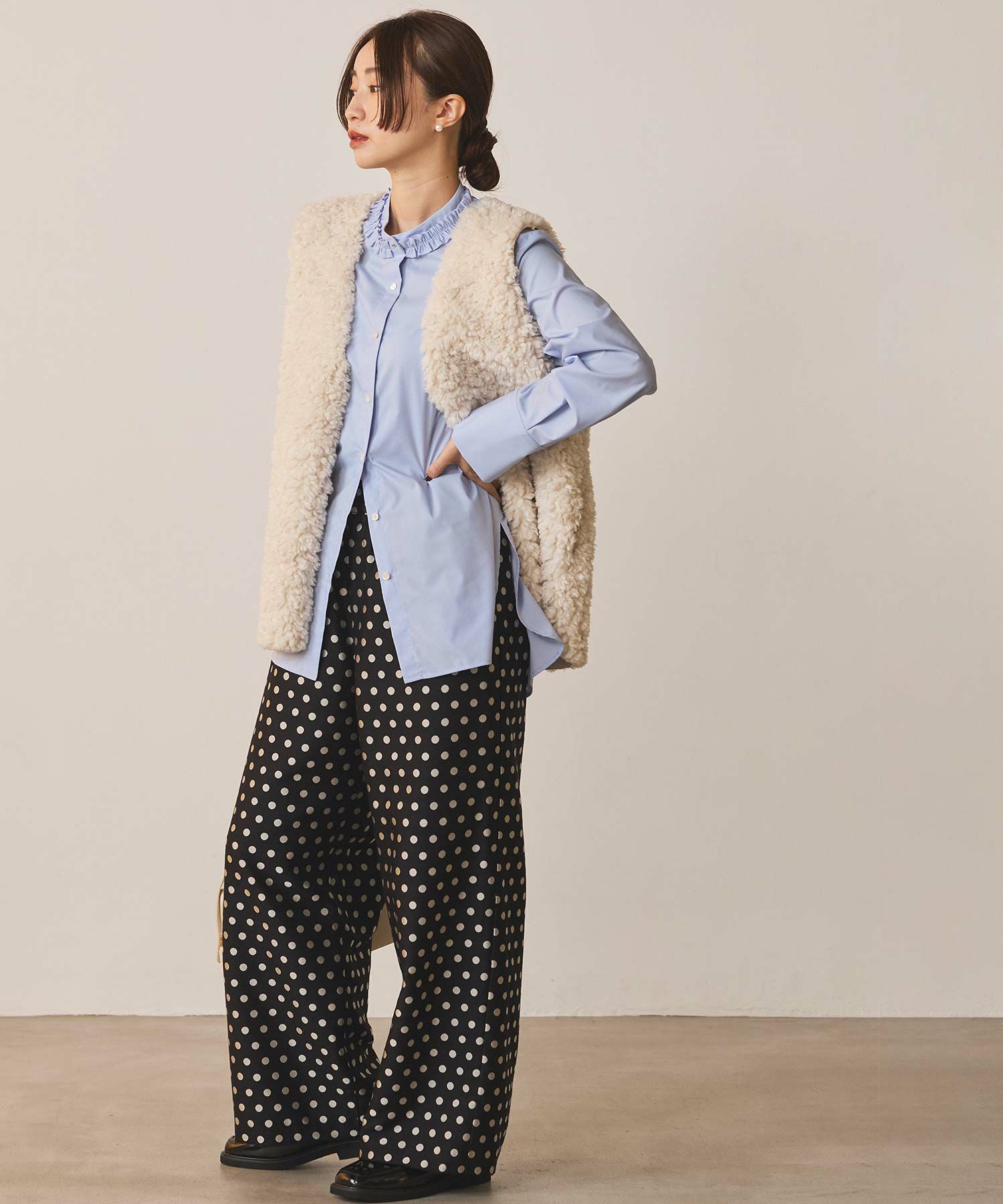 光沢感のある生地感が上品で、艶があるので毛足のあるニットなど冬の装いにピッタリ。程よいワイドシルエットで、ウエストはゴムなので見た目きちんとでイージーな履き心地が魅力です。