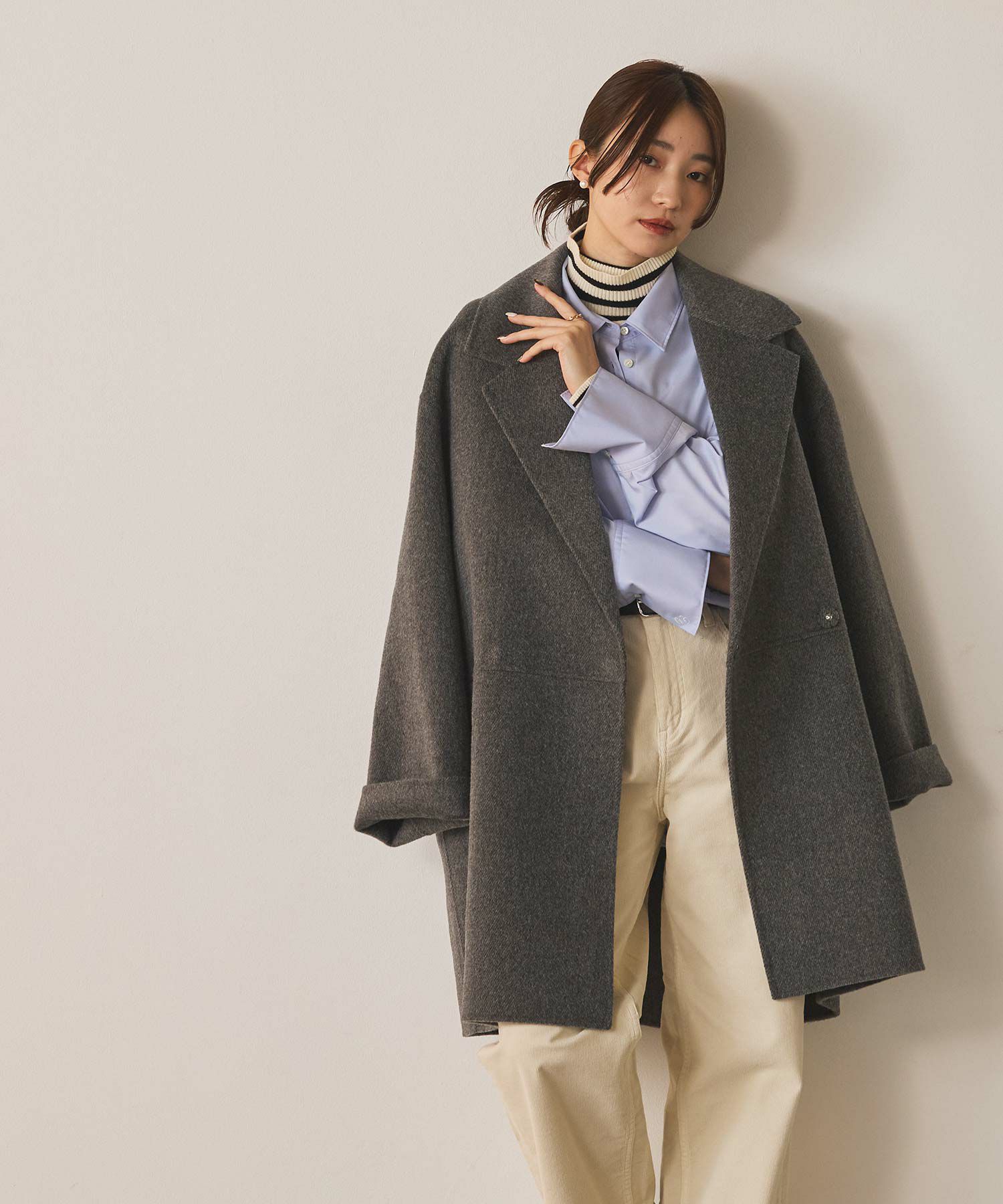 テーラーの大襟が新鮮で女性らしさのあるハーフコート。