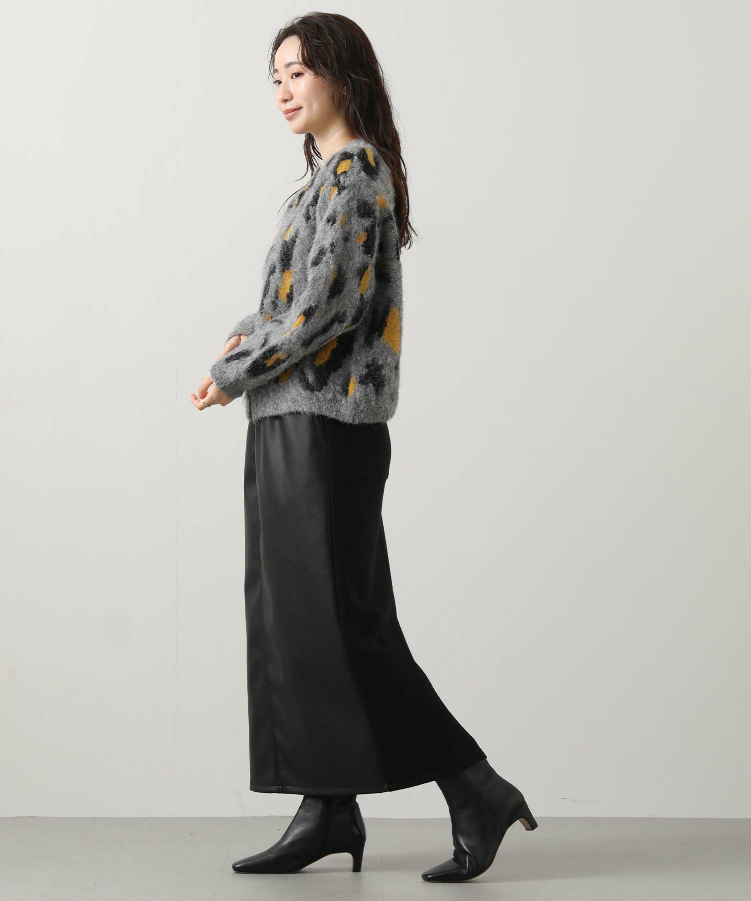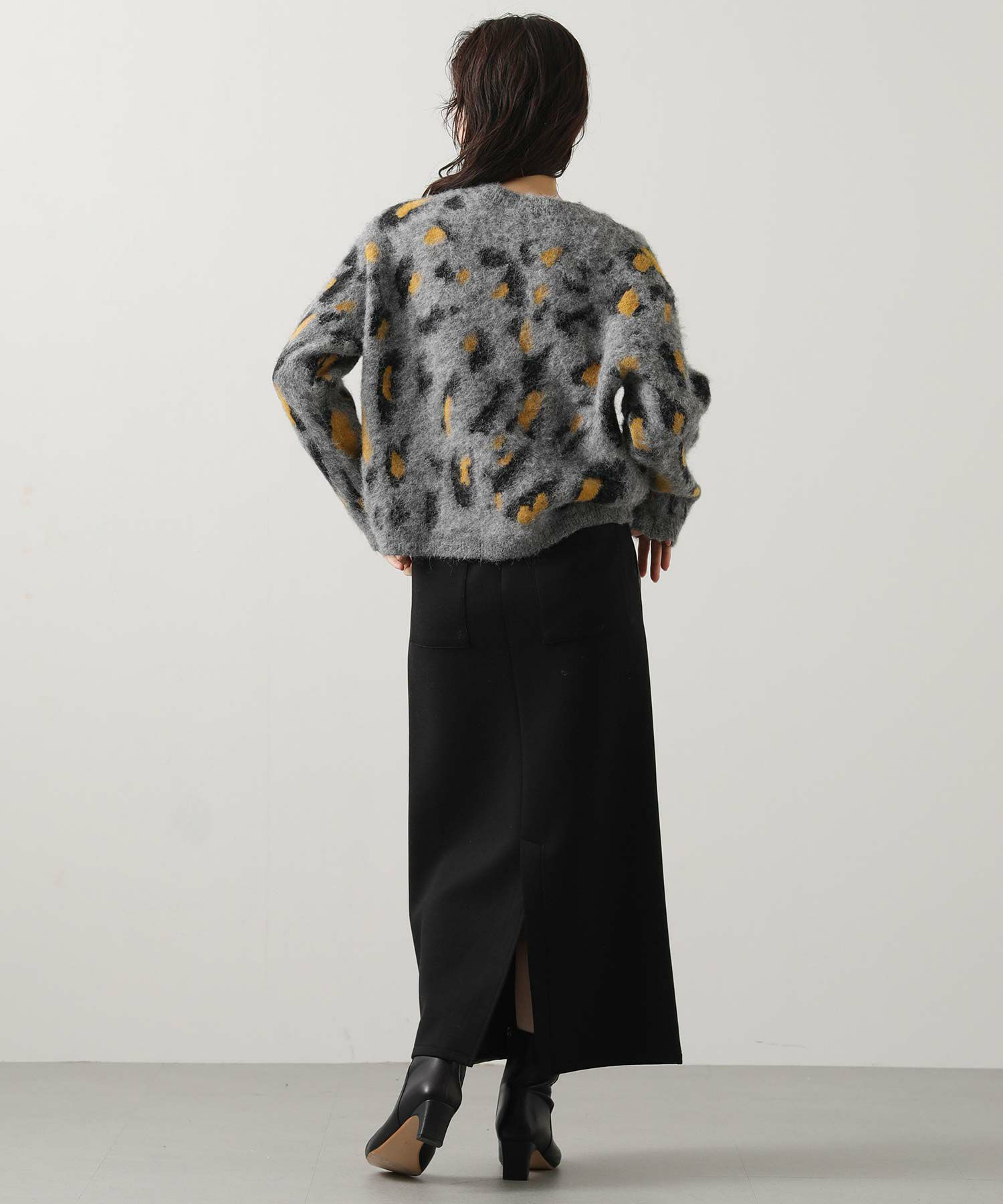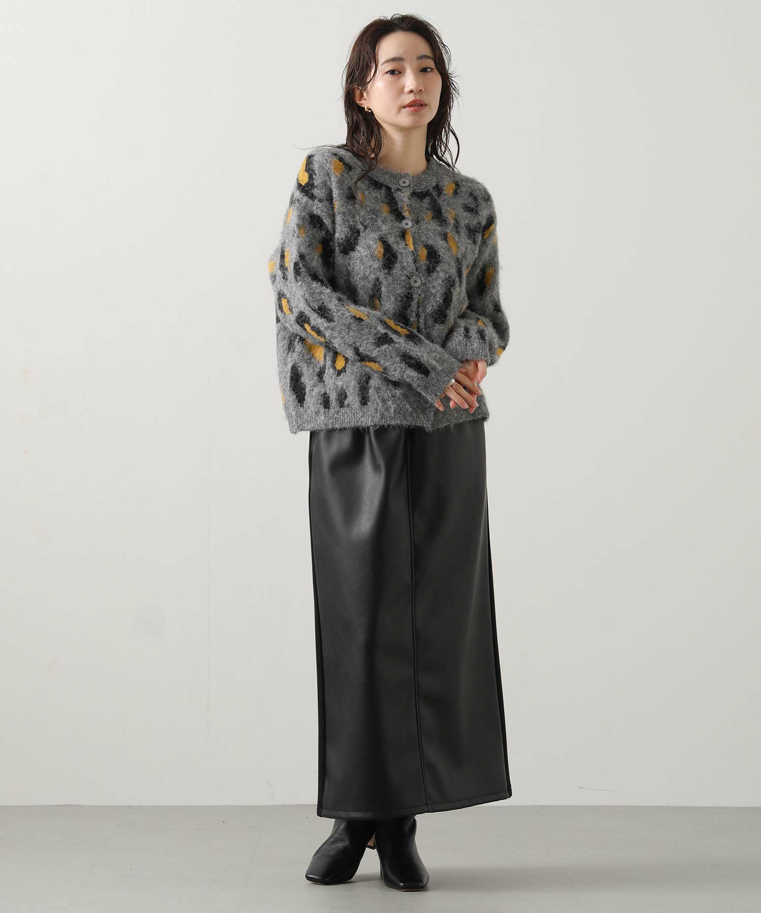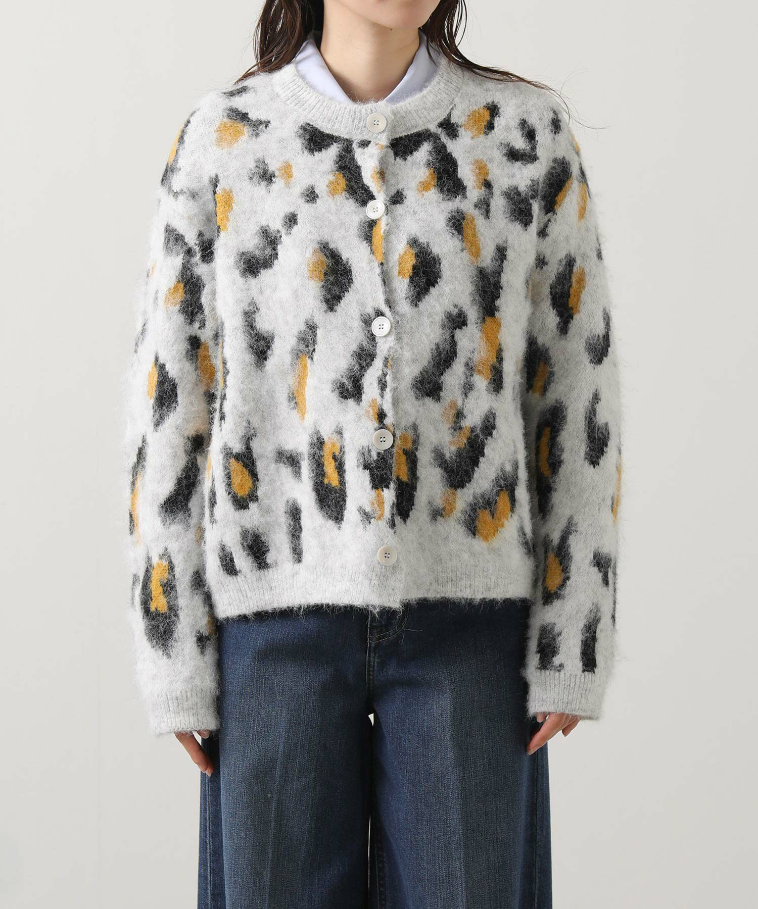柔らかな起毛感のあるニット素材に、レオパード柄を散りばめたニットカーディガン。