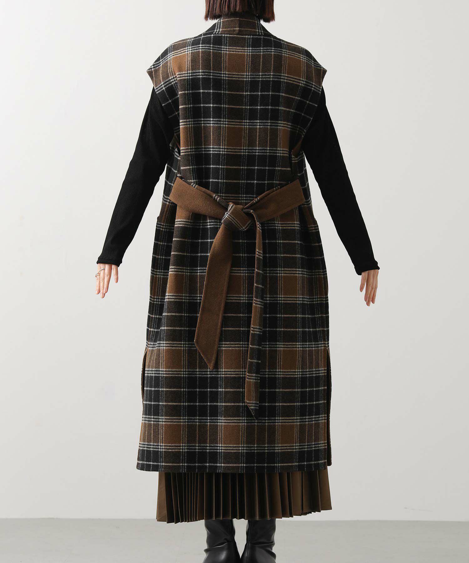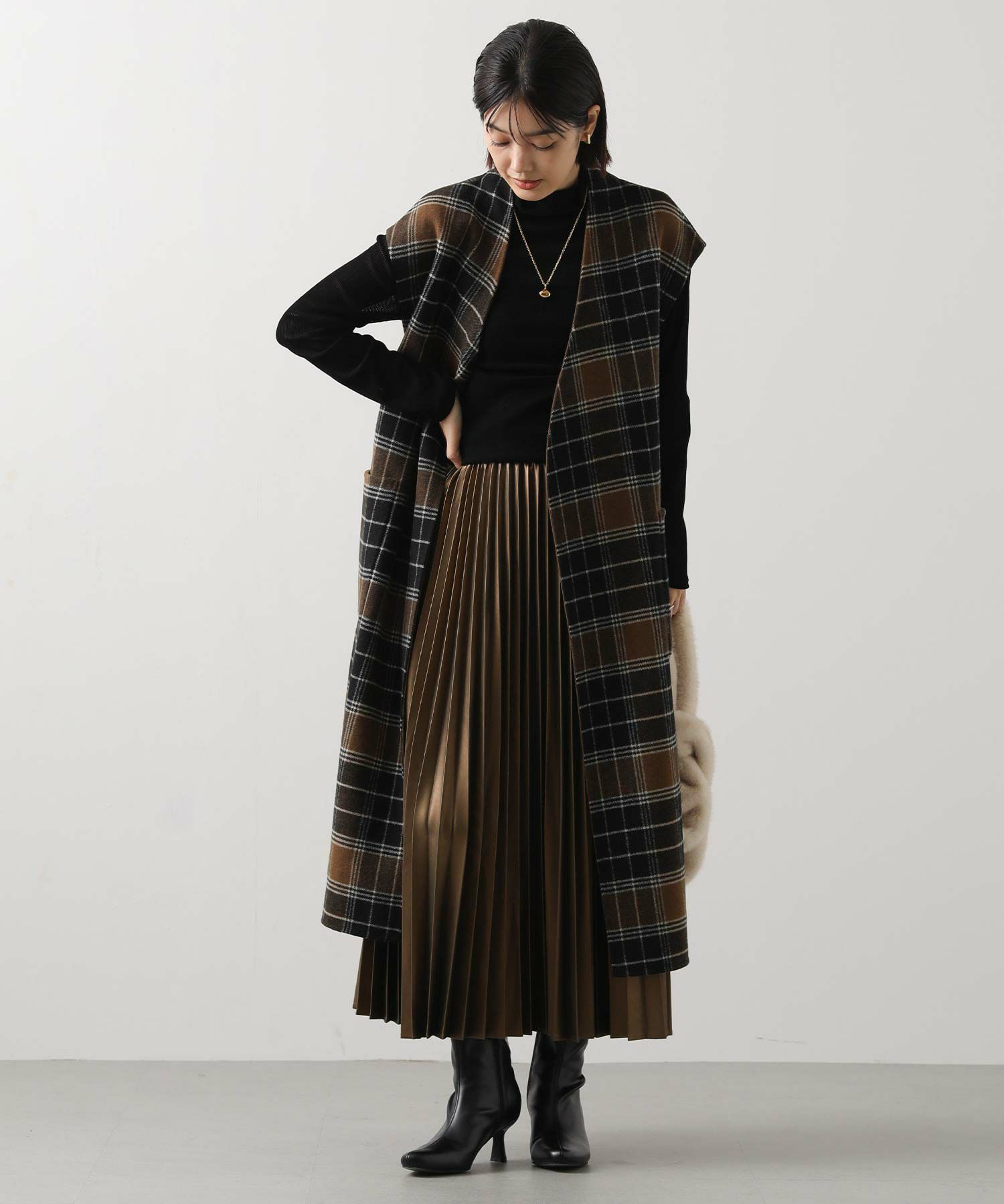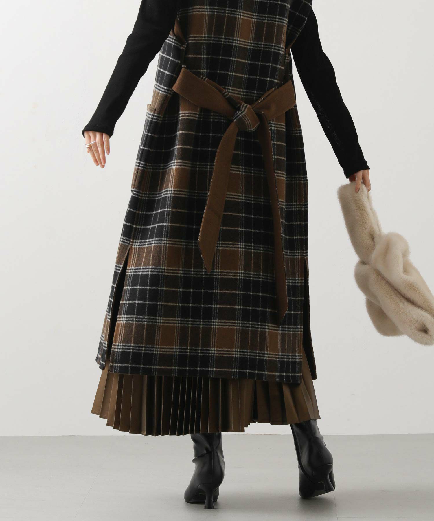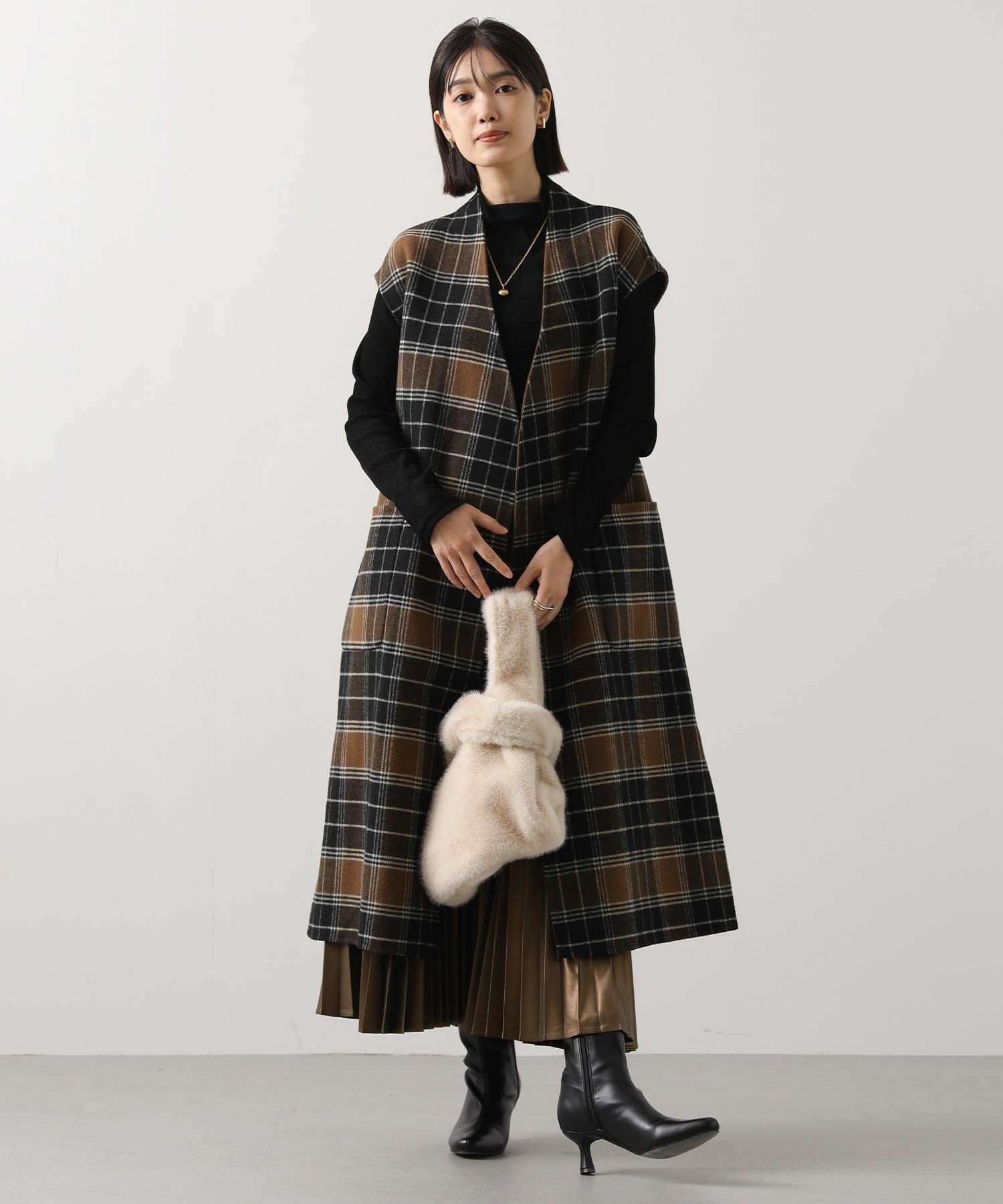 リバーシブルで着用でき、スタイリングに合わせて無地のジレで上品に、チェックのジレで華やかに着用できます。