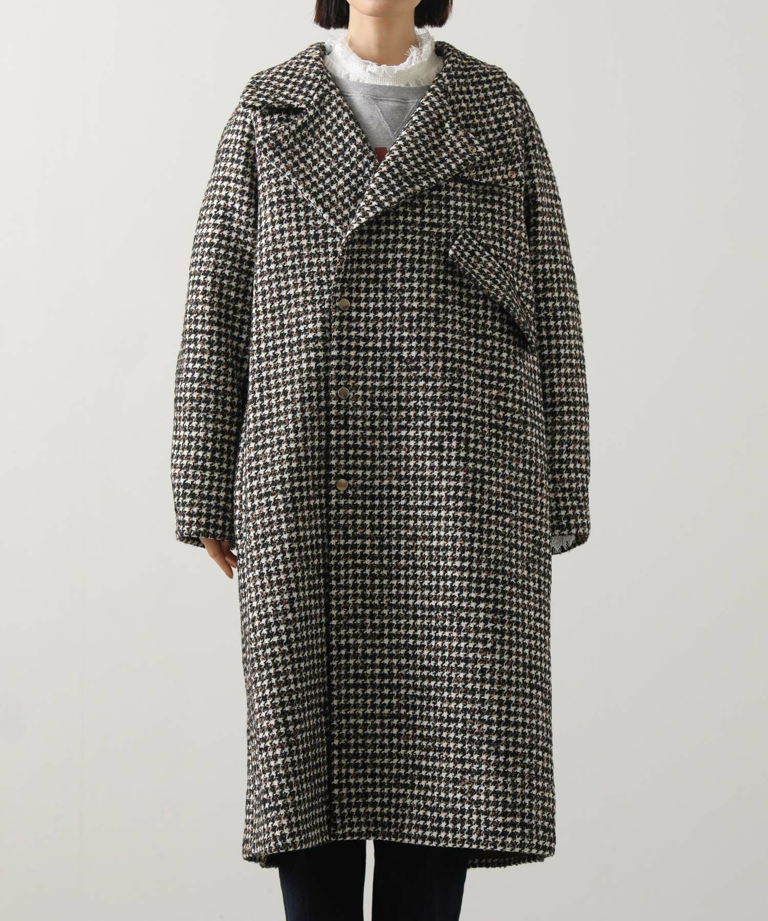 【LalliaMù(ラリア・ムー)】から、冬のスタイルに華やかさをプラスする、千鳥格子柄のロングコートをセレクト。