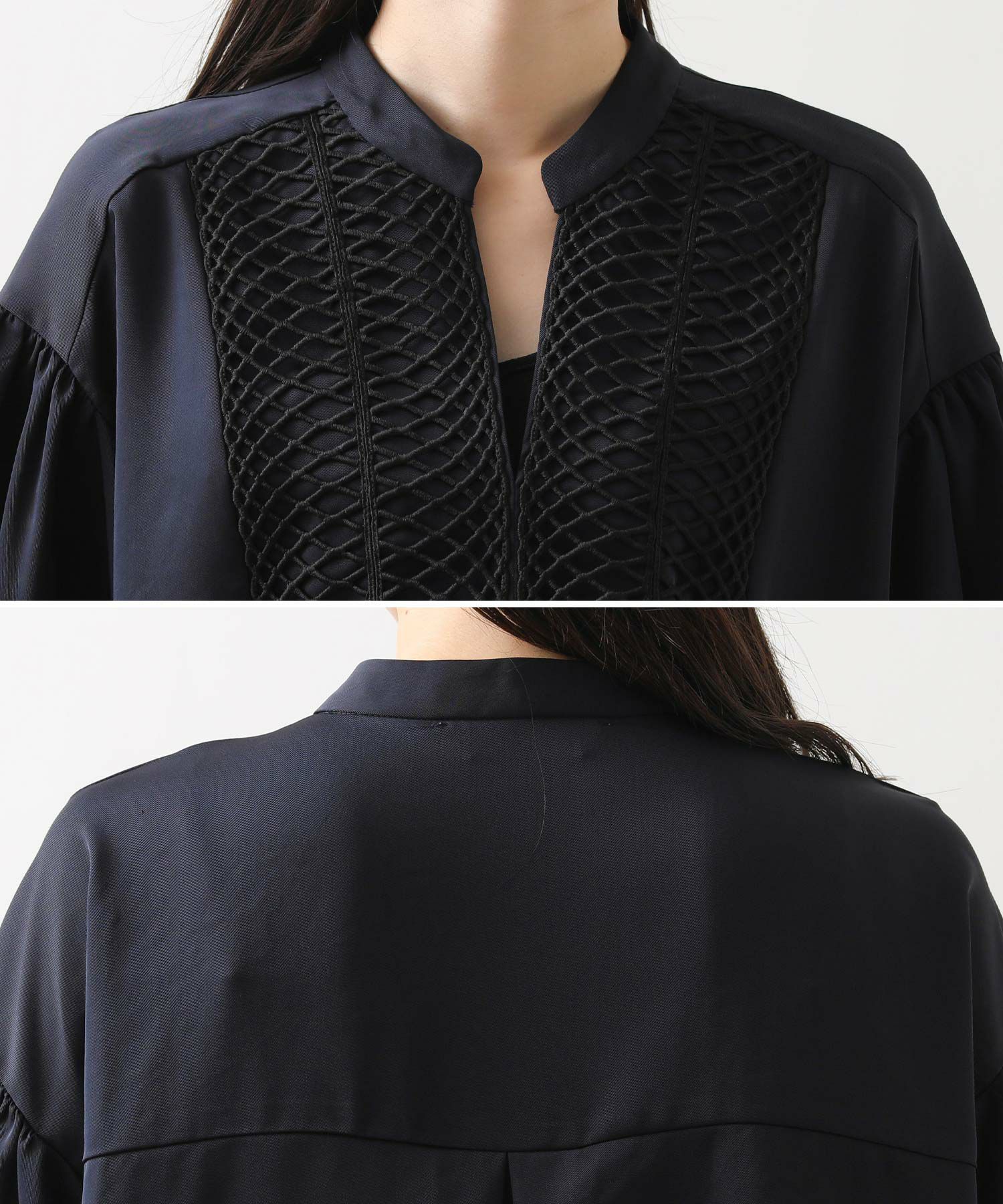 胸元のヨーク切り替えにあしらった立体コードレースがポイント。