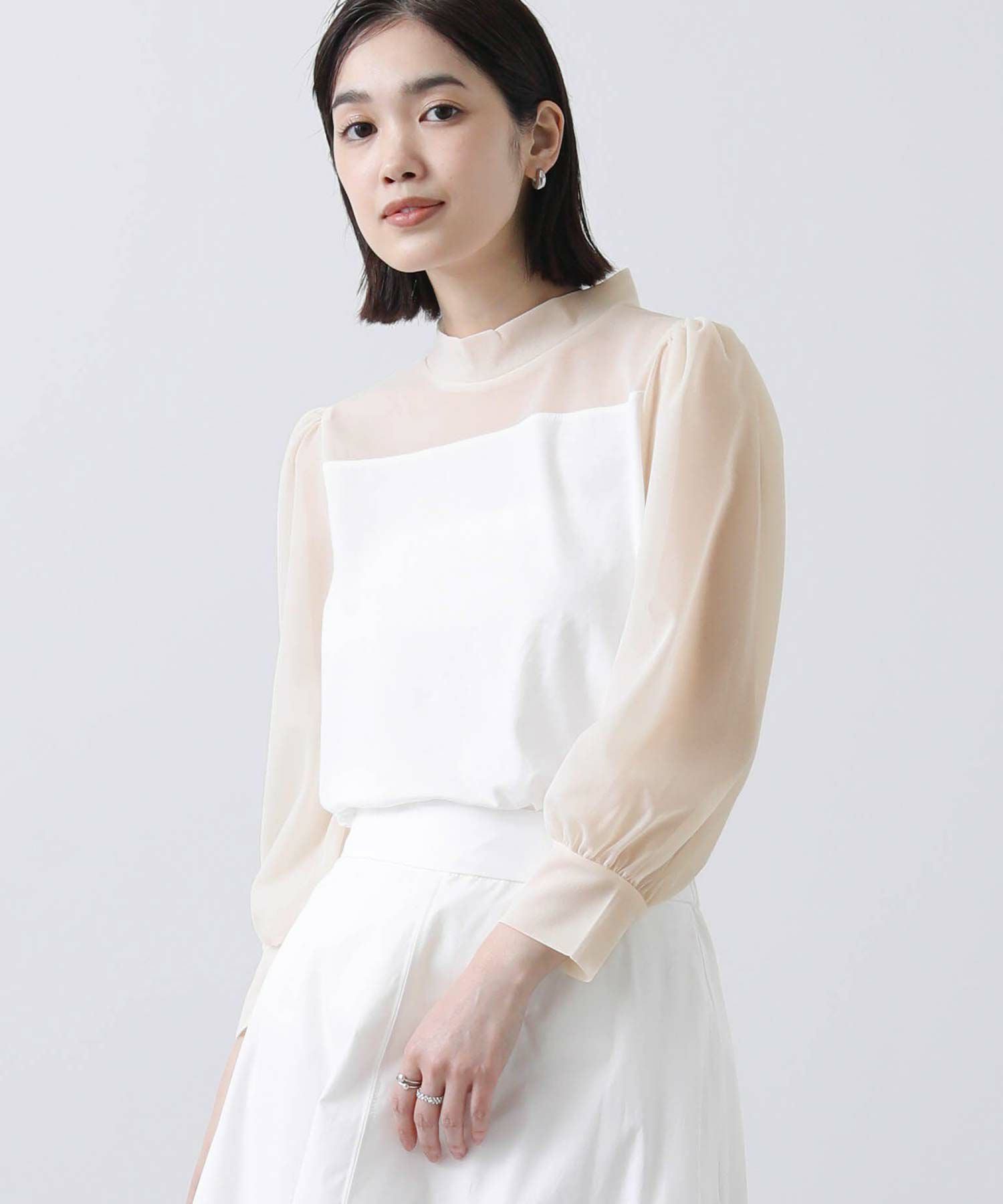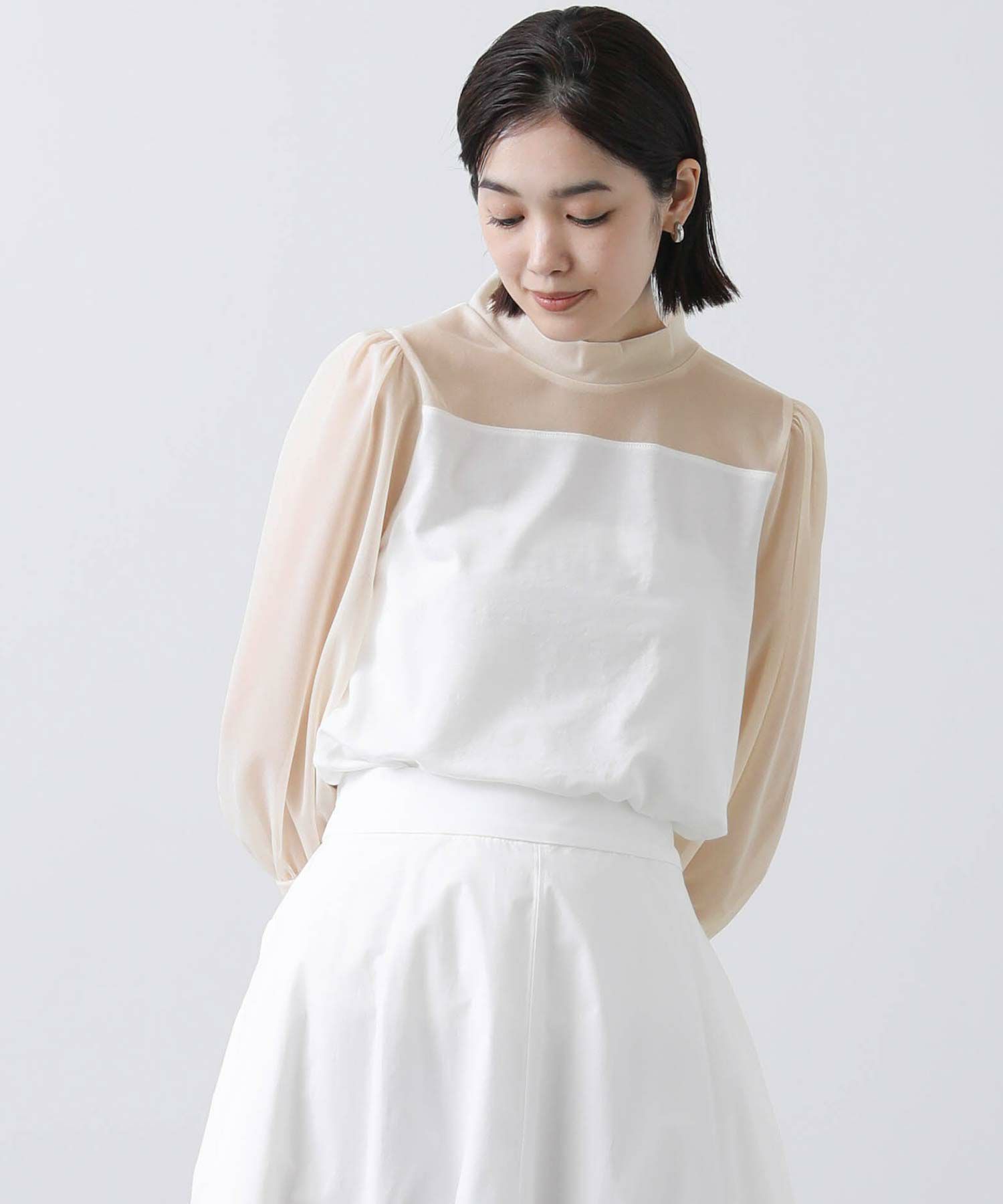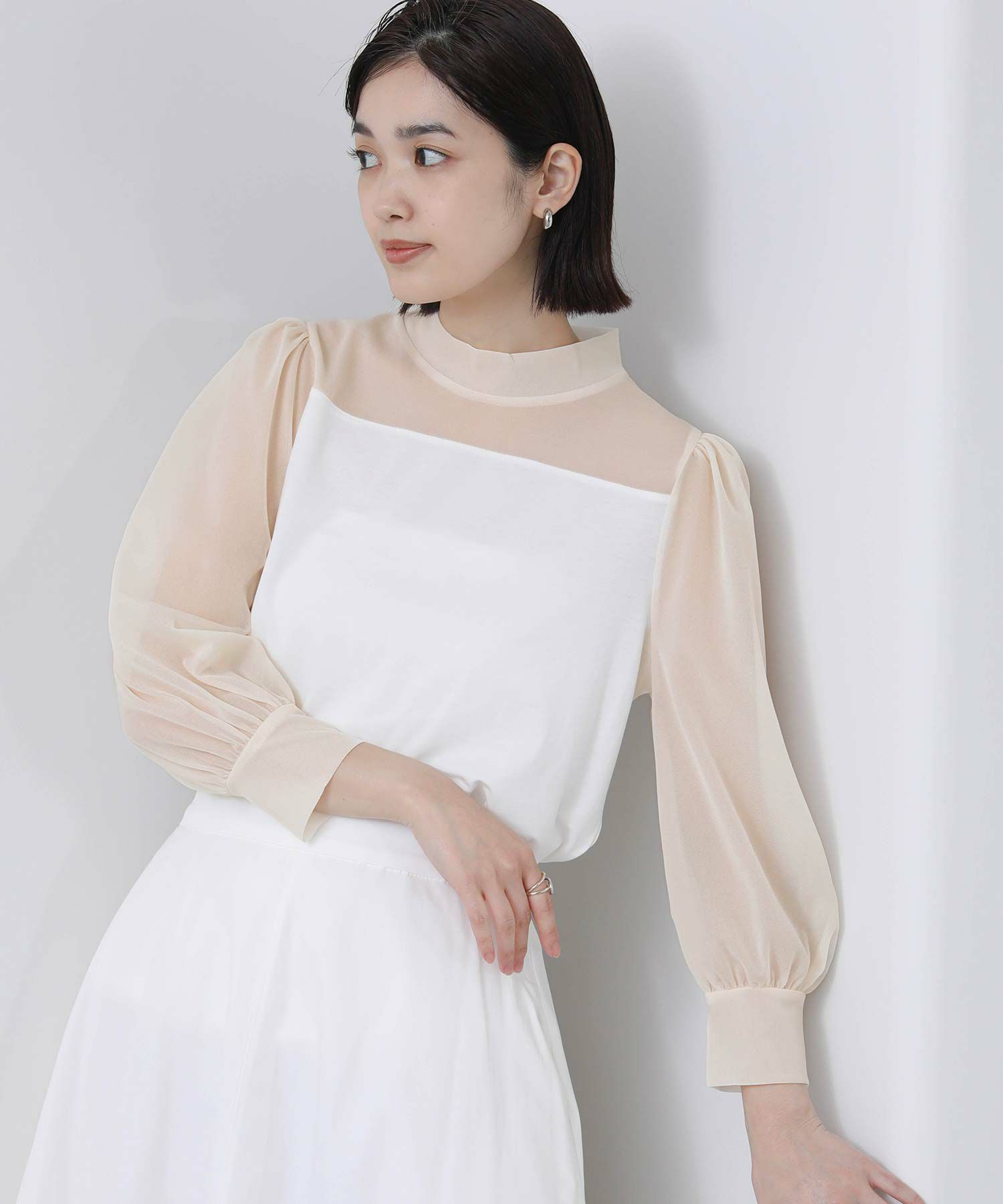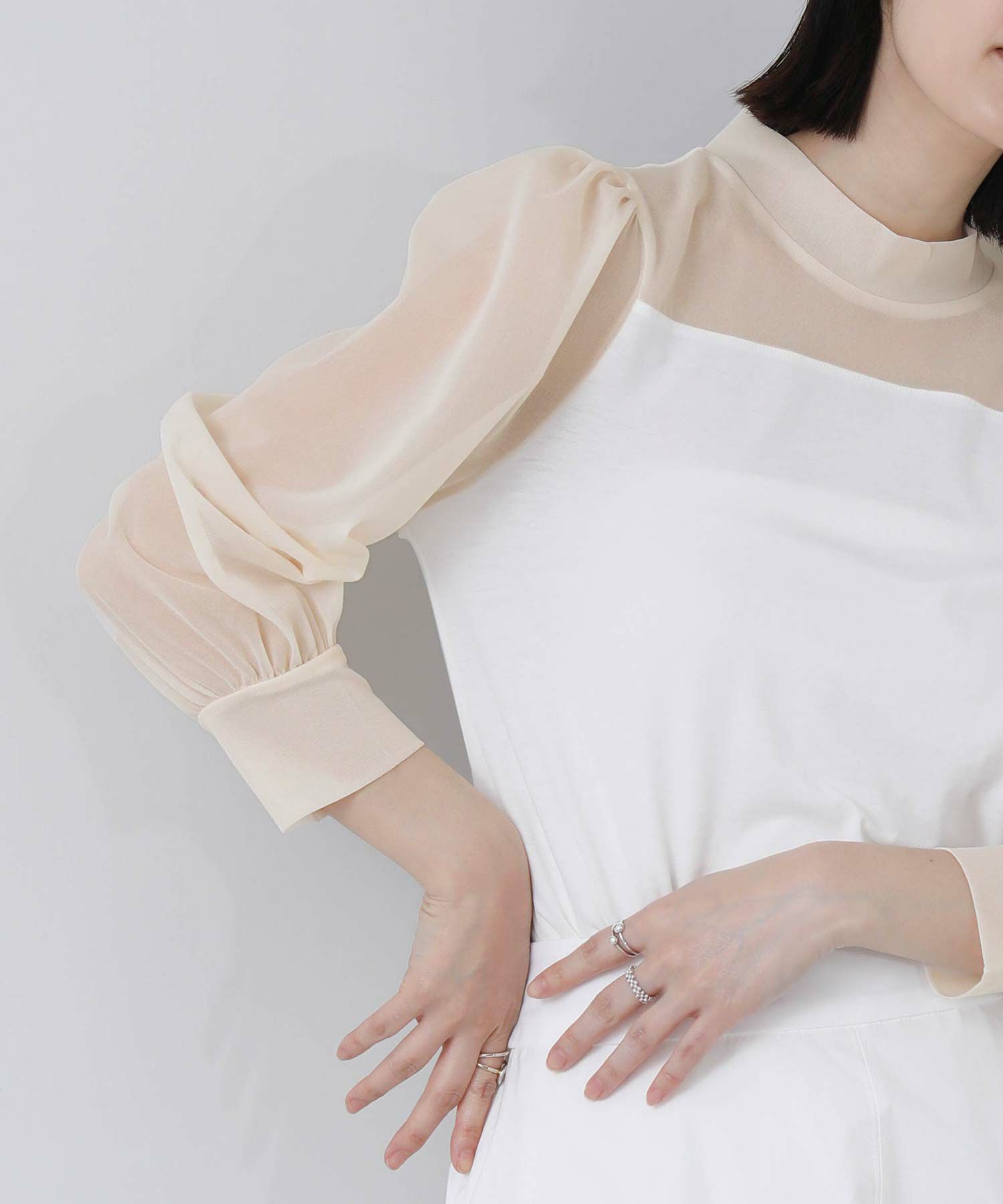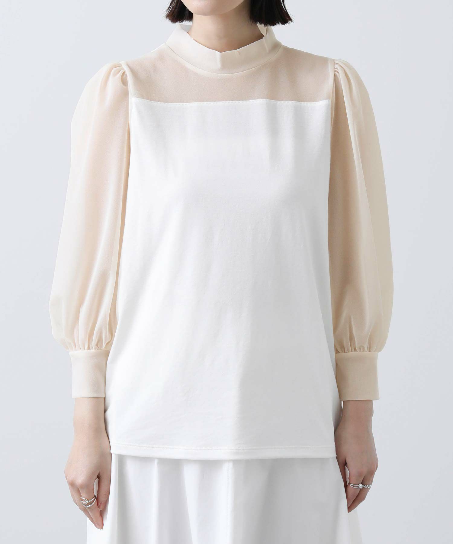 【BoutiqueOrdinary/ブティークオーディナリー】から、シアー素材とジャージーを掛け合わせた、エレガントなハイネックプルオーバーをセレクト。