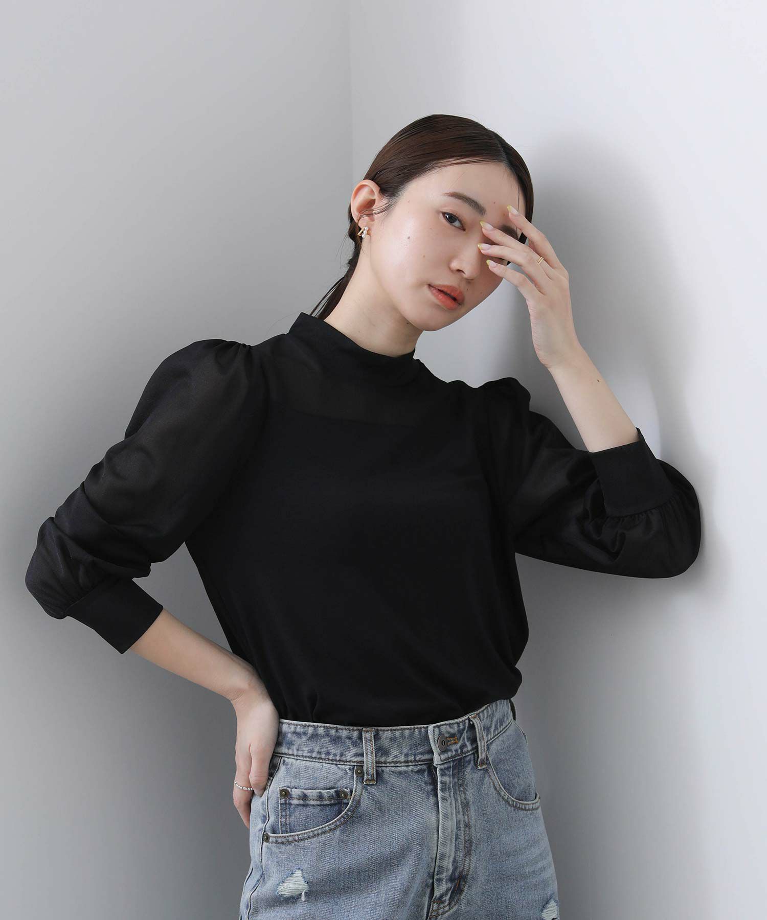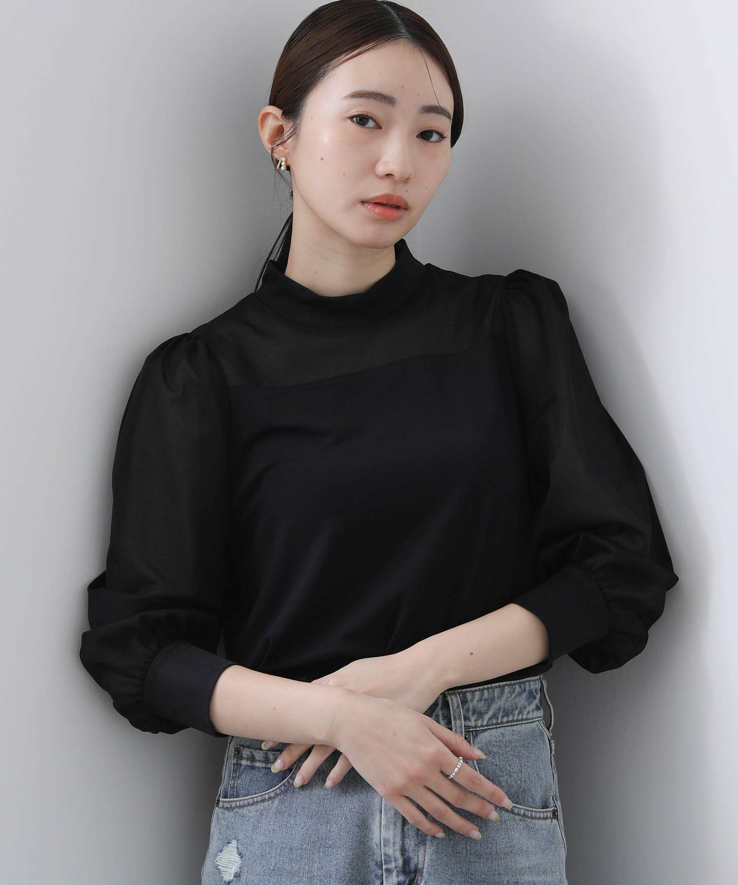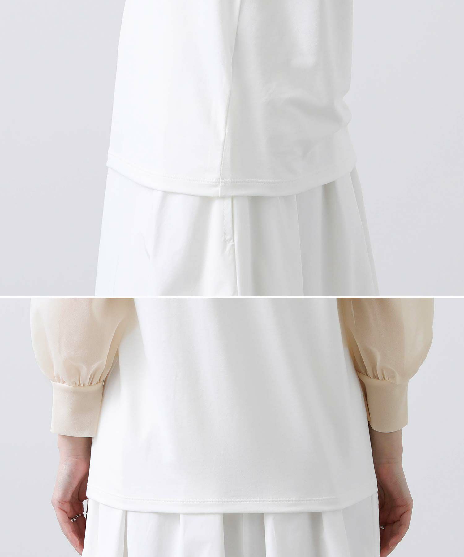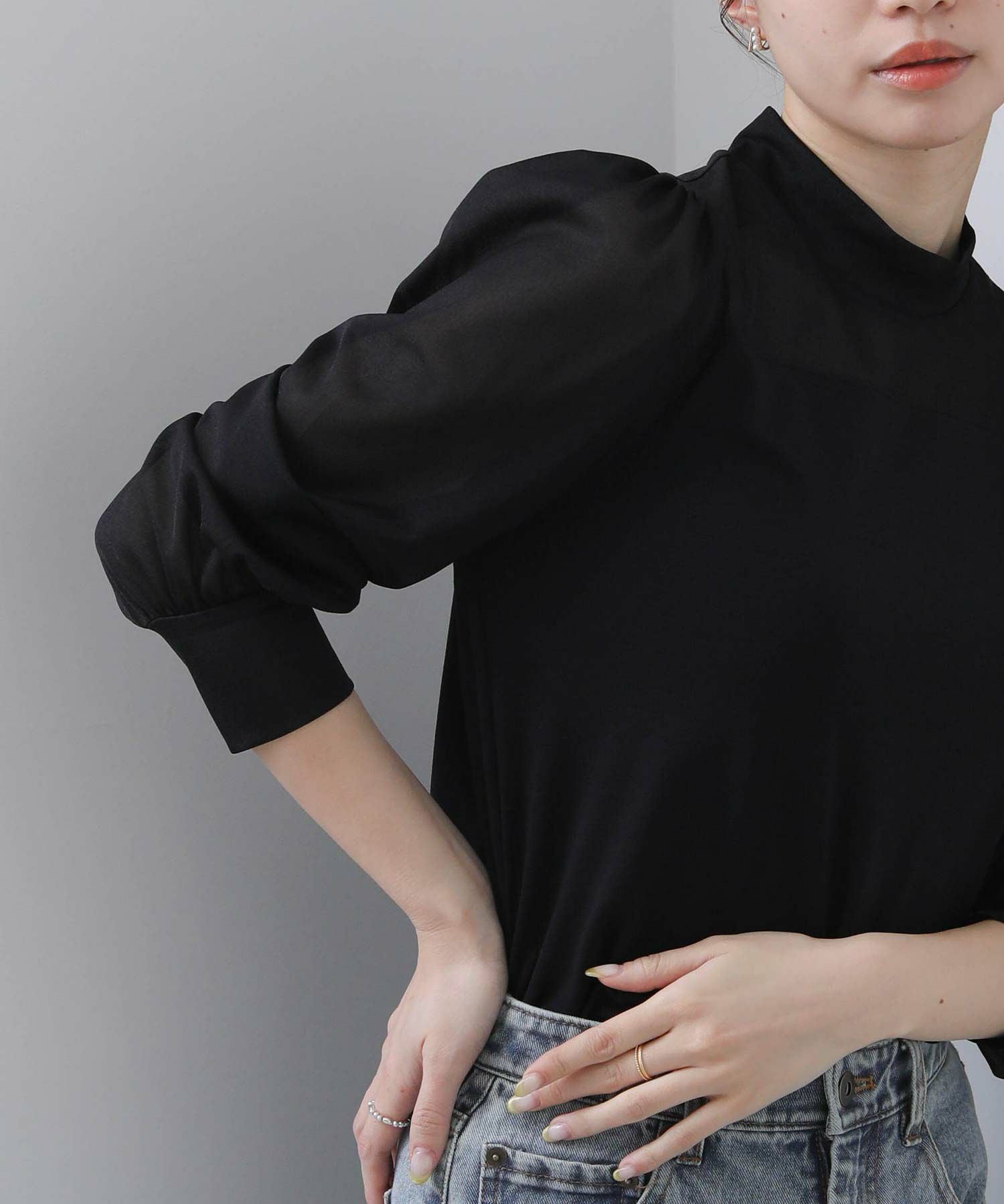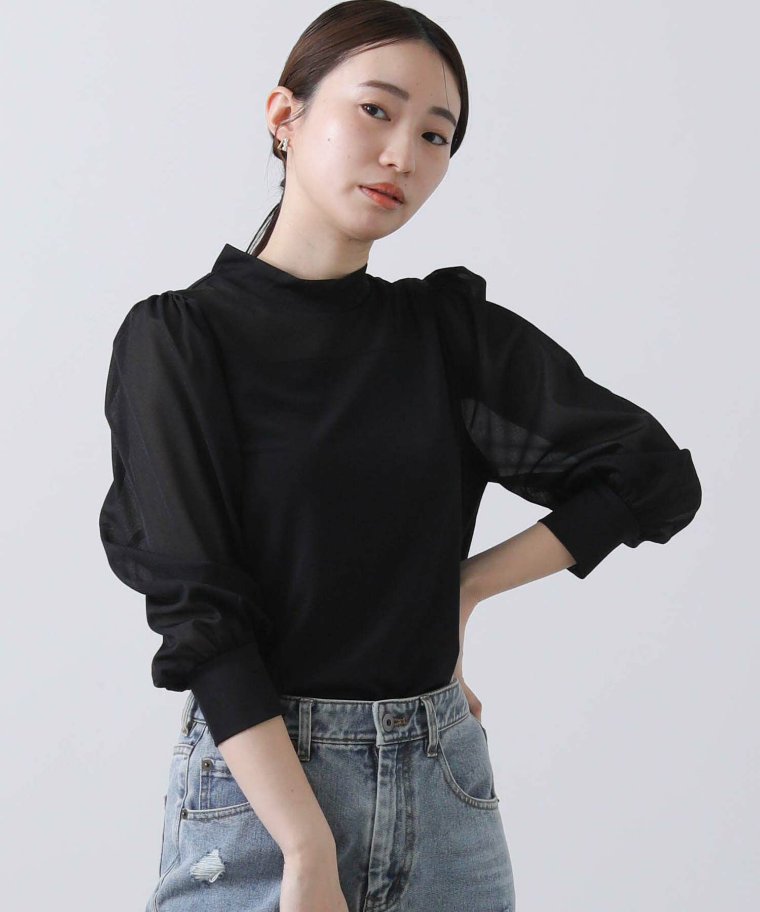 【BoutiqueOrdinary/ブティークオーディナリー】から、シアー素材とジャージーを掛け合わせた、エレガントなハイネックプルオーバーをセレクト。