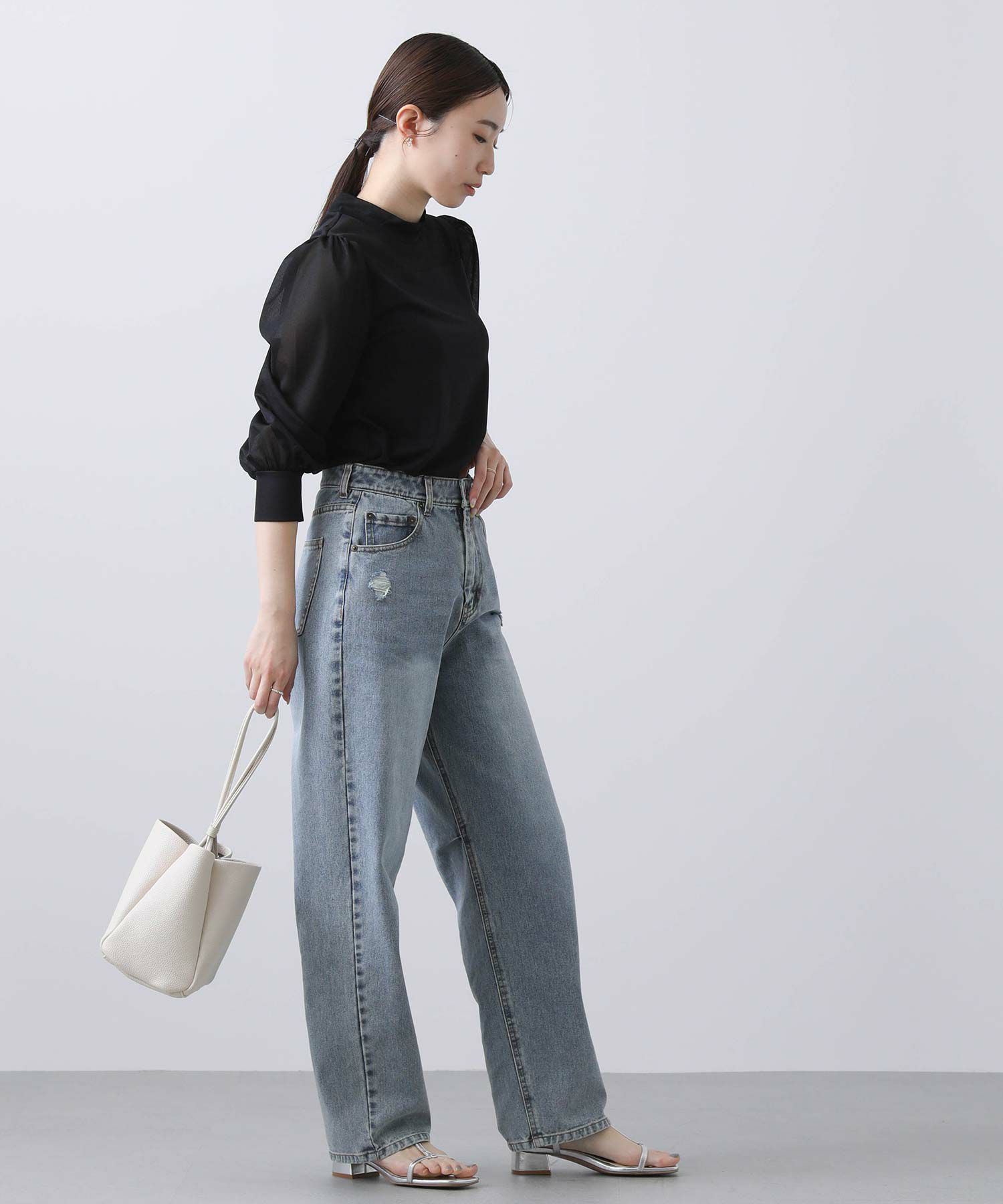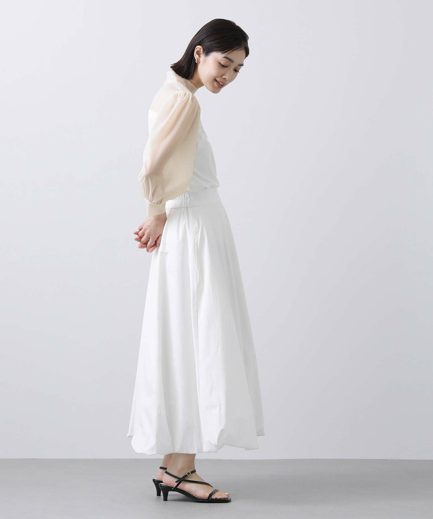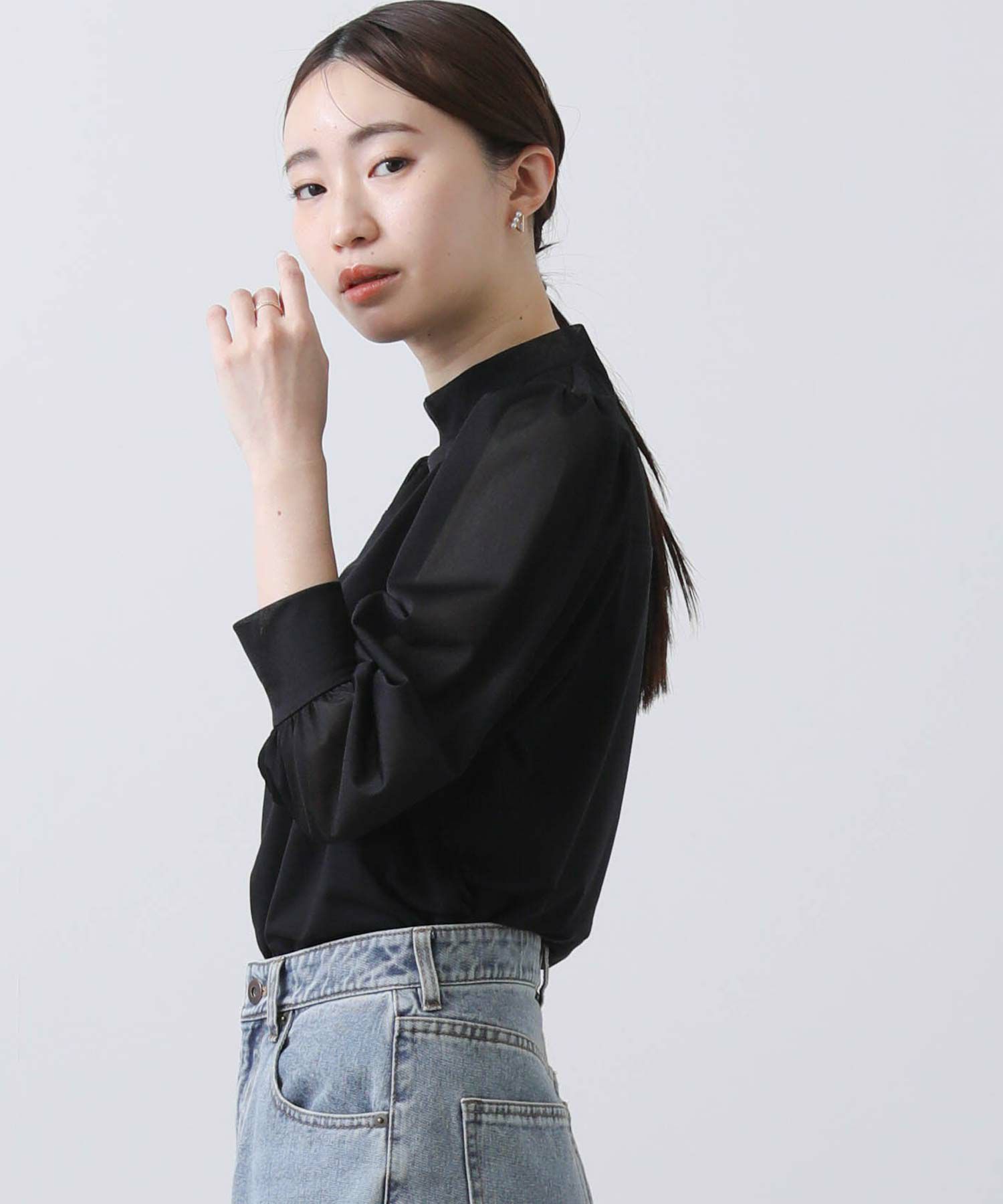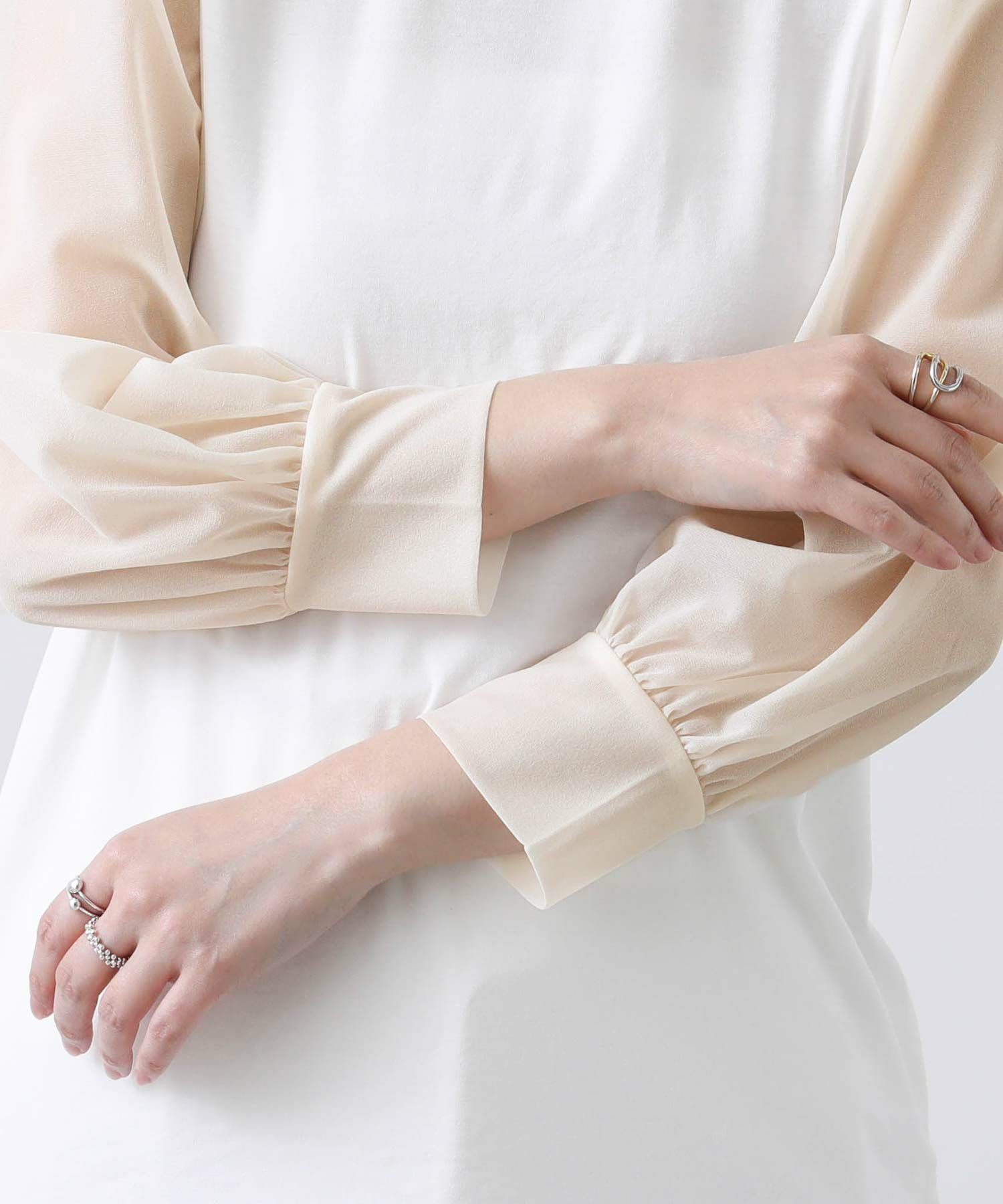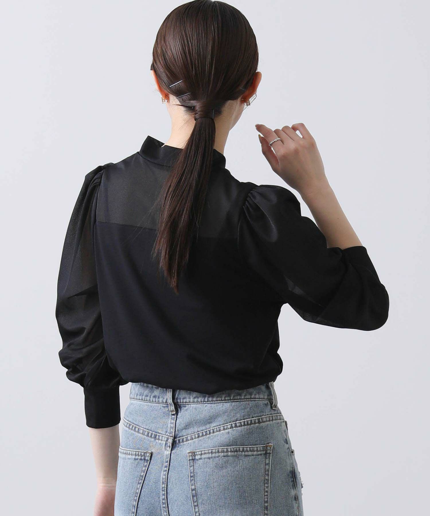 【BoutiqueOrdinary/ブティークオーディナリー】から、シアー素材とジャージーを掛け合わせた、エレガントなハイネックプルオーバーをセレクト。
