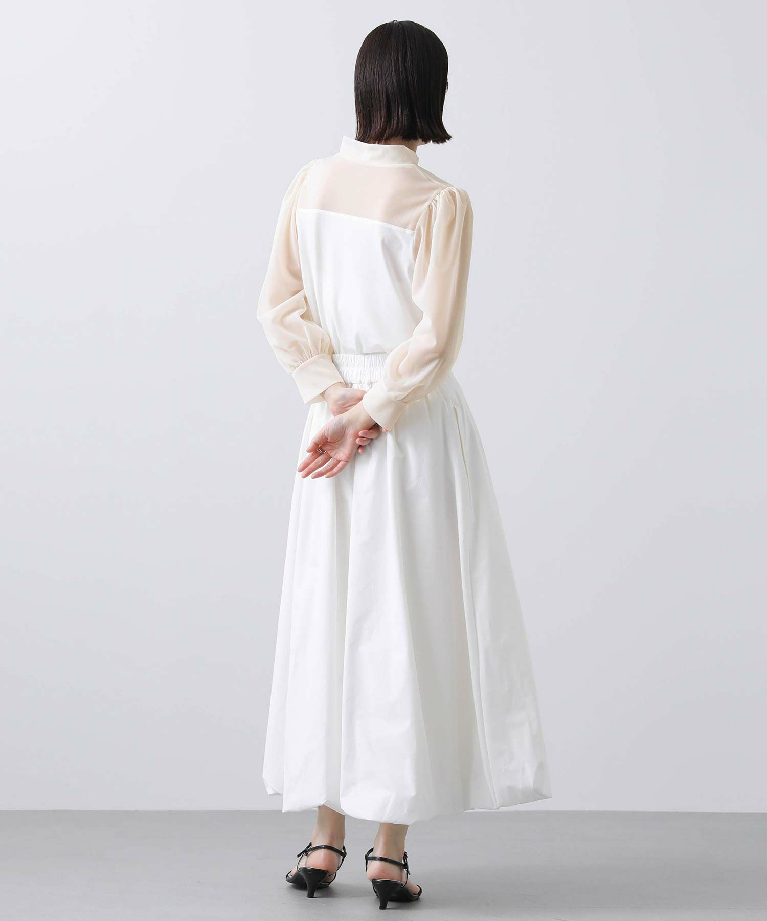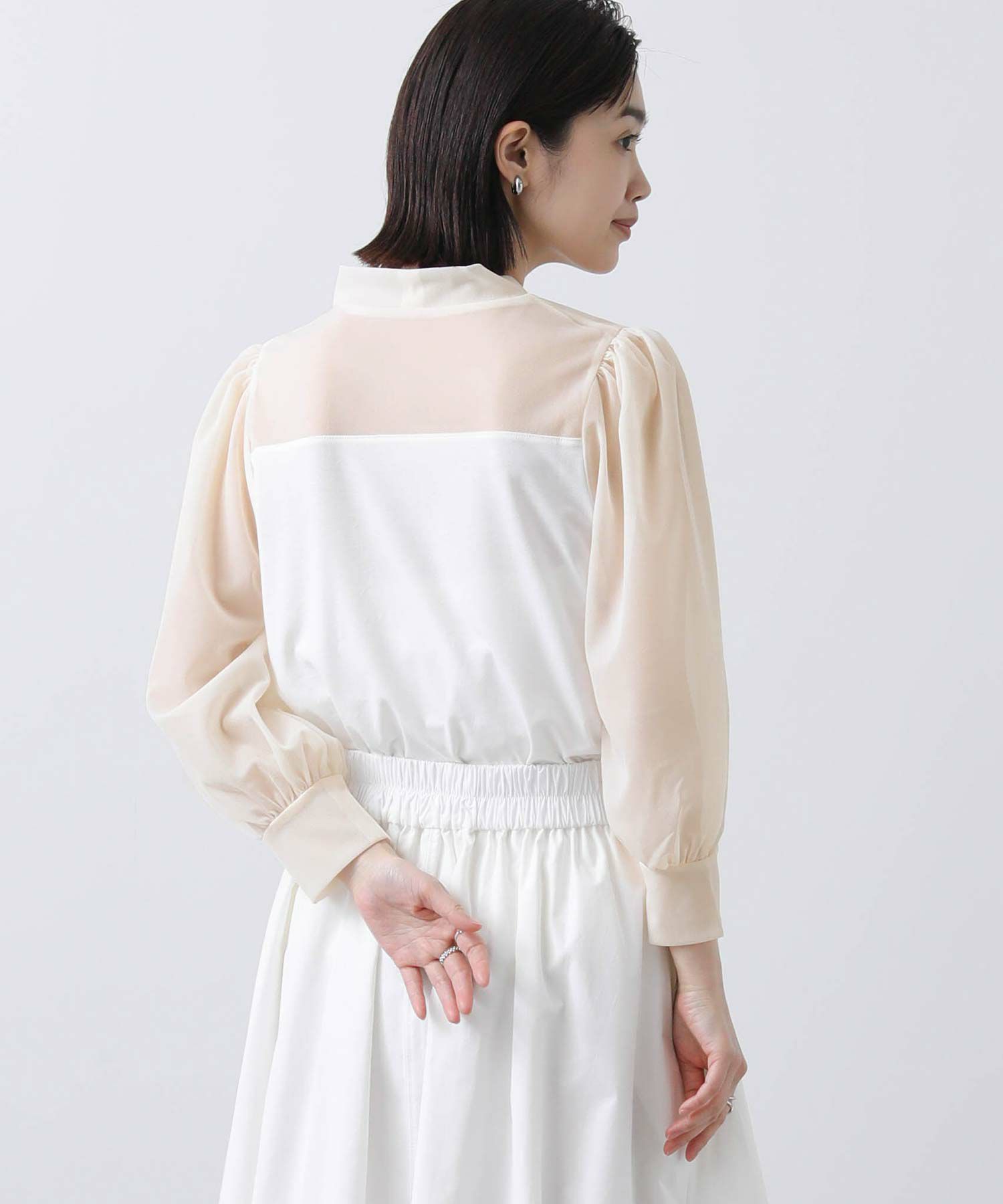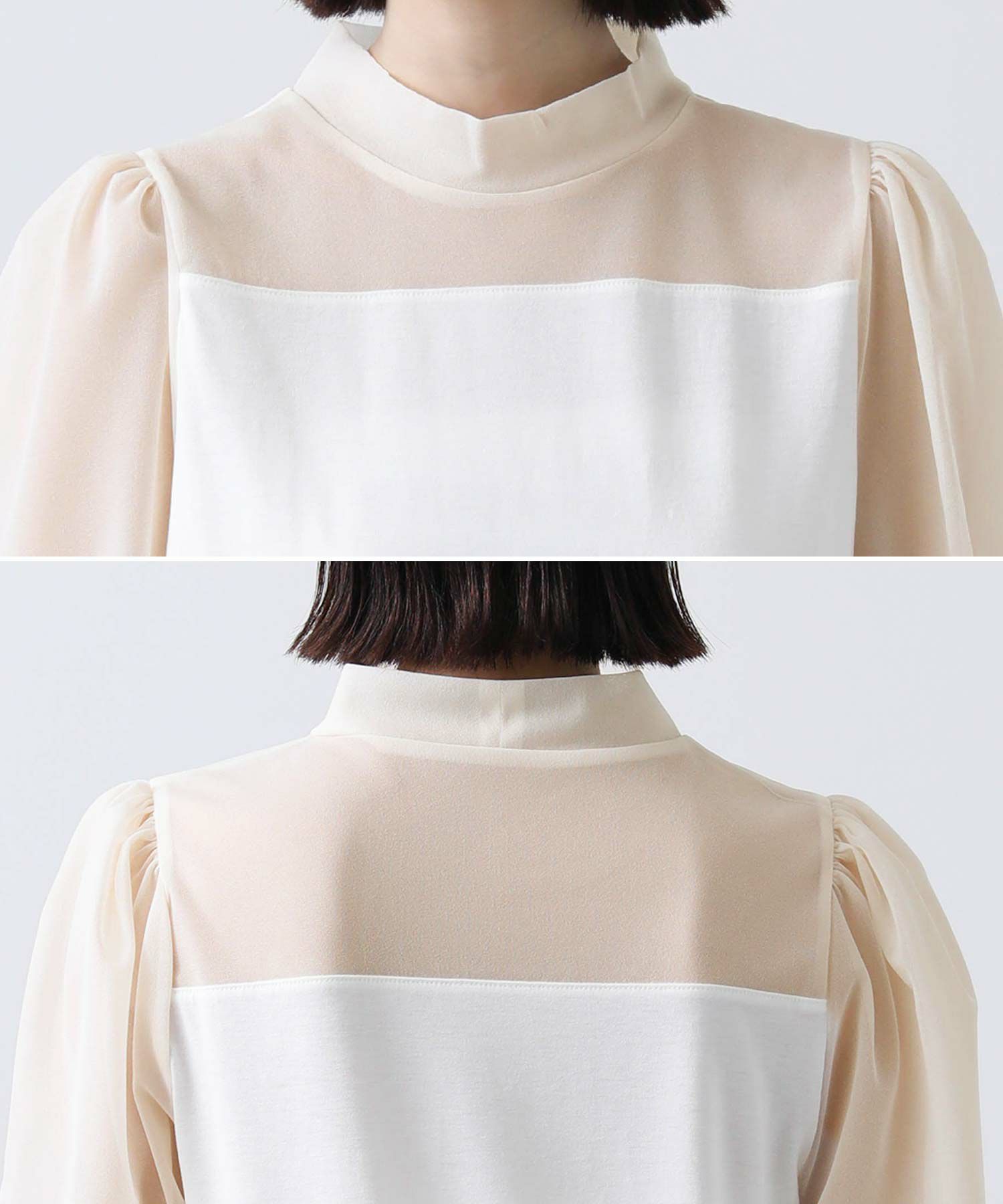 襟、ヨーク、袖にはトレンドのシアー感を取り入れた繊細なトリコットオーガンジーを使用。