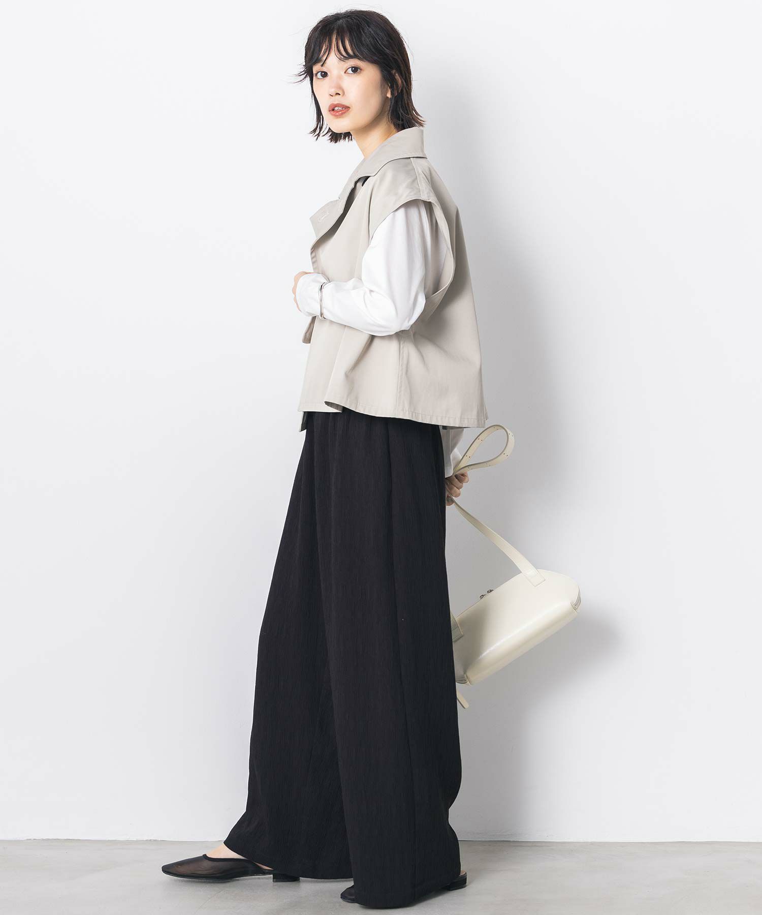 ワイドパンツ、スカートなどと合わせやすいショート丈は全体のバランスを整え、脚長効果を演出します。