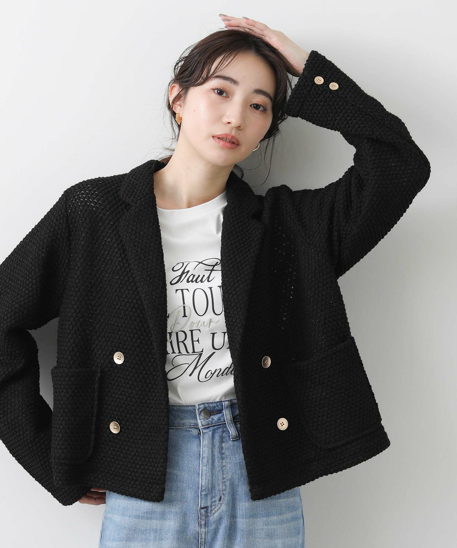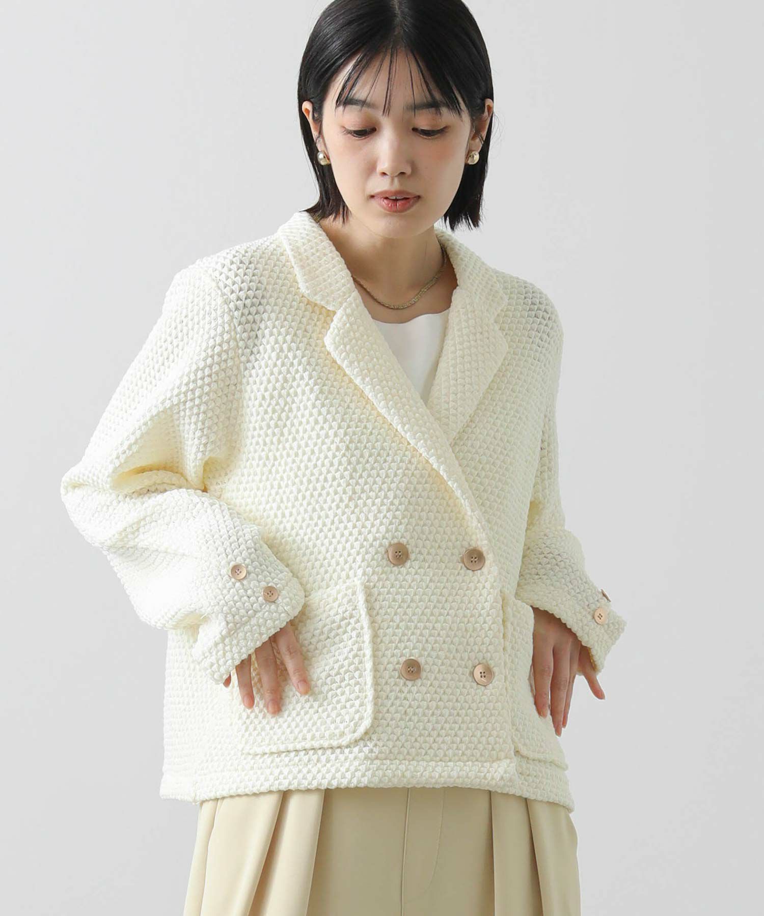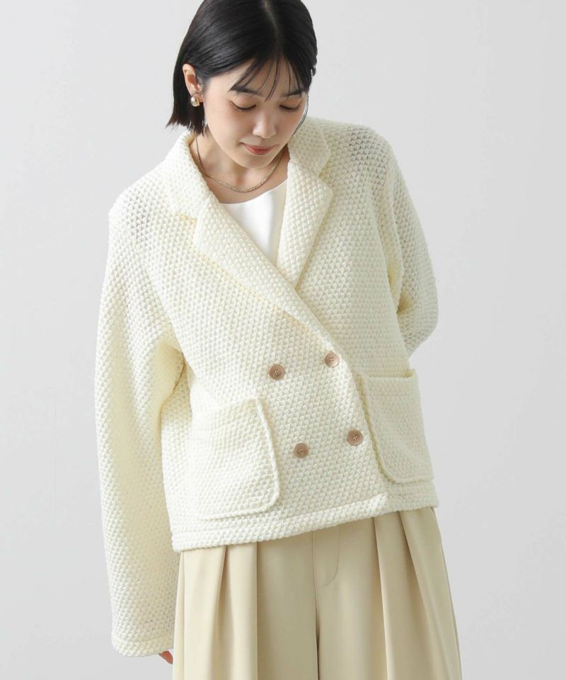 立体感ある生地がしなやかで軽く、着やすい一着です。ダブルボタンの短丈ジャケットでお出かけやオケージョンなどの上品な着こなしから、デニムやジョガーパンツなどのカジュアルなコーデまで、雰囲気を変えながらもしっくりくるとても使えるジャケットです。