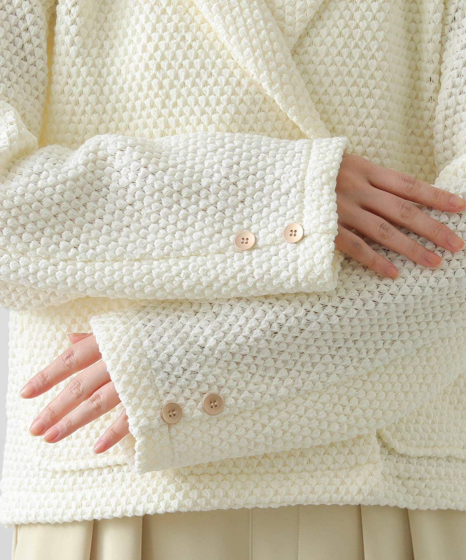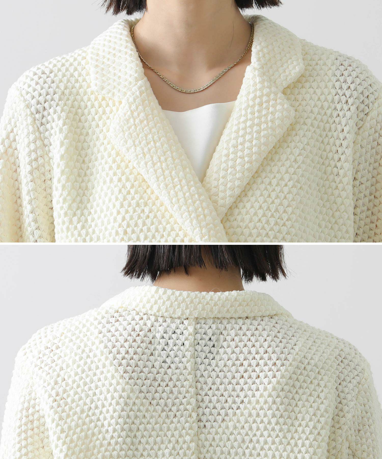 【CYAN tokyo(シアントーキョー)】から、ワッフル編みされたクロッシェレースのテーラードジャケットをセレクト。