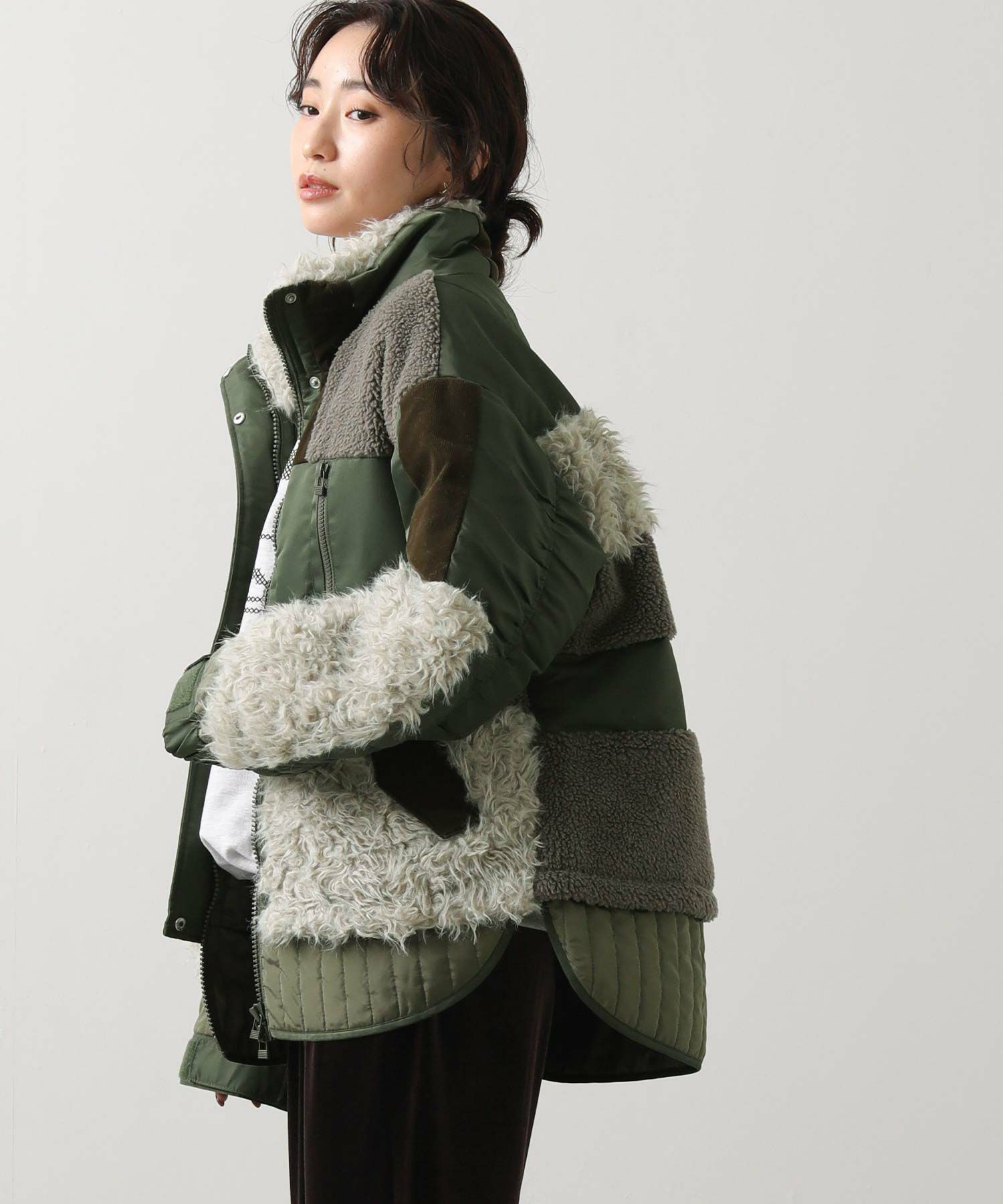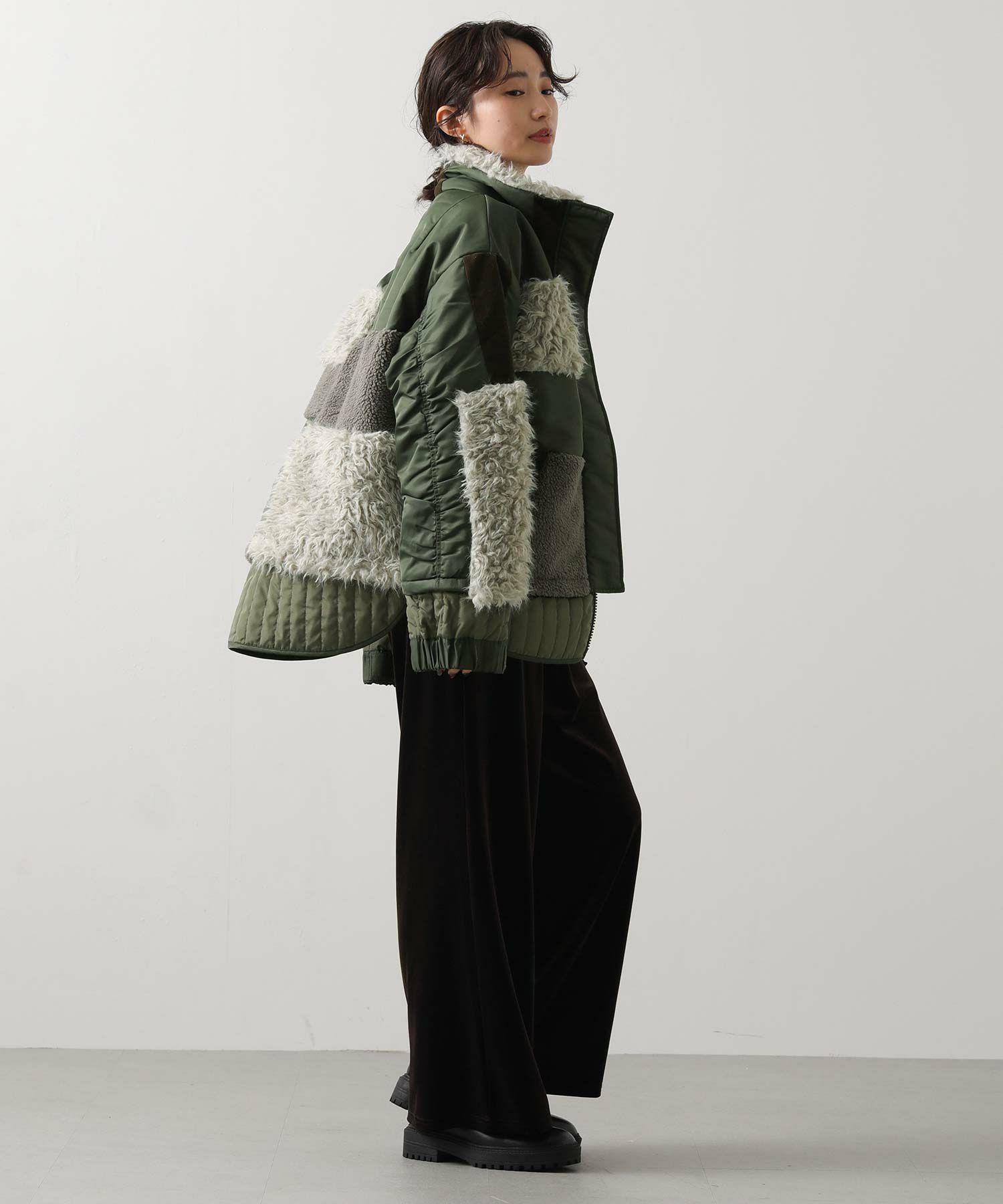 【AULAAILA(アウラアイラ】から、ナイロンタフタをベースに、エコファー、ボア、キルティング、コーデュロイなど、様々な素材を組み合わせたブルゾンをセレクト。