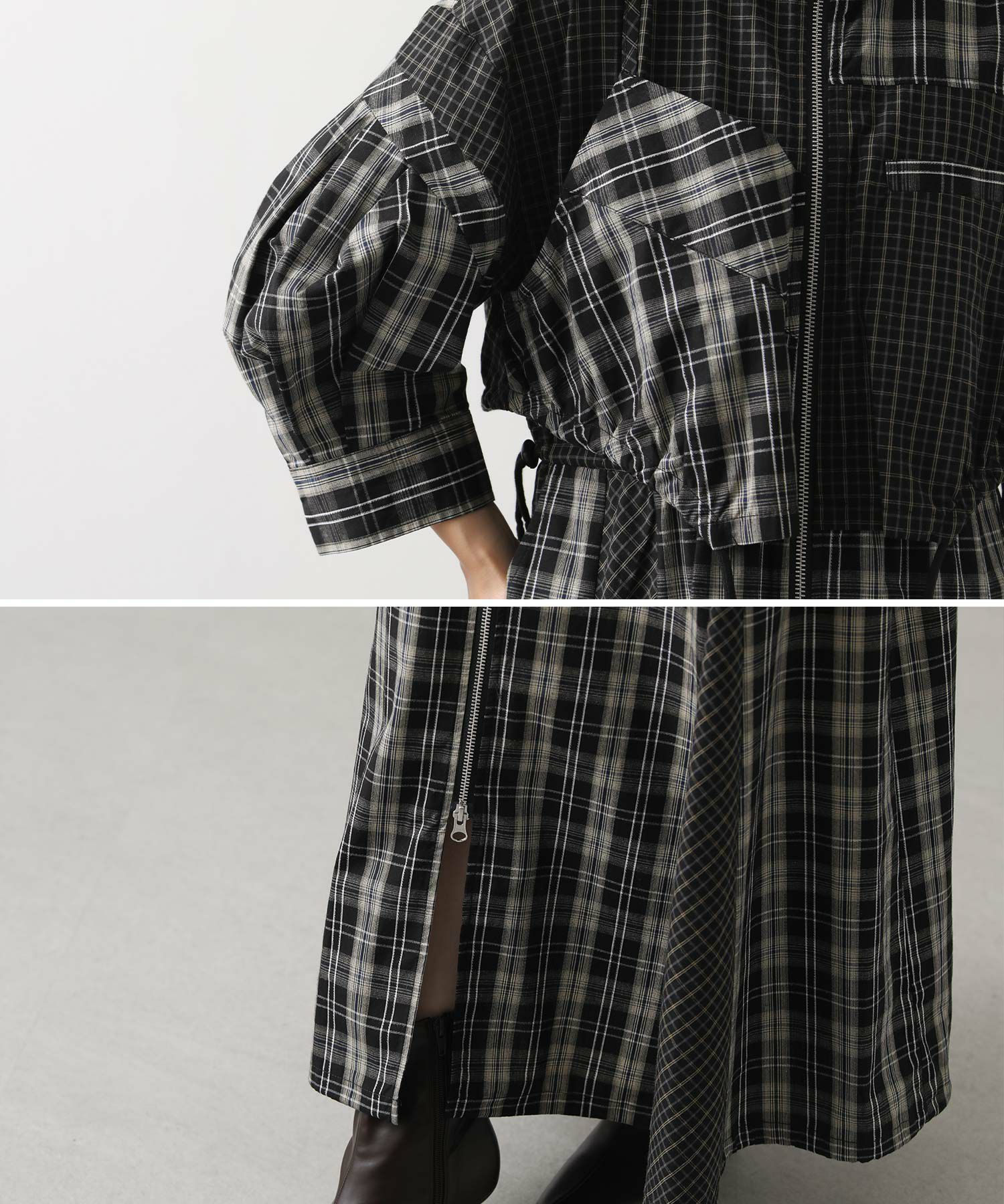 【AULAAILA(アウラアイラ】から、2種類のチェックを組み合わせたシャツワンピースをセレクト。