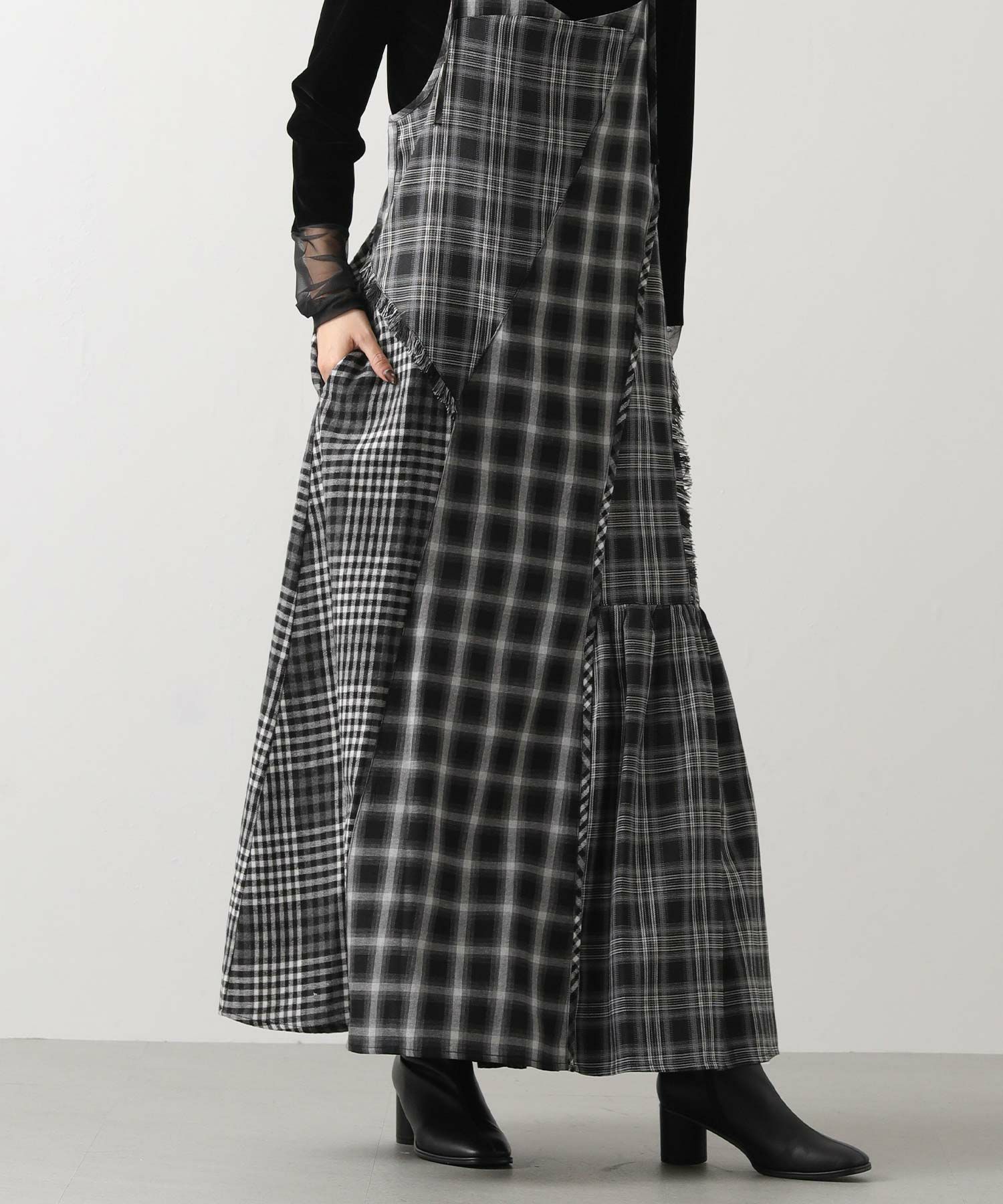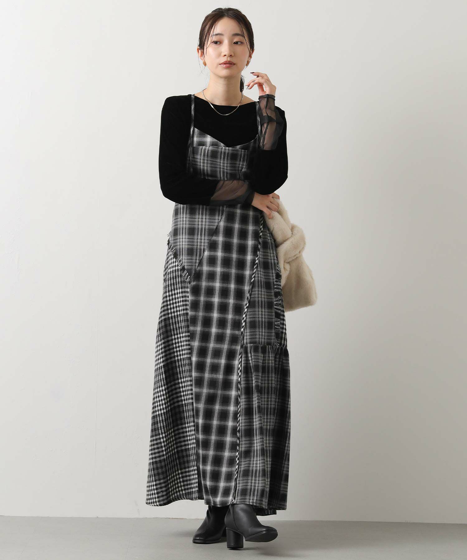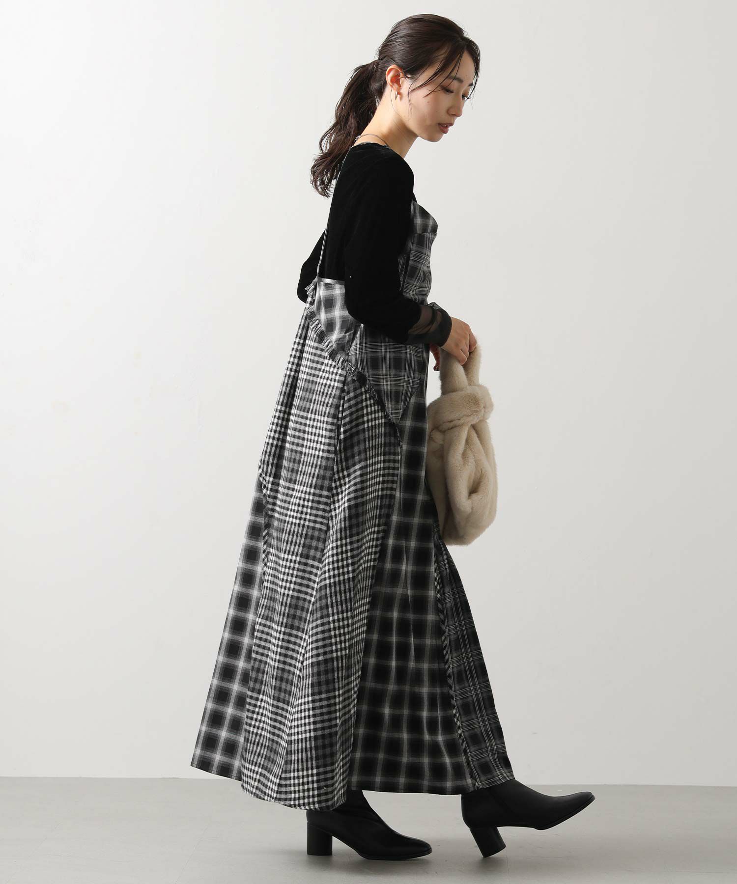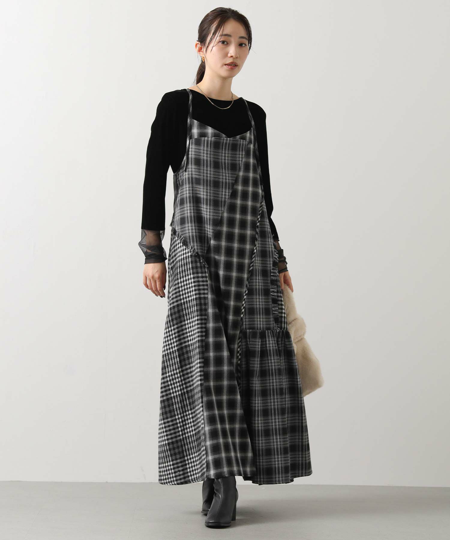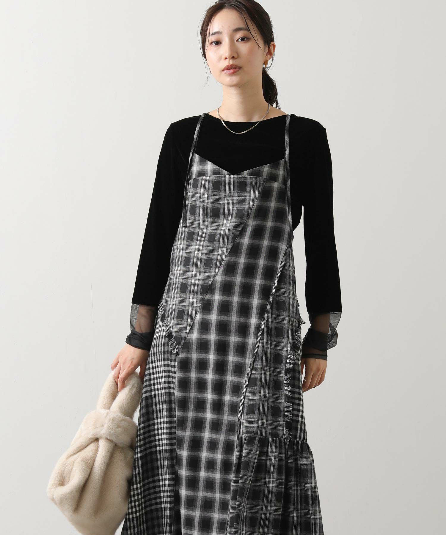 【AULAAILA(アウラアイラ】から、3種類のチェックをランダムに剥ぎ合わせ、アクセントにパイピングやフリンジを挟み込んだチェックコンビネーションロングキャミソールワンピースをセレクト。
