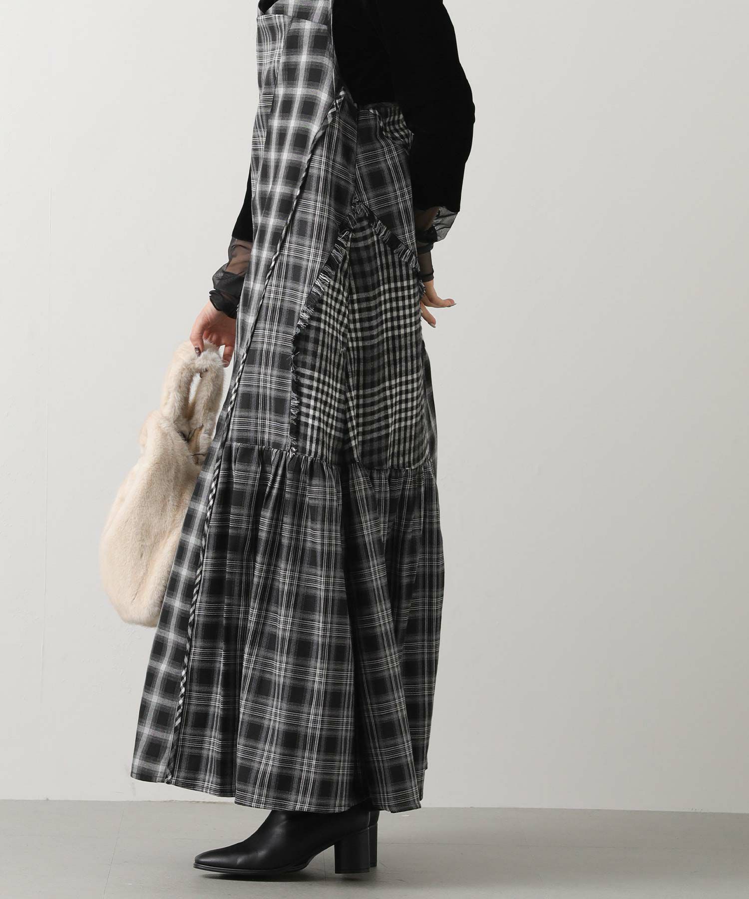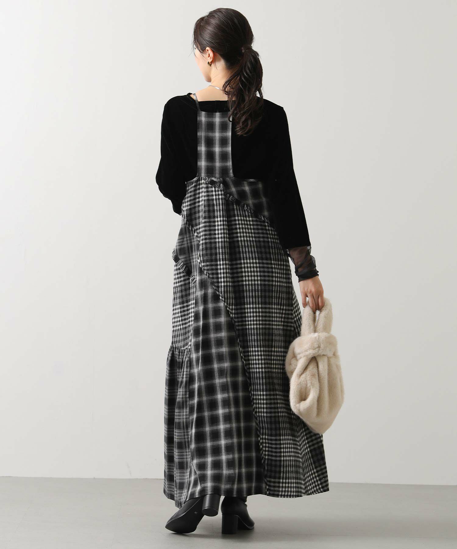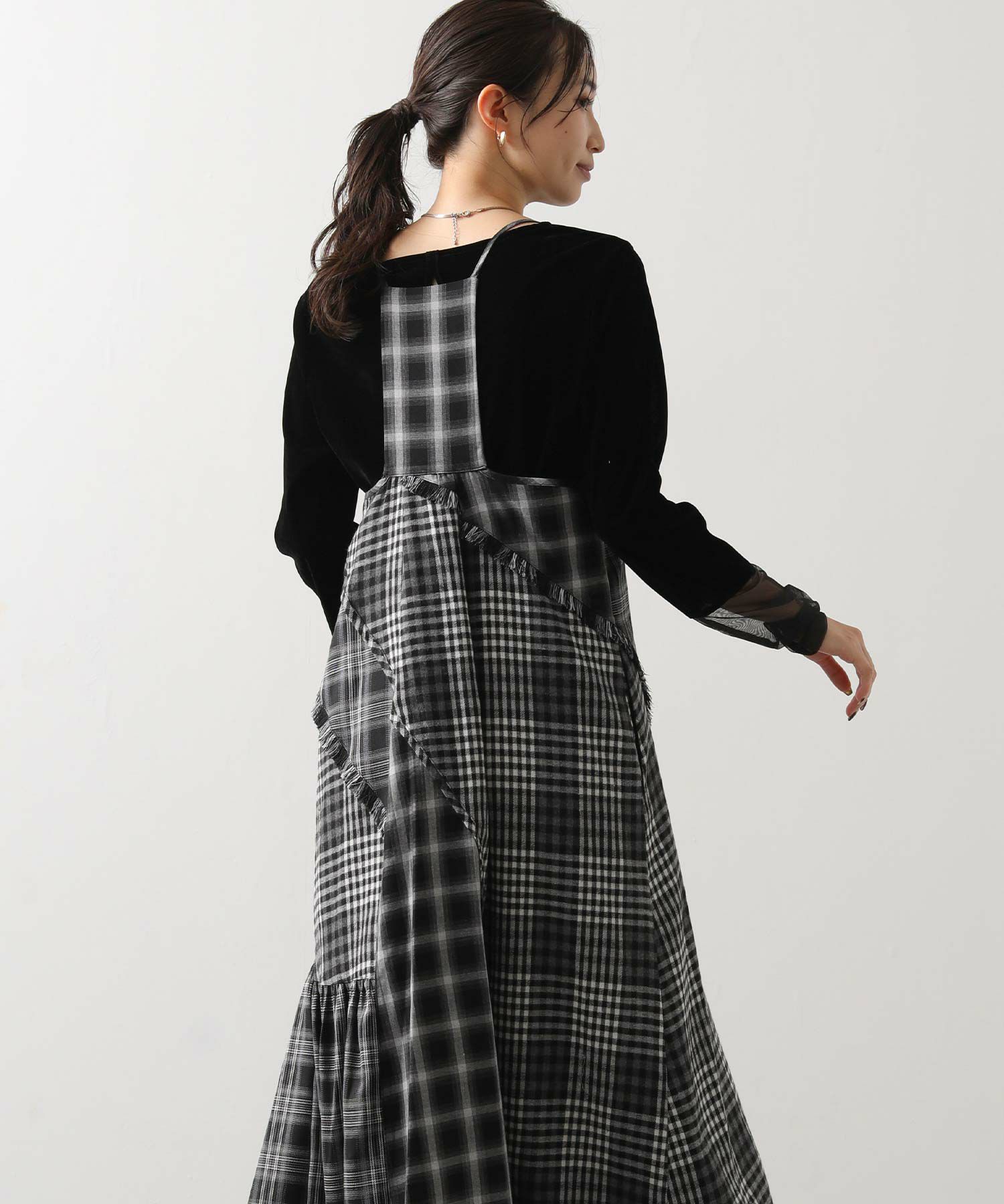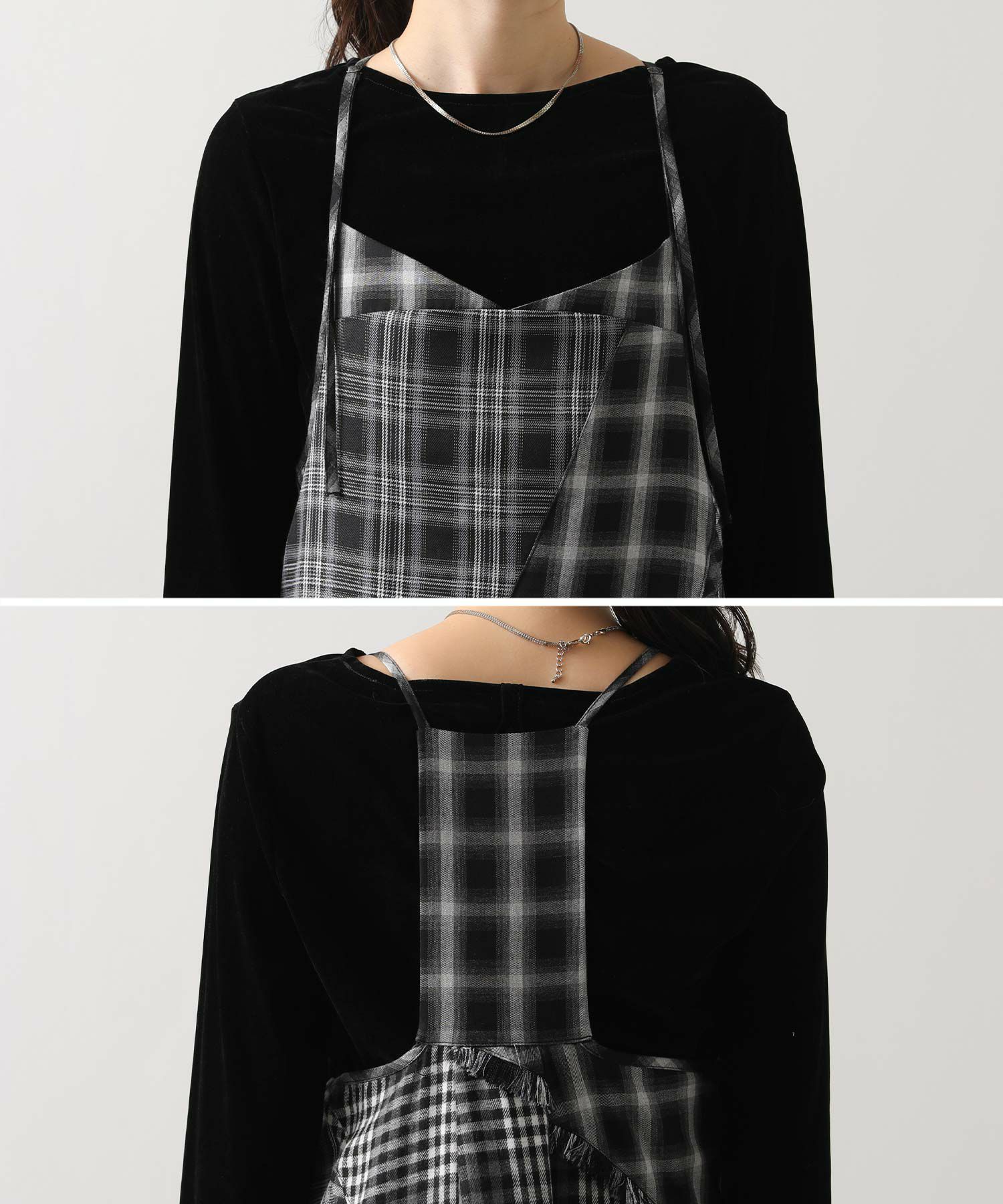 【AULAAILA(アウラアイラ】から、3種類のチェックをランダムに剥ぎ合わせ、アクセントにパイピングやフリンジを挟み込んだチェックコンビネーションロングキャミソールワンピースをセレクト。
