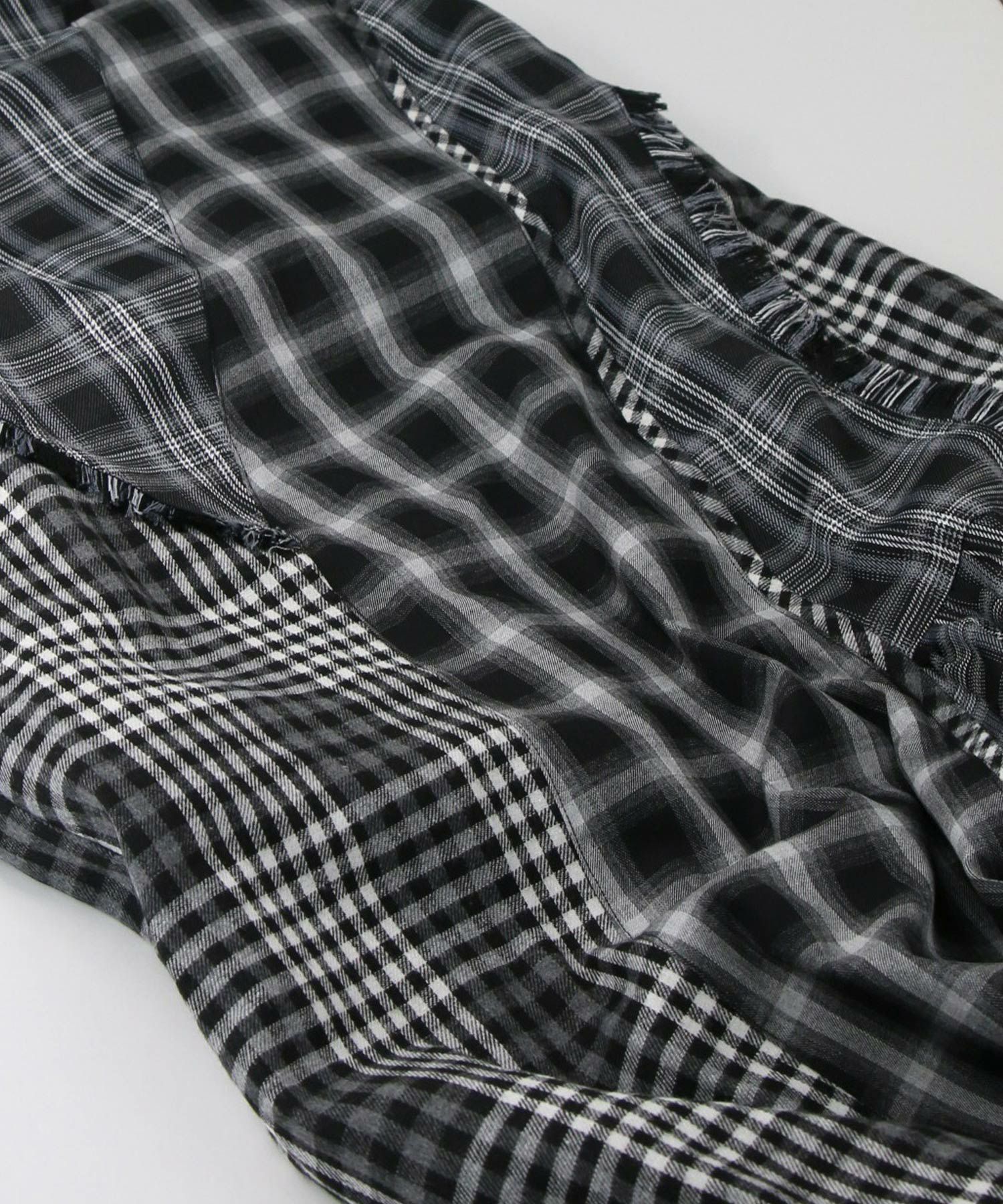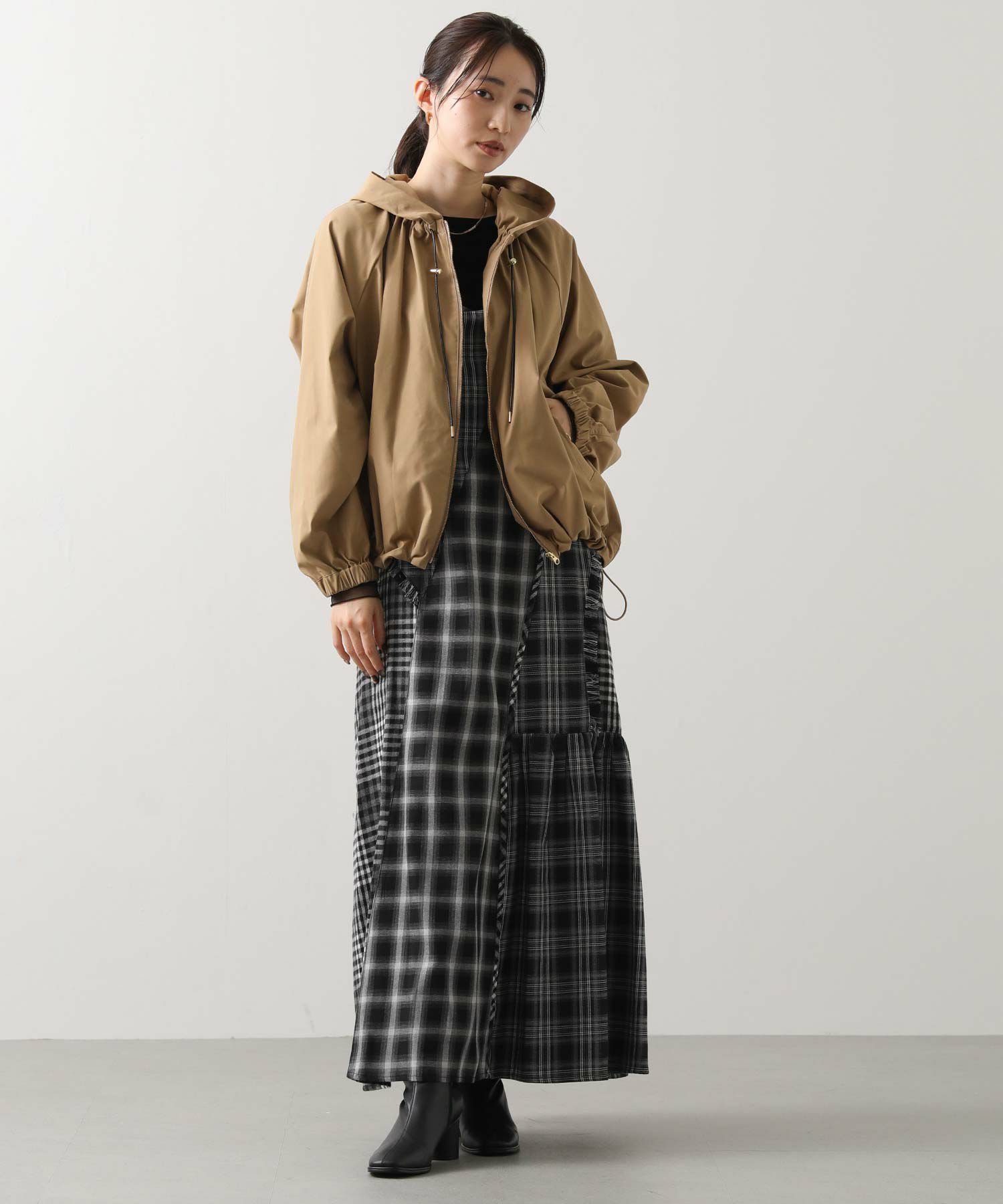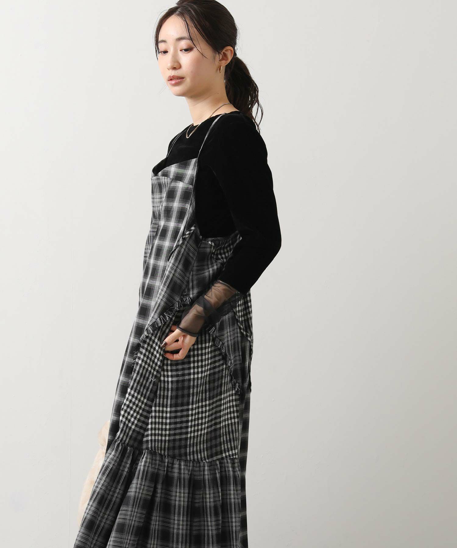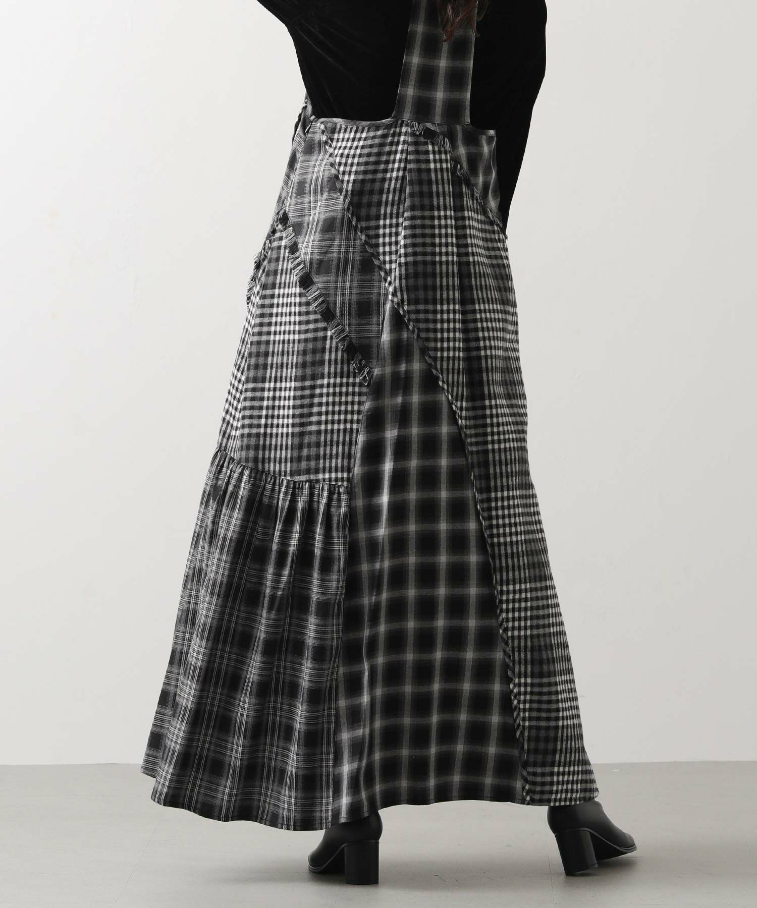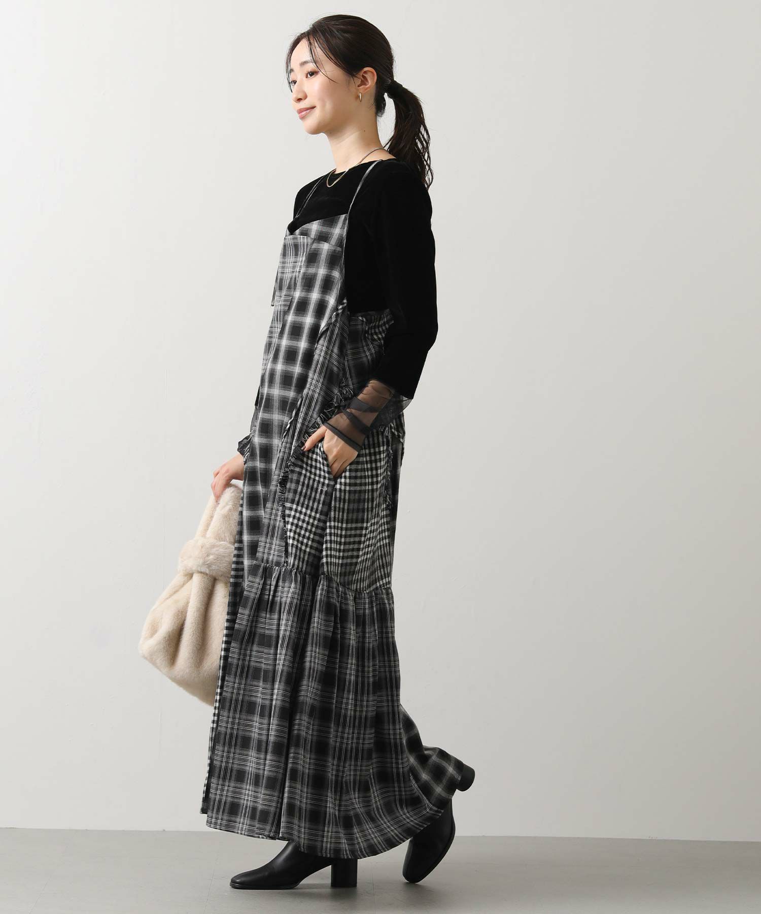 【AULAAILA(アウラアイラ】から、3種類のチェックをランダムに剥ぎ合わせ、アクセントにパイピングやフリンジを挟み込んだチェックコンビネーションロングキャミソールワンピースをセレクト。