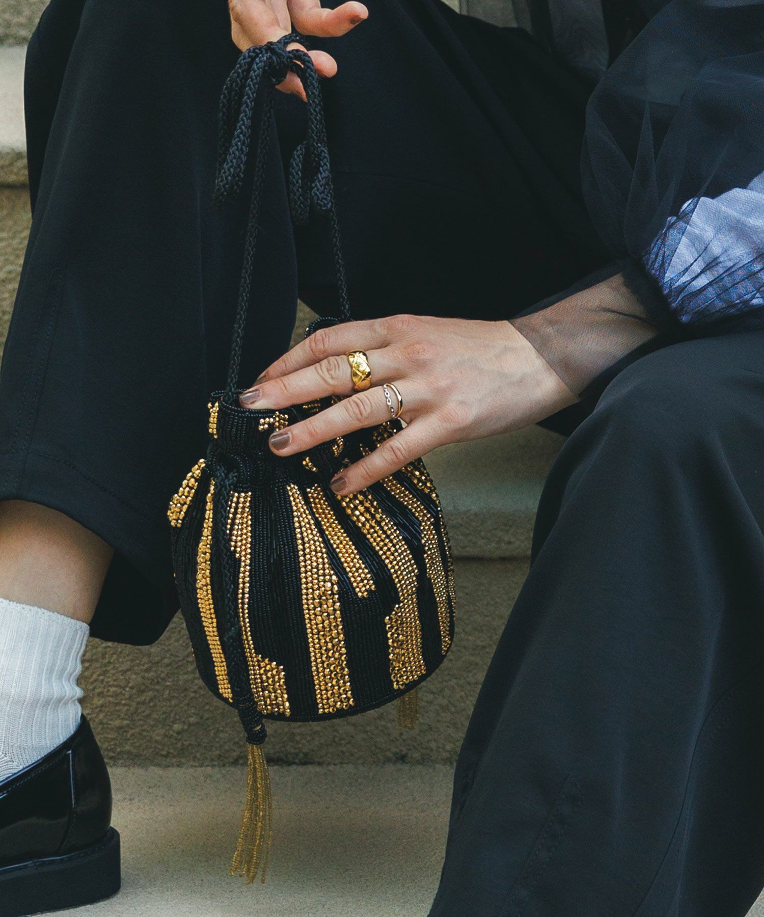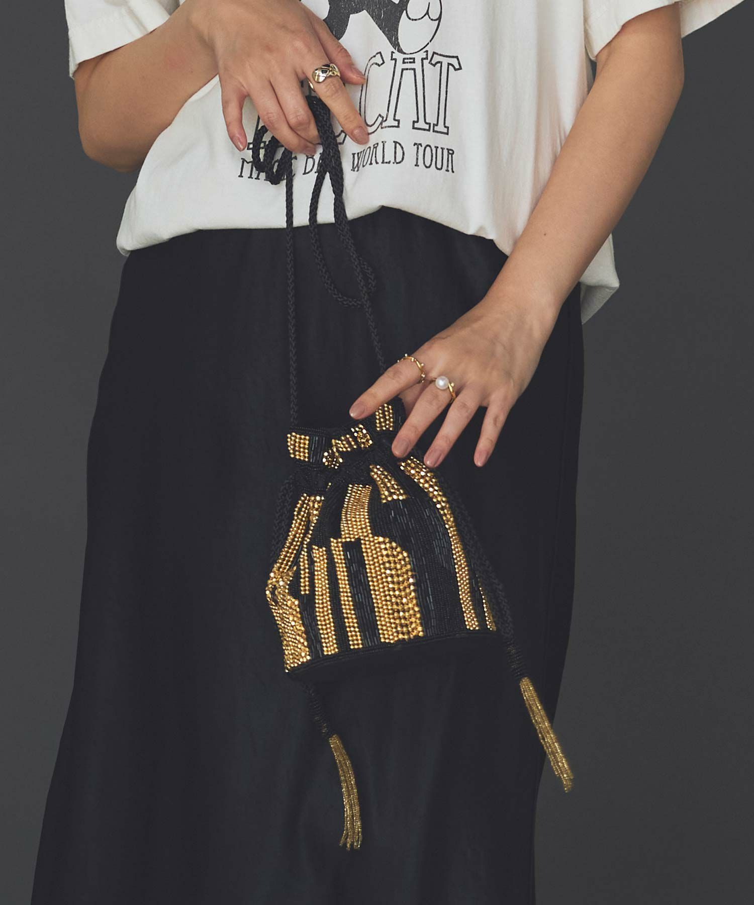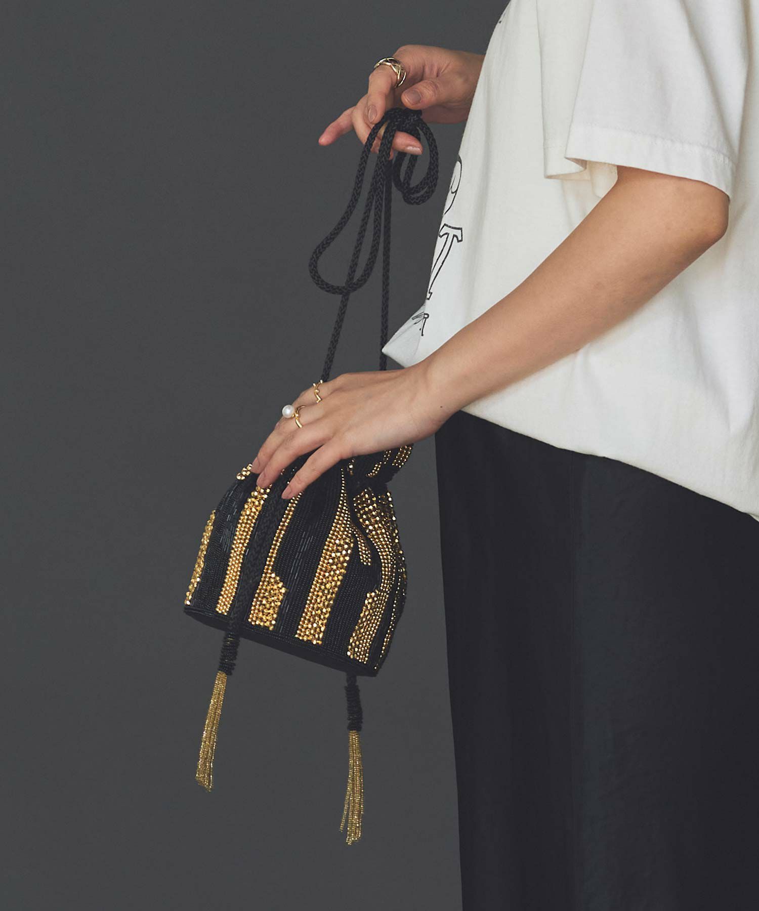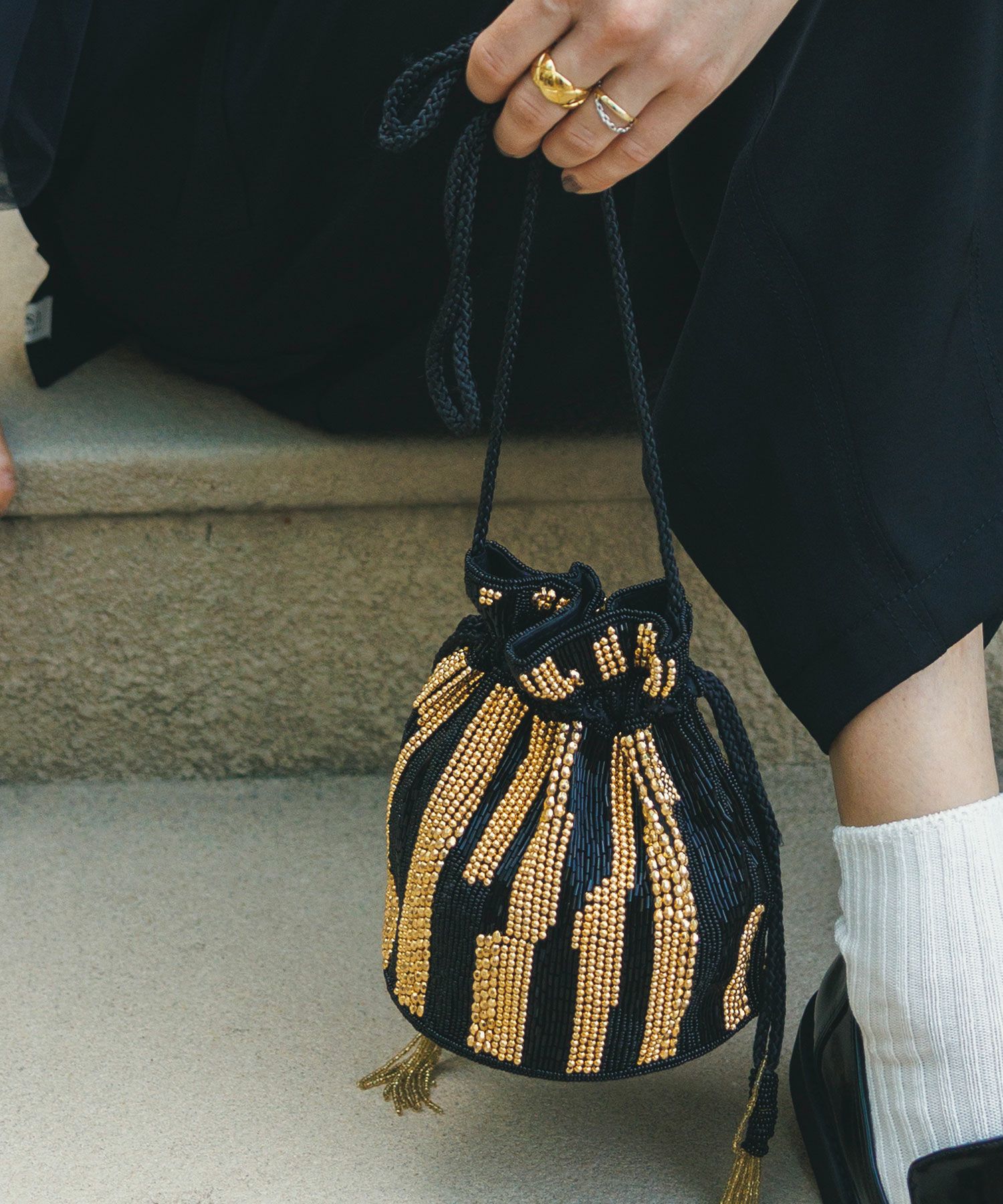 オケージョンにも、普段使いにも、様々な着こなしに使えるビーズバッグ。