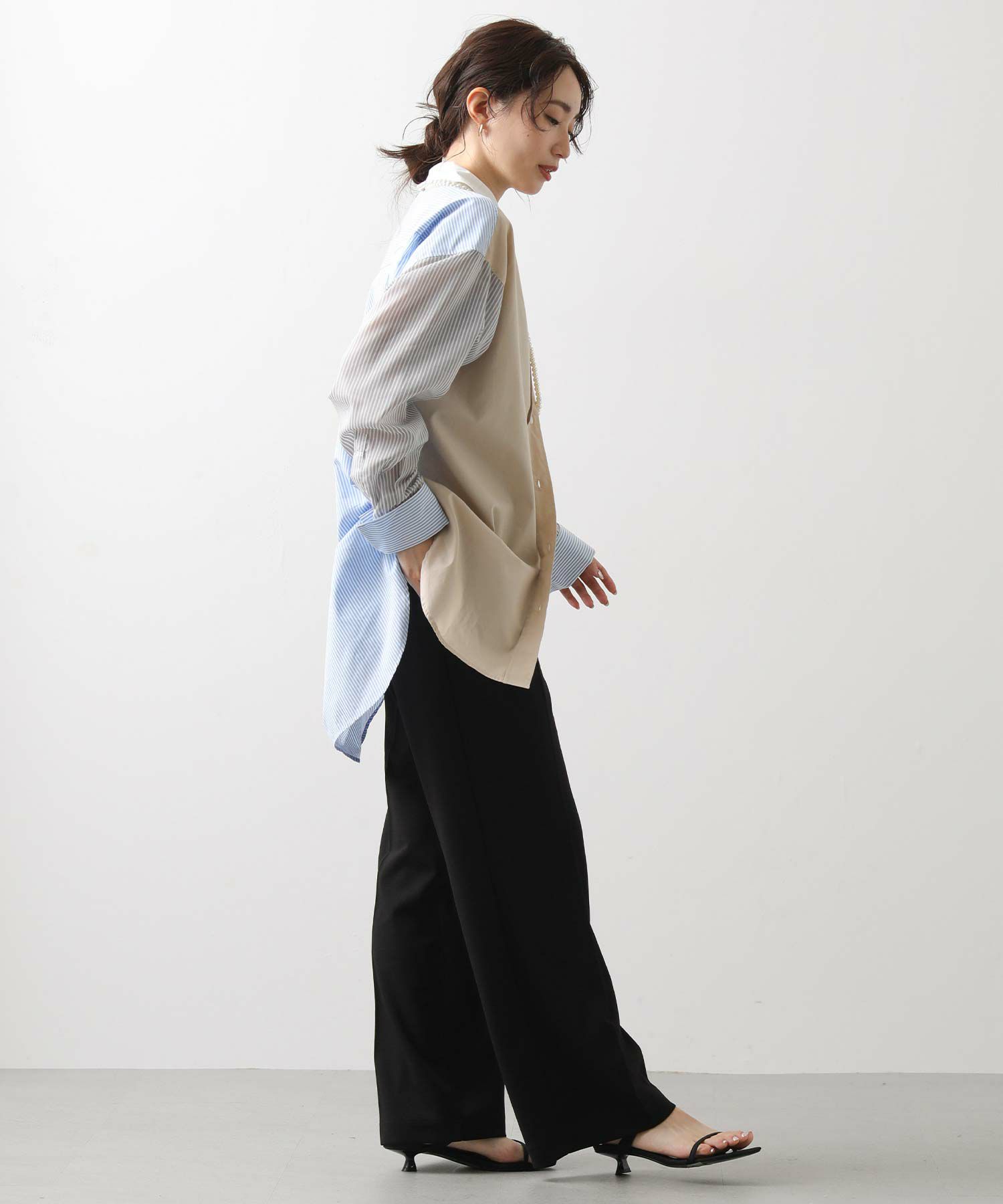 前身頃と衿は色違いのプロード、後身頃とカフスはストライブ、袖はシアーストライプと3種類の素材を使い分けたデザイン。
