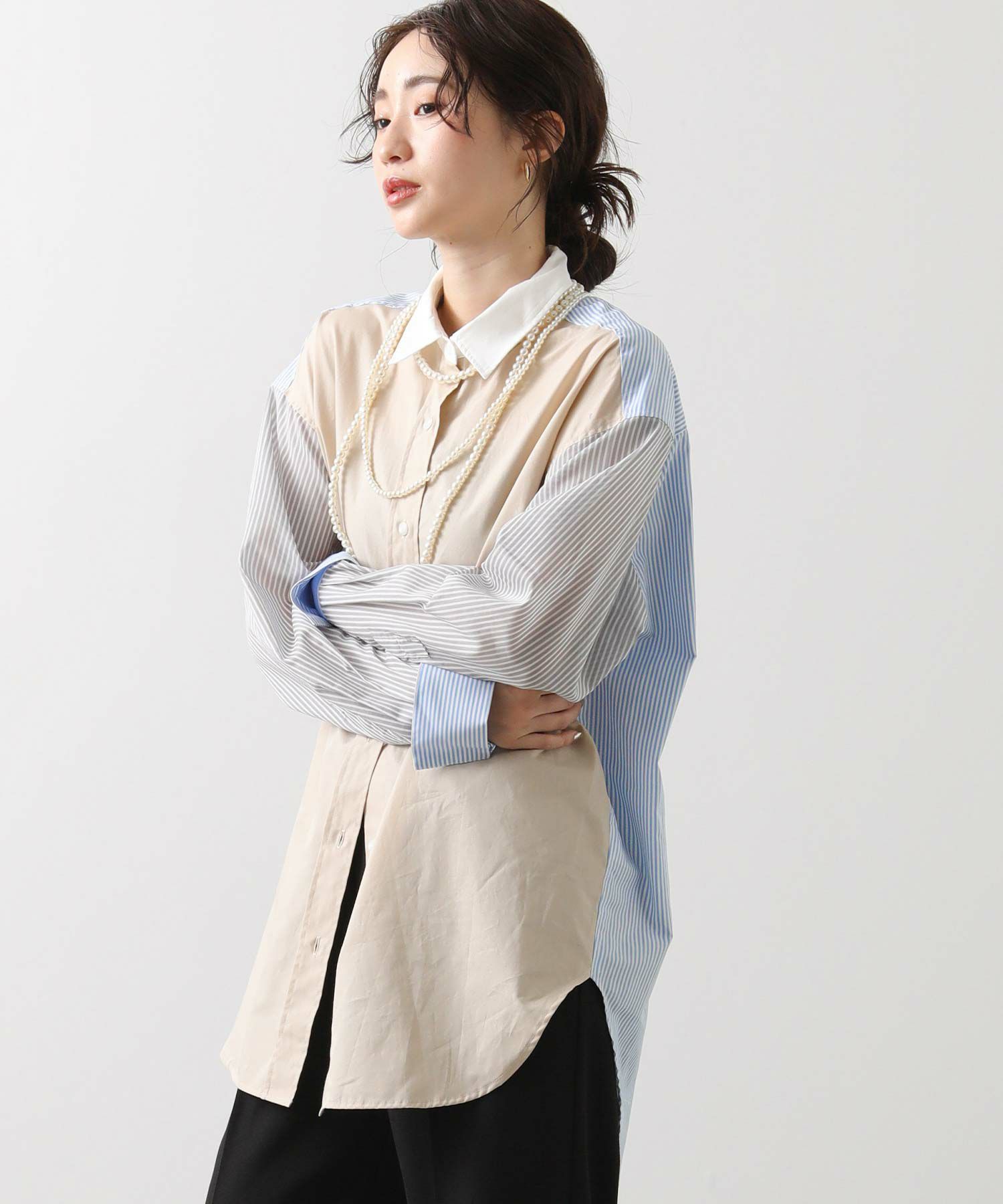 【Munich(ミューニック】から、3素材を組み合わせた着丈の長いレギュラーカラーシャツをセレクト。