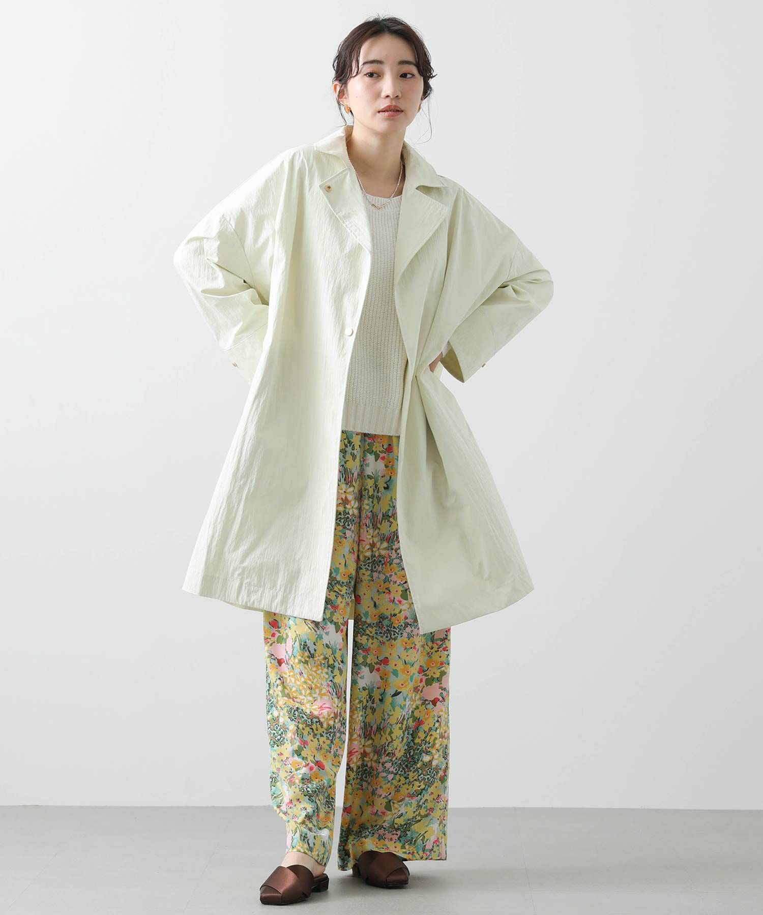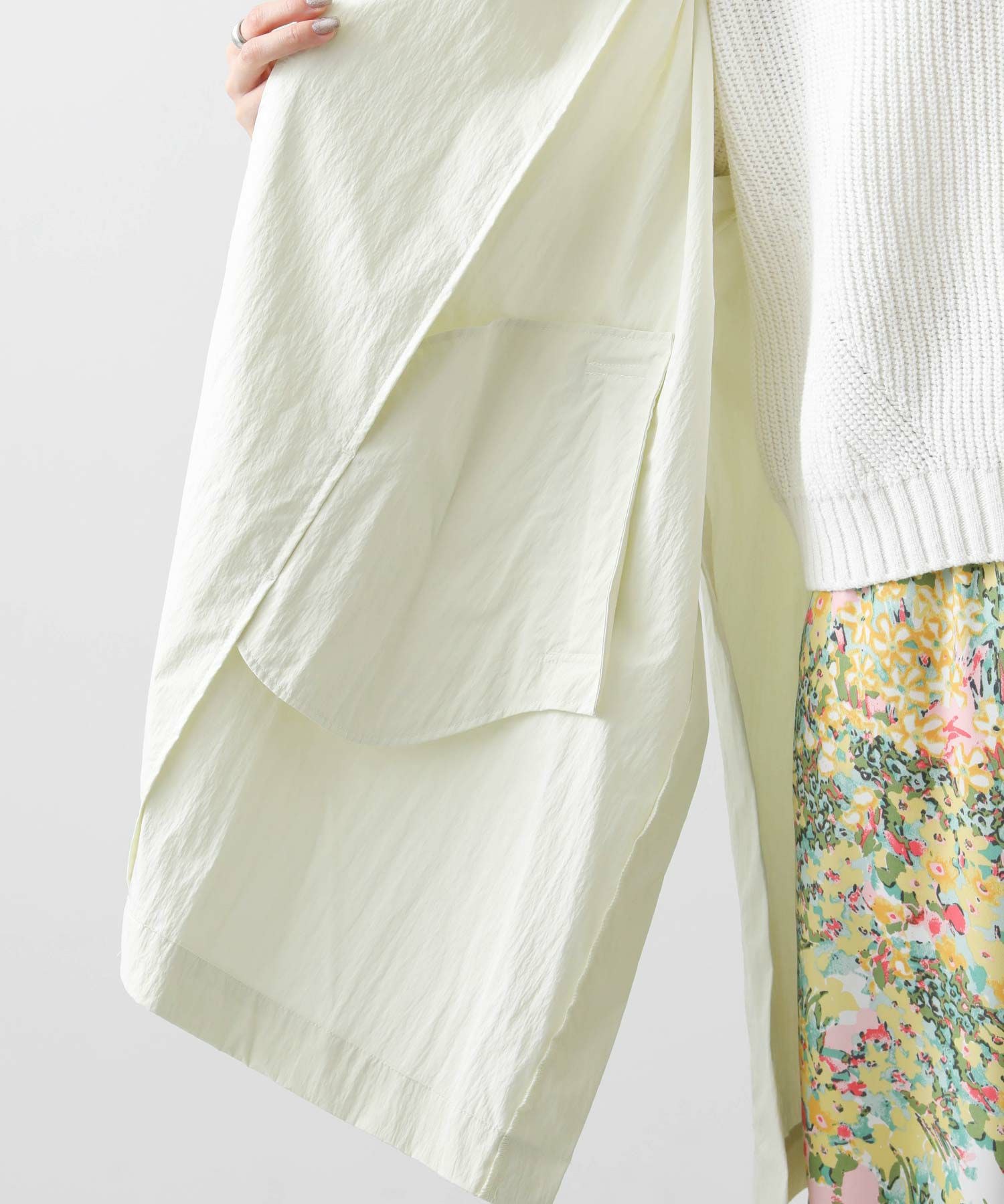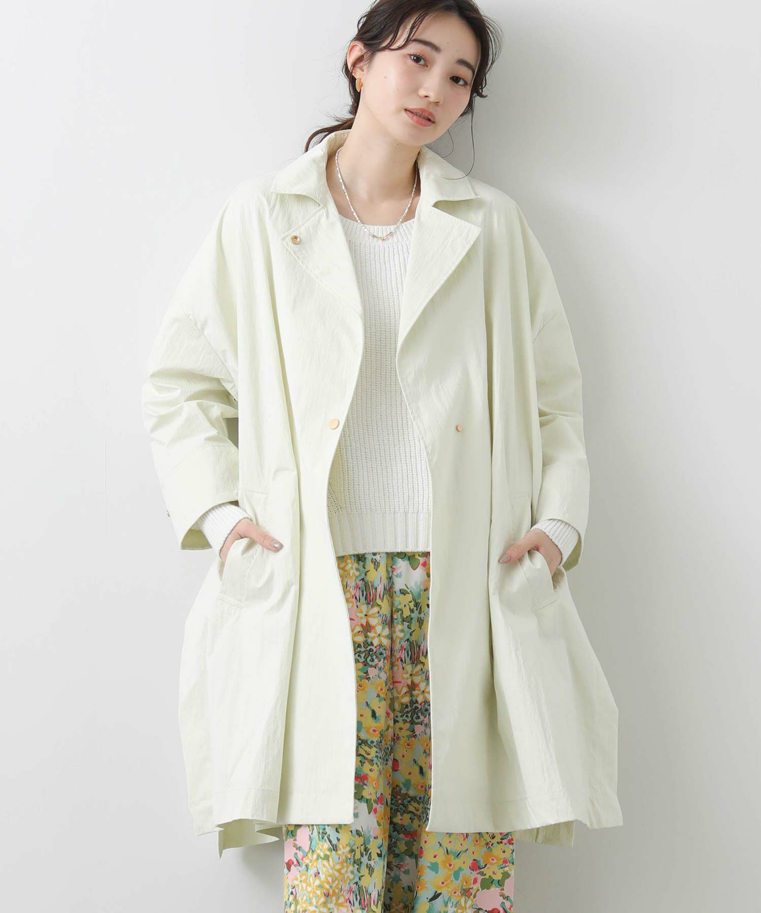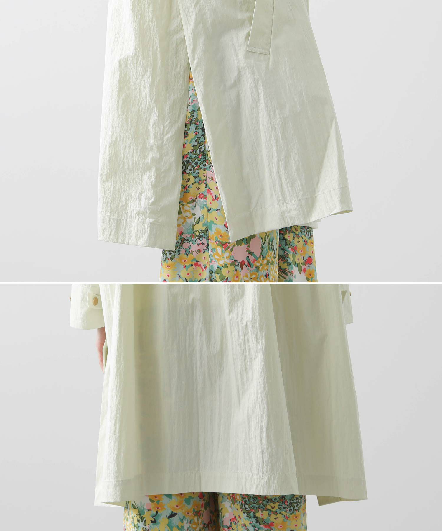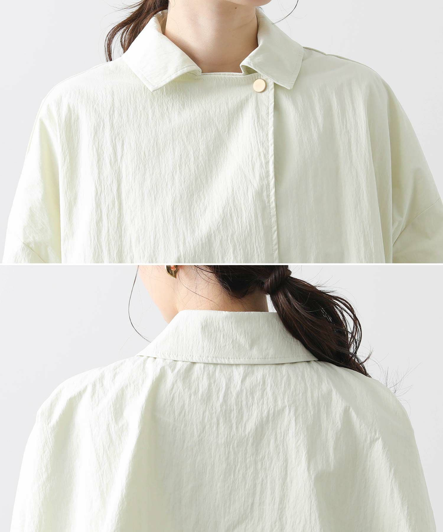 トレンチコートから着想を得たこなれ感のあるコートで、閉じても開いてもサマになるスタンダードなステンカラーデザイン。ピーチ感のある表面と程よい厚み、ハリのある素材でシルエットを美しく保ちます。