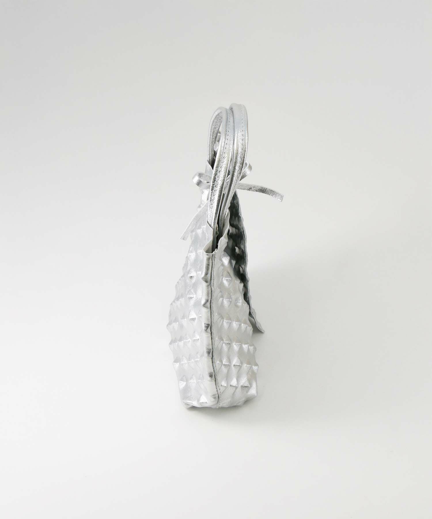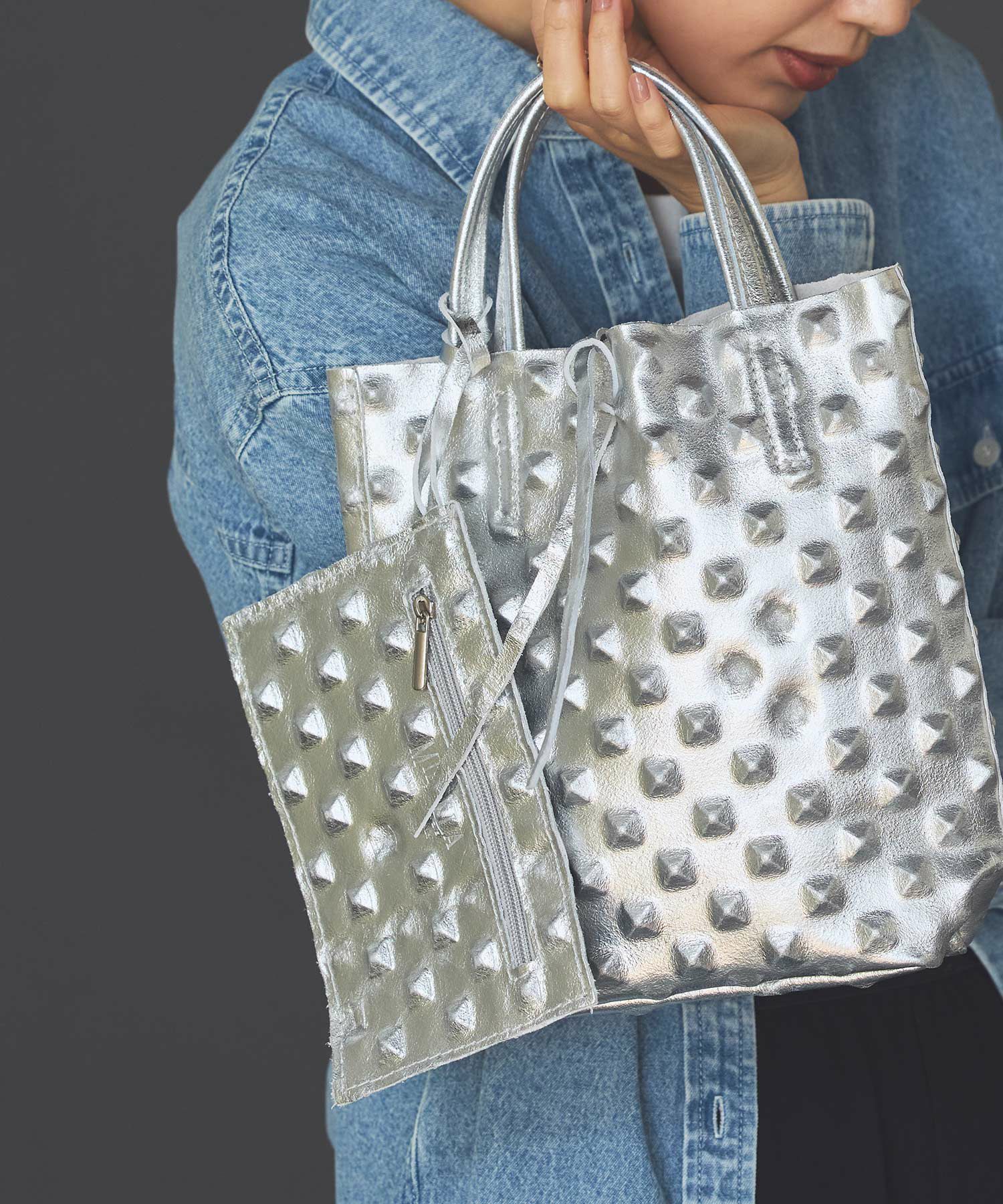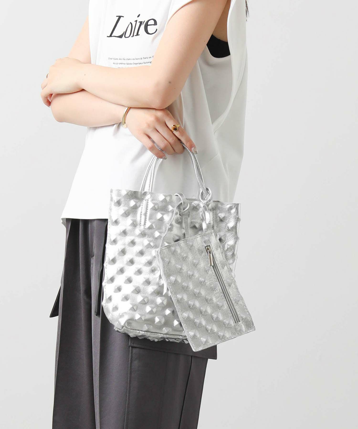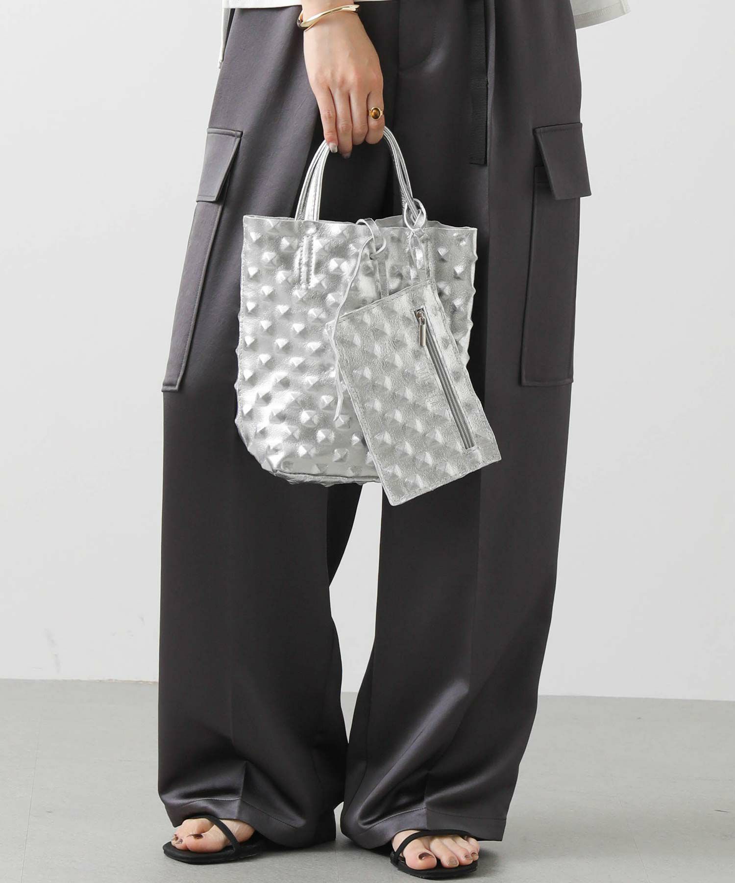スタッズエンボスを施した革のテクスチャが、モダンで上品な印象のトートバッグ。