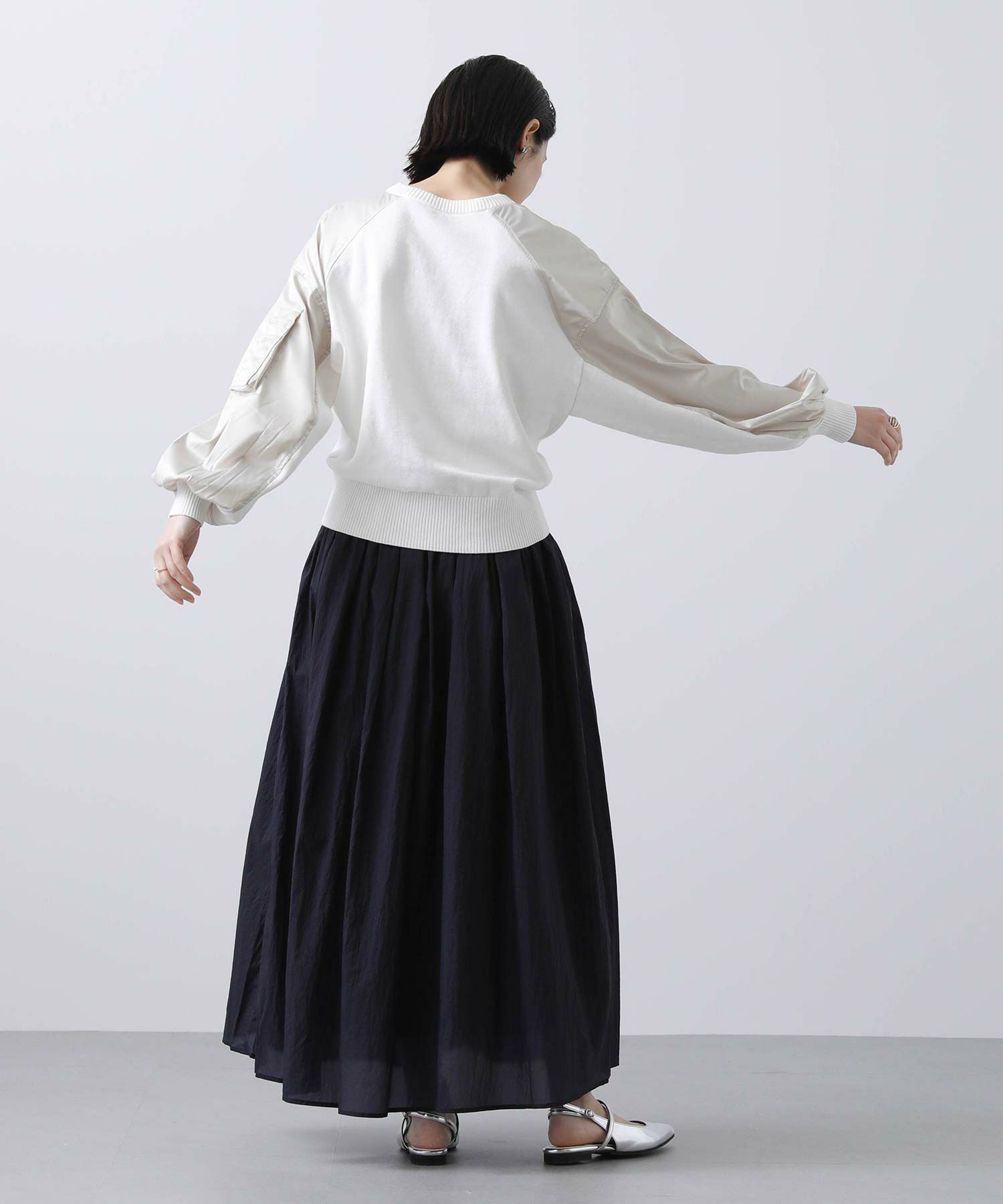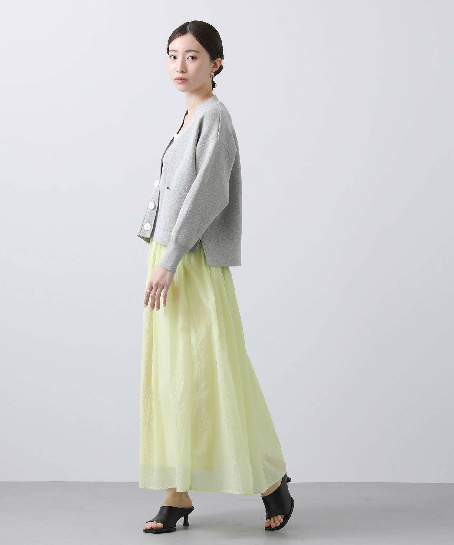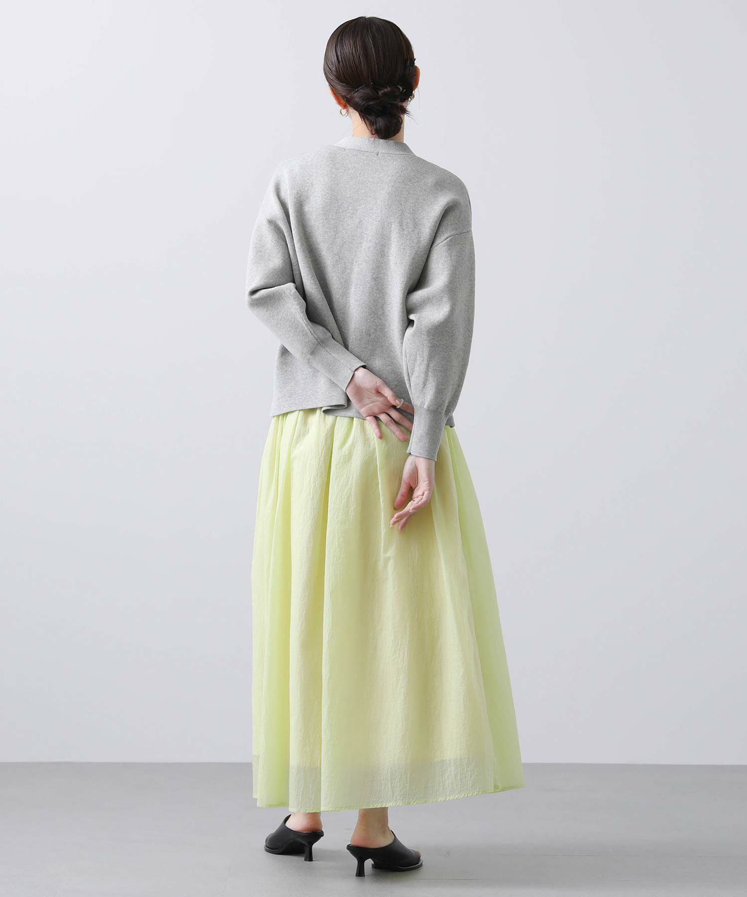 トレンドライクなシアー素材で、たっぷりと生地の分量をとり、動きの出るデザインに。
