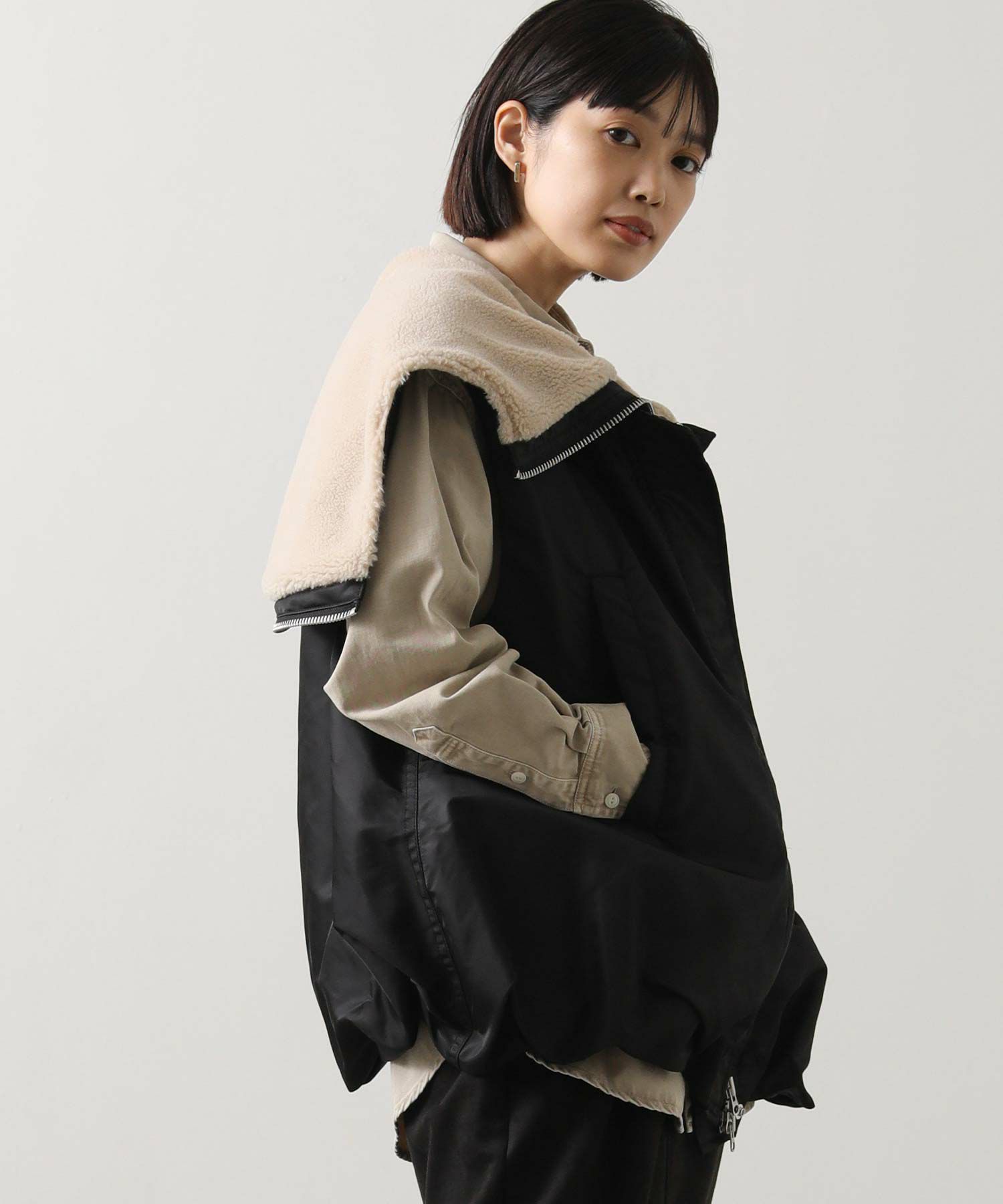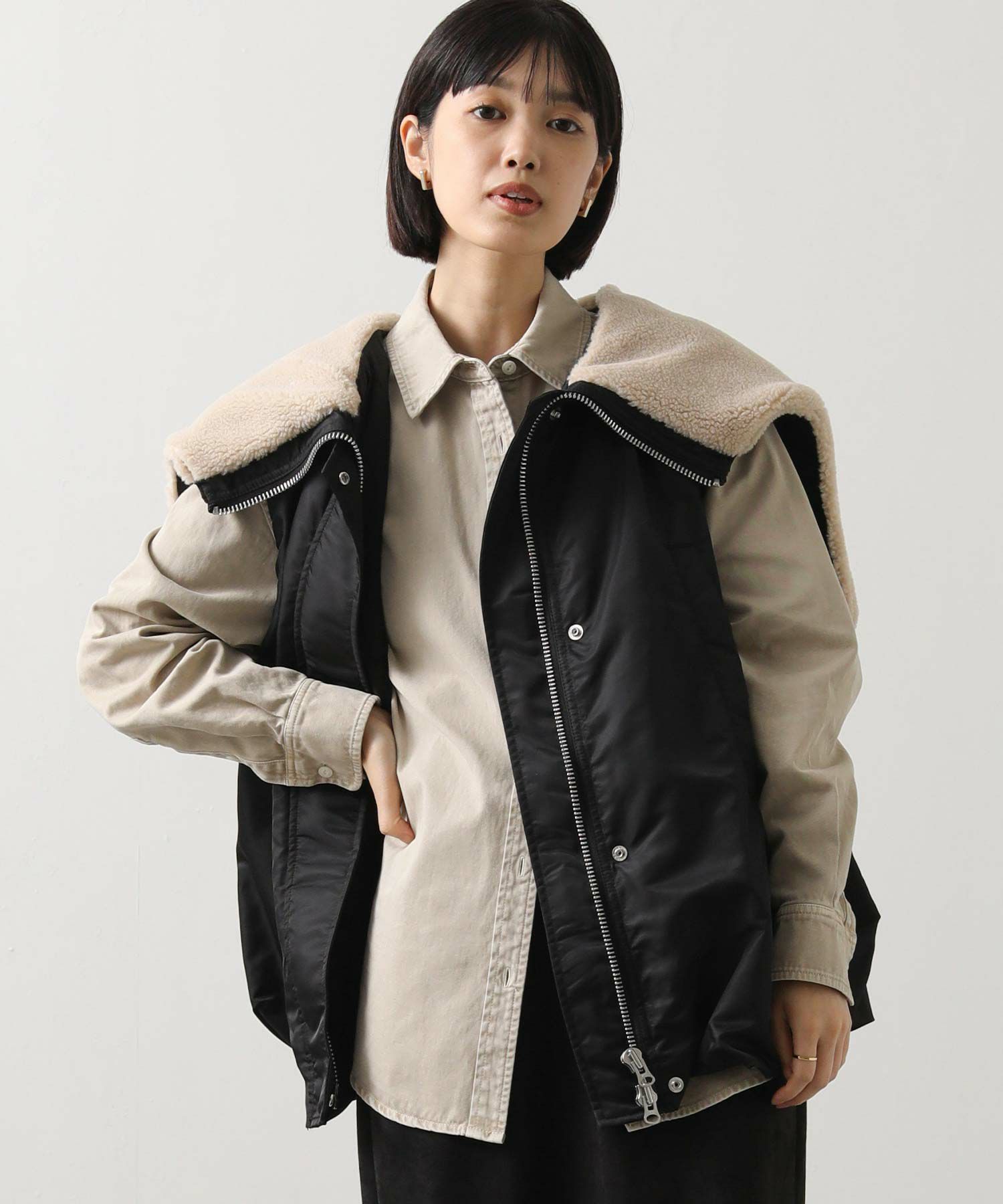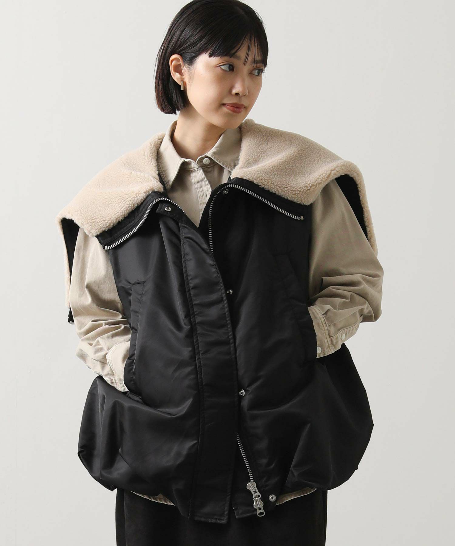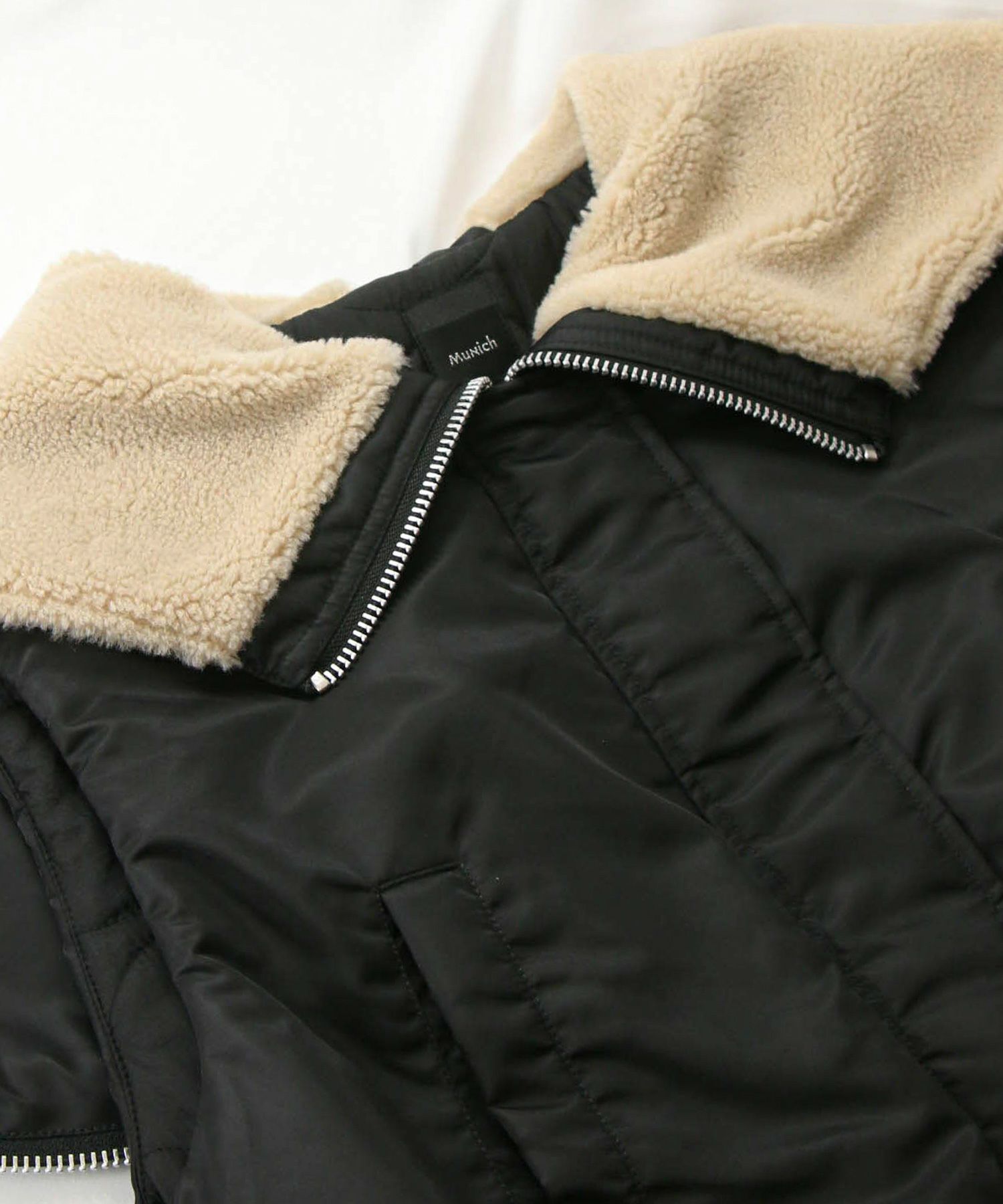 【Munich(ミューニック】から、ミリタリーなデザインを施したナイロン×ボア×中綿のコンビの、丸みあるフォルムで女性らしさを感じられるベストをセレクト。