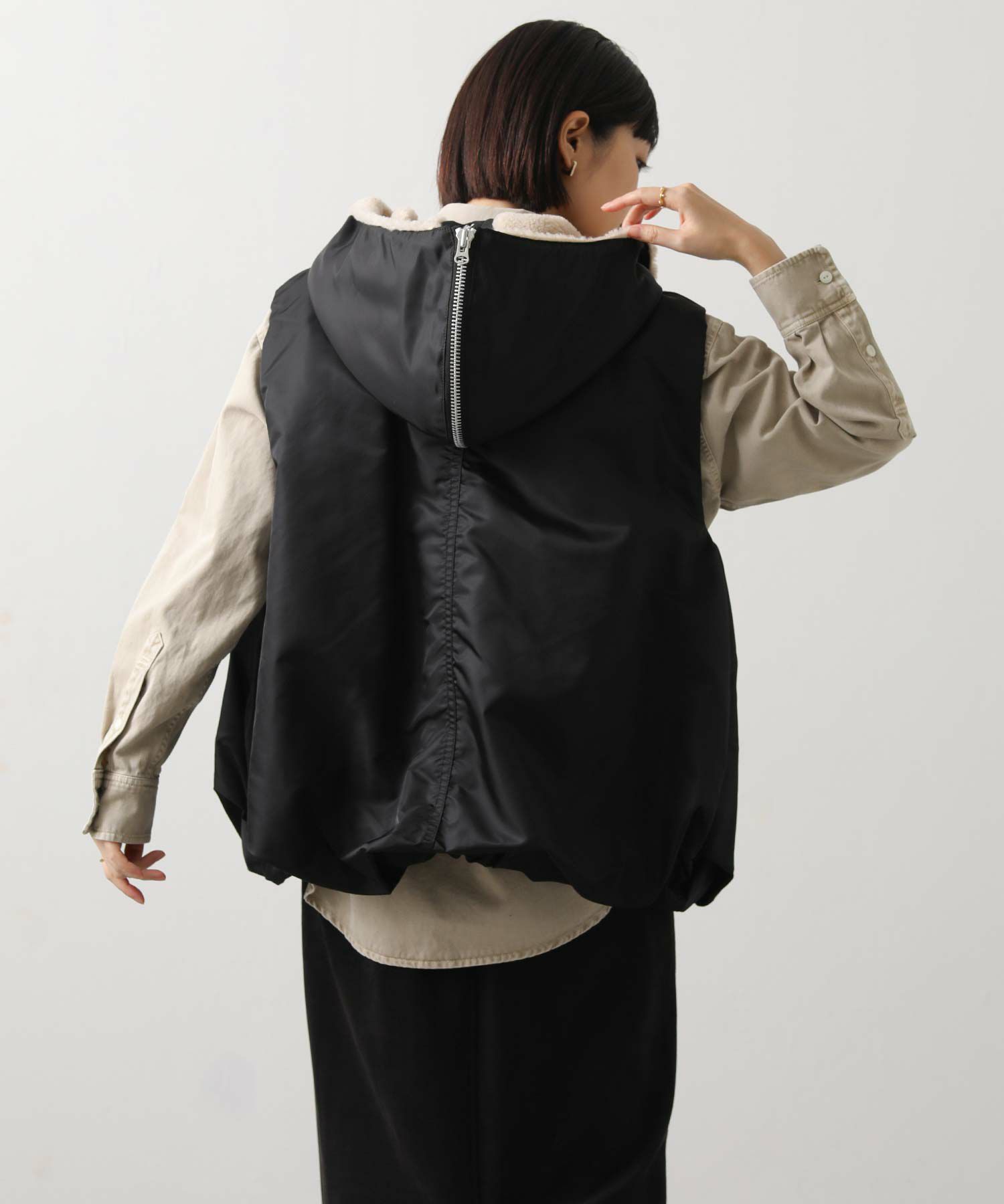 N2BやN3Bなどのフライトジャケットをデザインのベースにしたベストで、コールゴムギャザーとタックによるバルーンヘムでシルエットにアクセントを加えました。