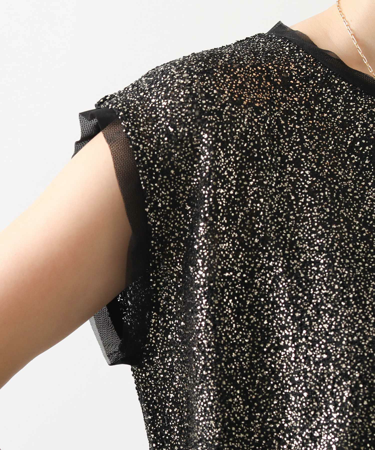 凹凸感のあるストレッチカットソーに、箔プリントが施された華やかな素材を使用して、袖口と裾に軽やかなシアーチュールをドッキングさせています。