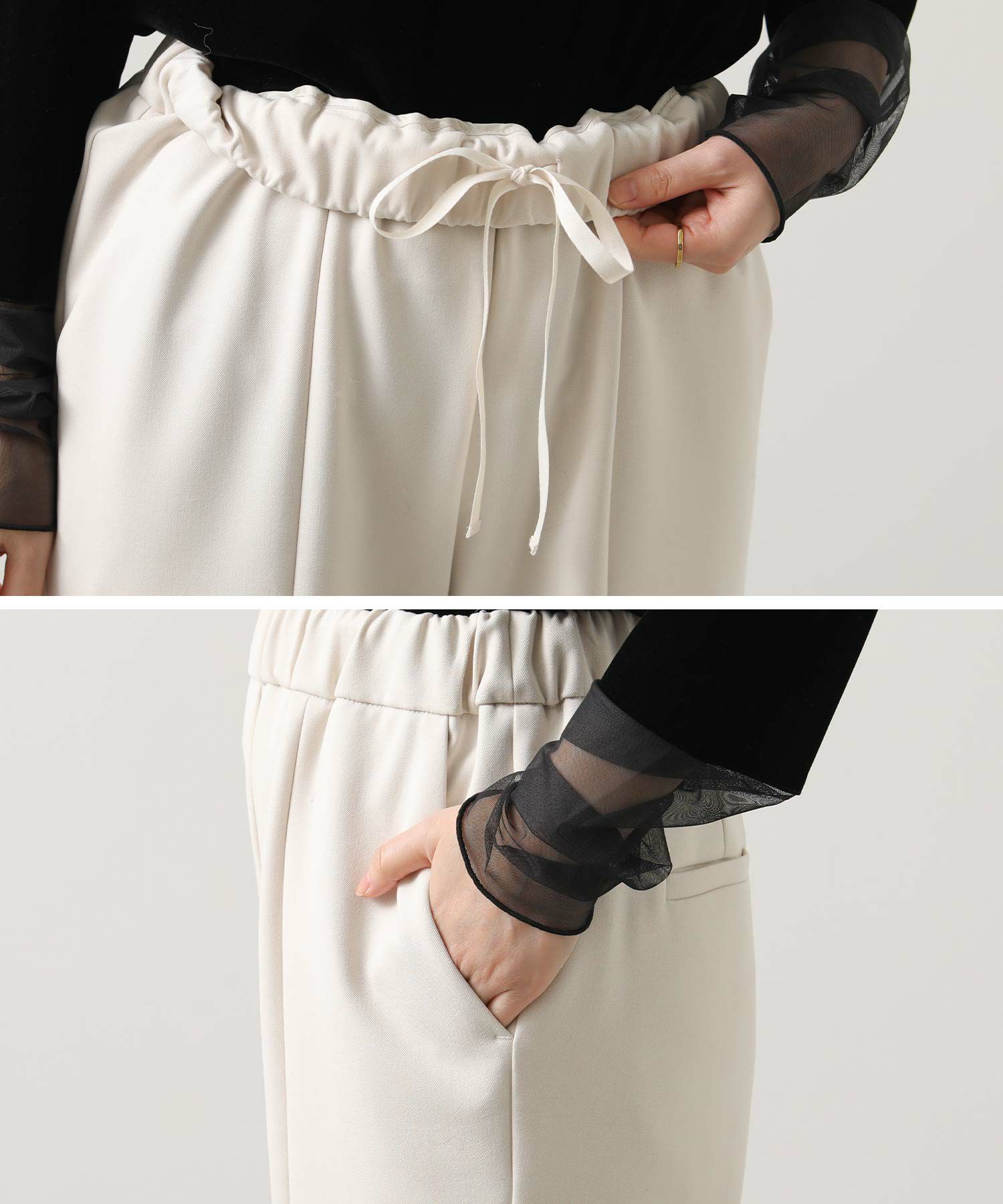 フロントにスリットが入ったスッキリ見えパンツ。