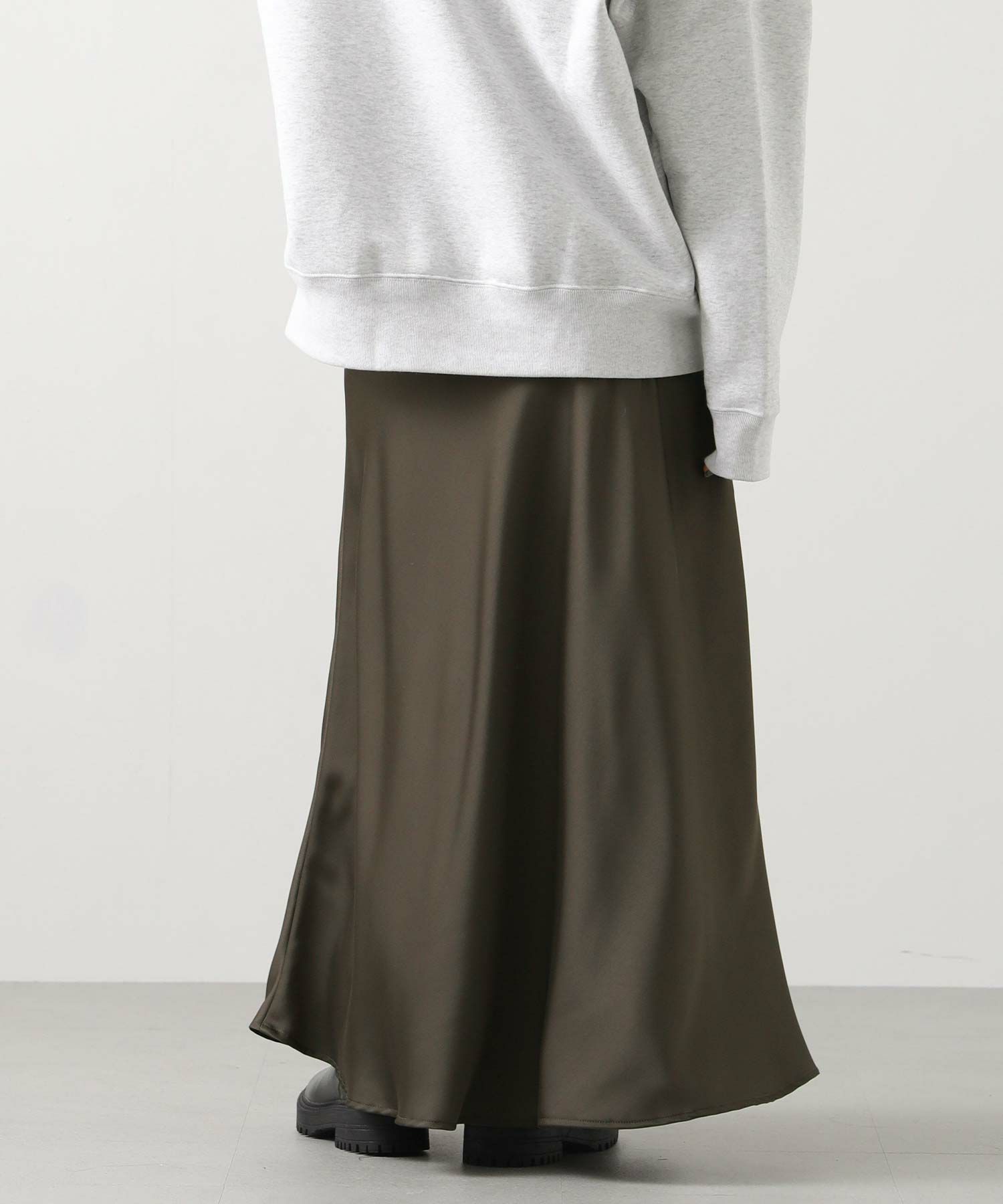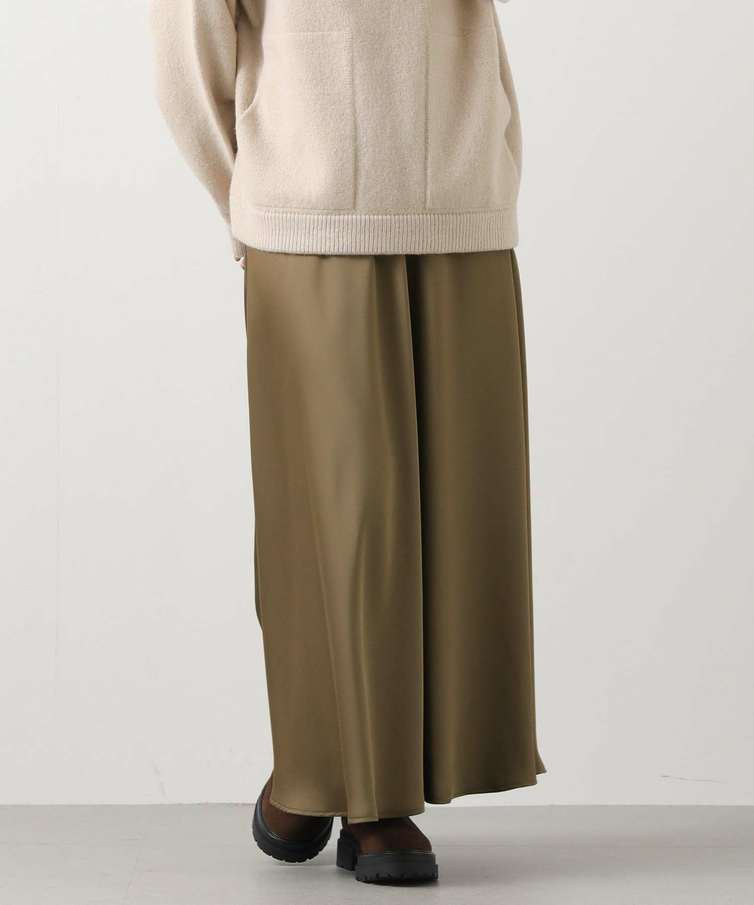 きれいなフレアシルエットの出るサテン生地スカート。