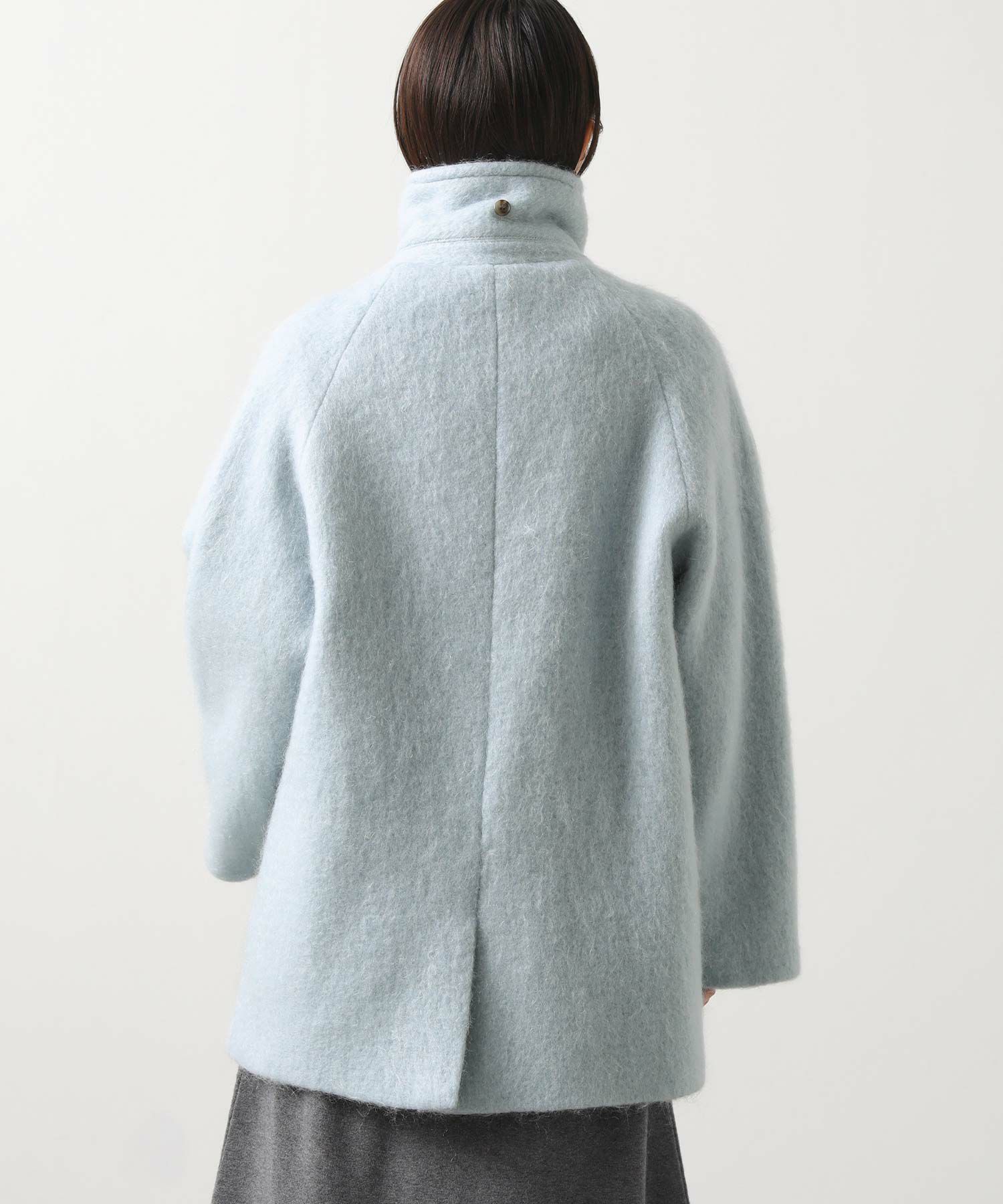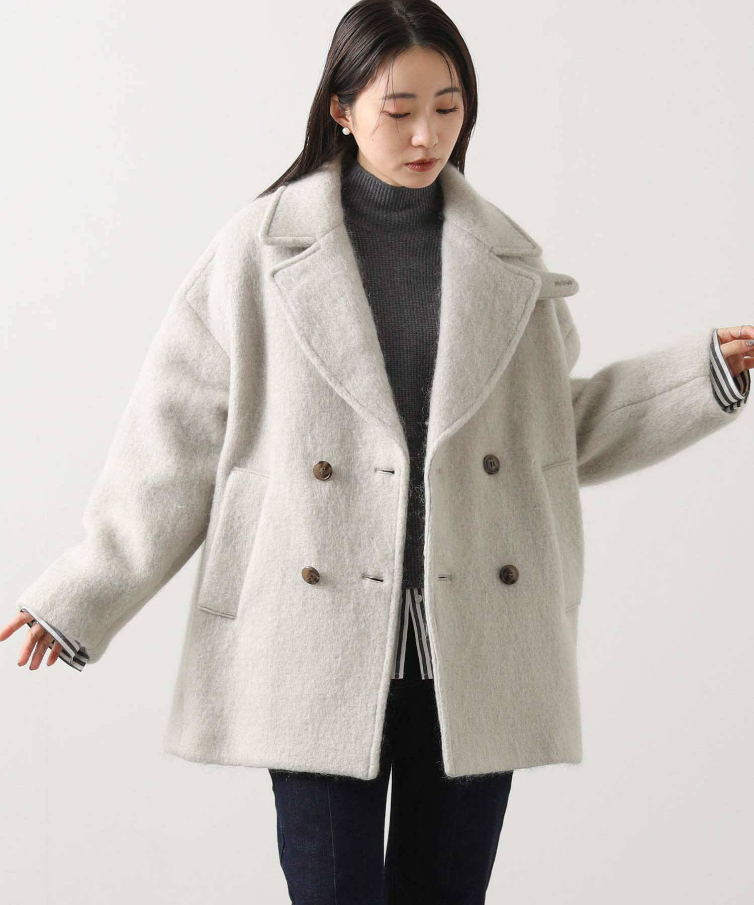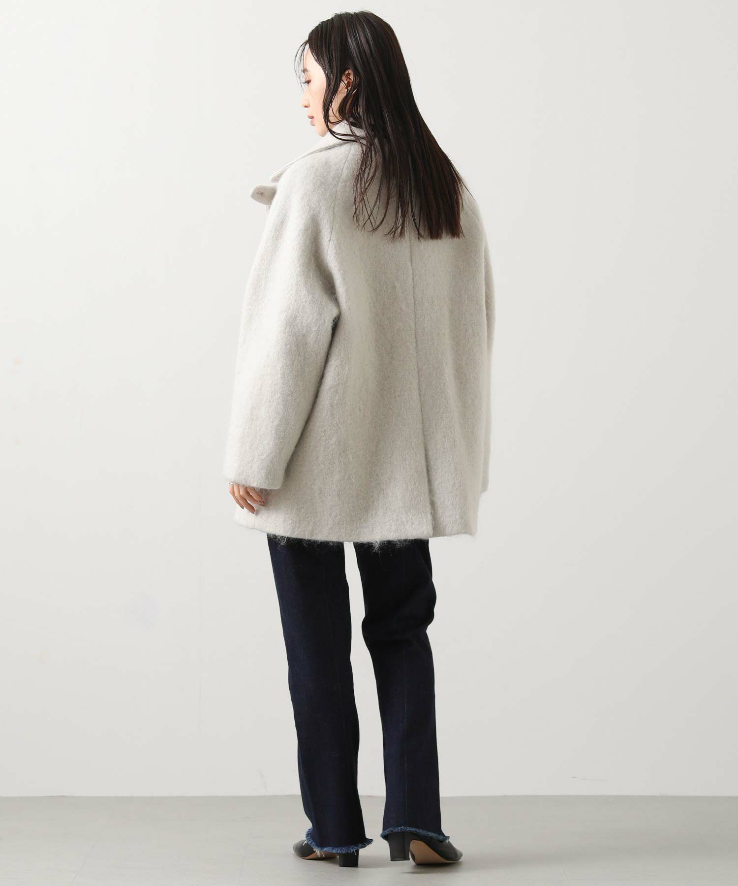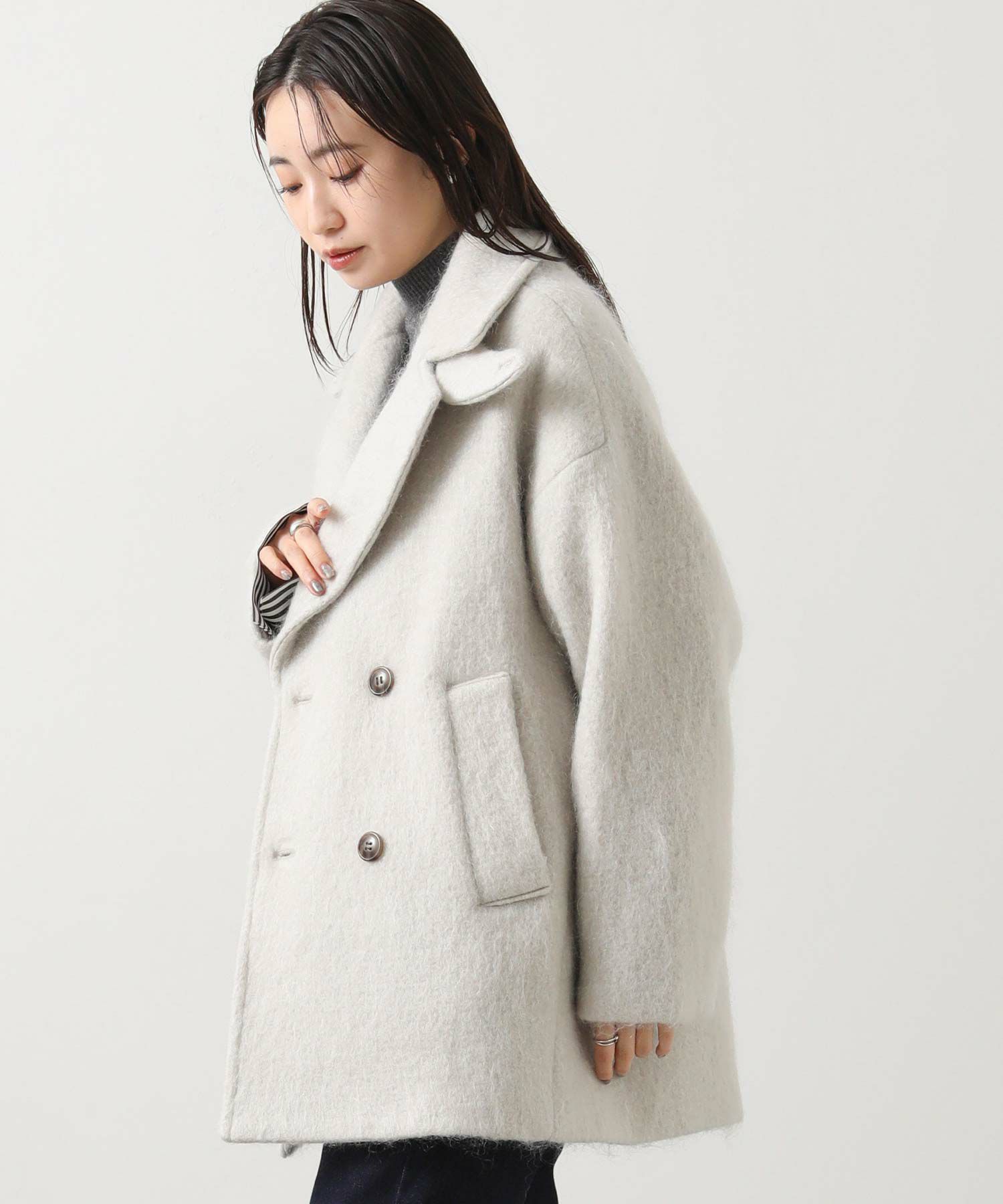 大きめの襟にミドル丈が絶妙なバランスのモヘヤシャギーPコート。