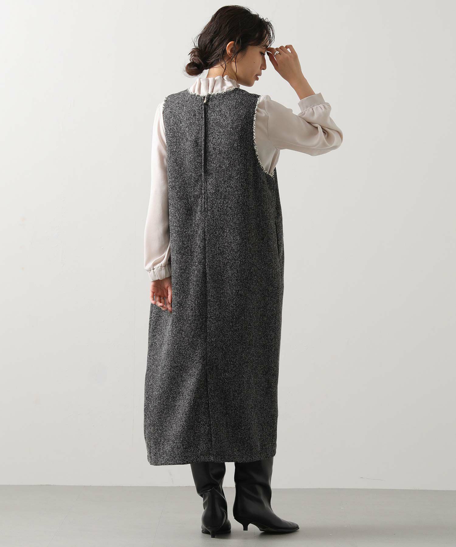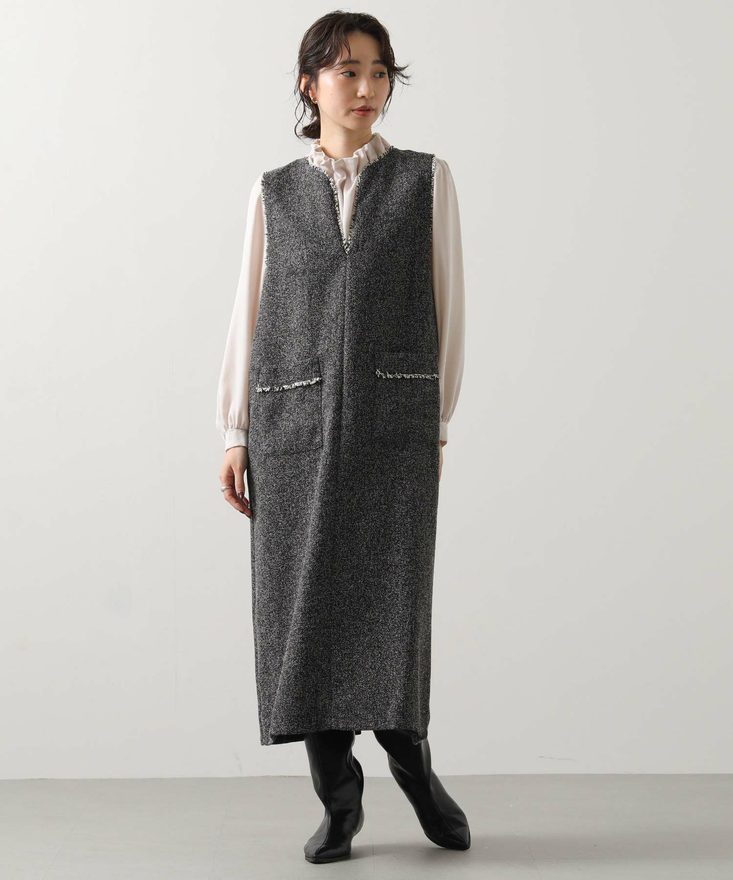 衿元とポケット口を彩る華やかなフリンジが目を惹く、ツィード調のジャンスカ。