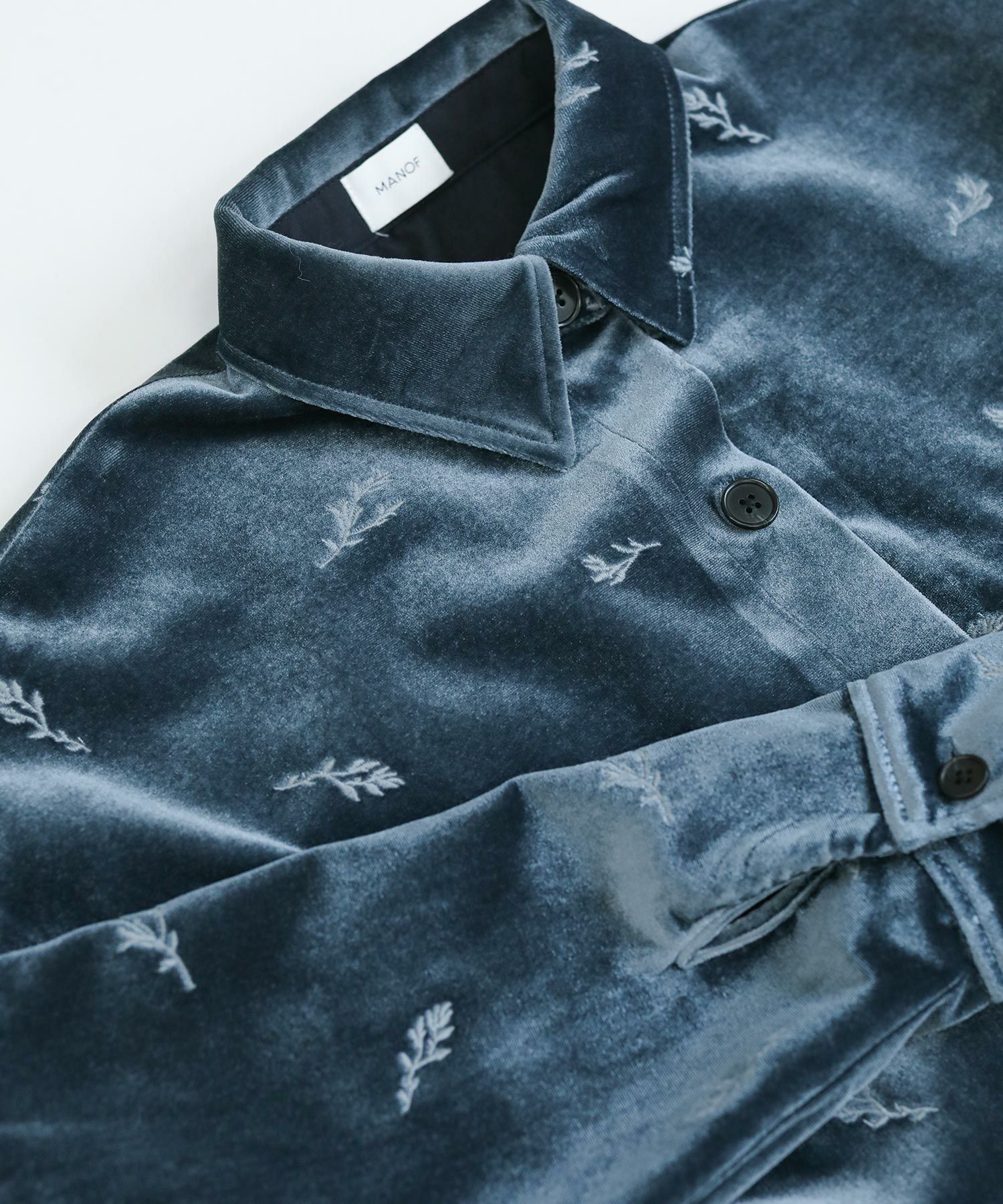 ノスタルジックな雰囲気漂うリーフモチーフのオリジナル柄を刺繍加工したベロア生地。 全面芯仕様と裏地仕様でハリ感を持たせ体に張り付かないジャケットライクに仕上げています。 シャツのきちんと感が苦手な方も気軽に羽織りやすいデザインです。 中にニットも着れるくらいのオーバーサイズシルエットと、裏地付きなので暖かさも兼ね備えています。