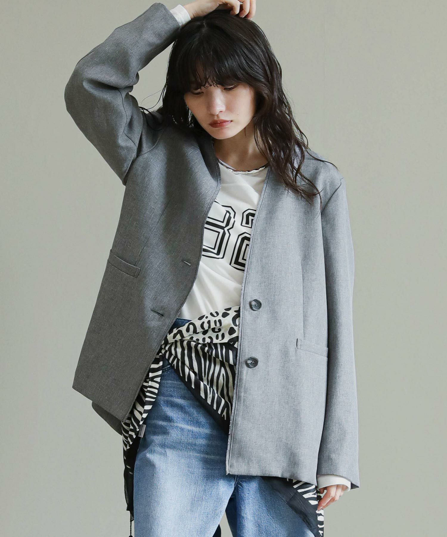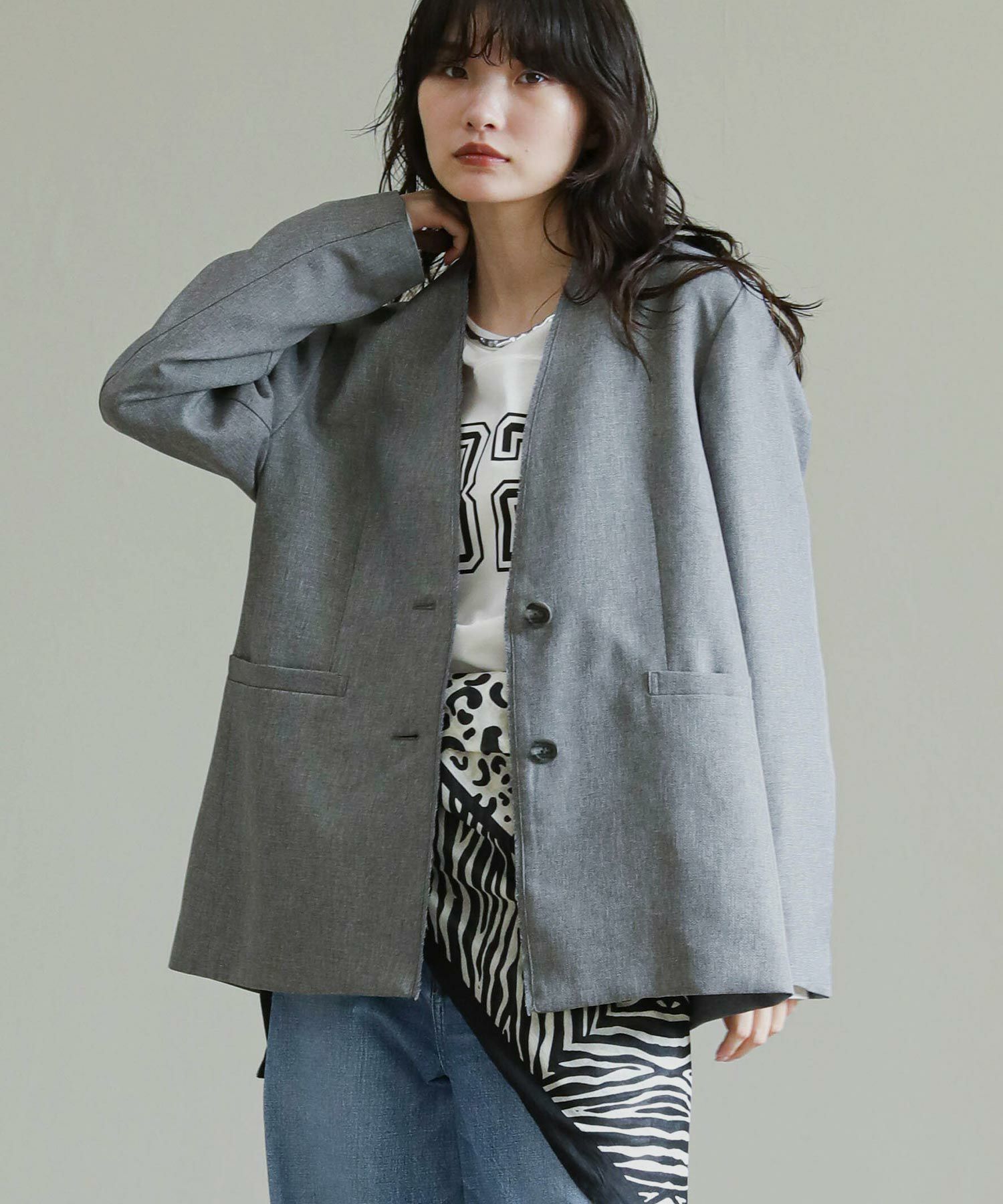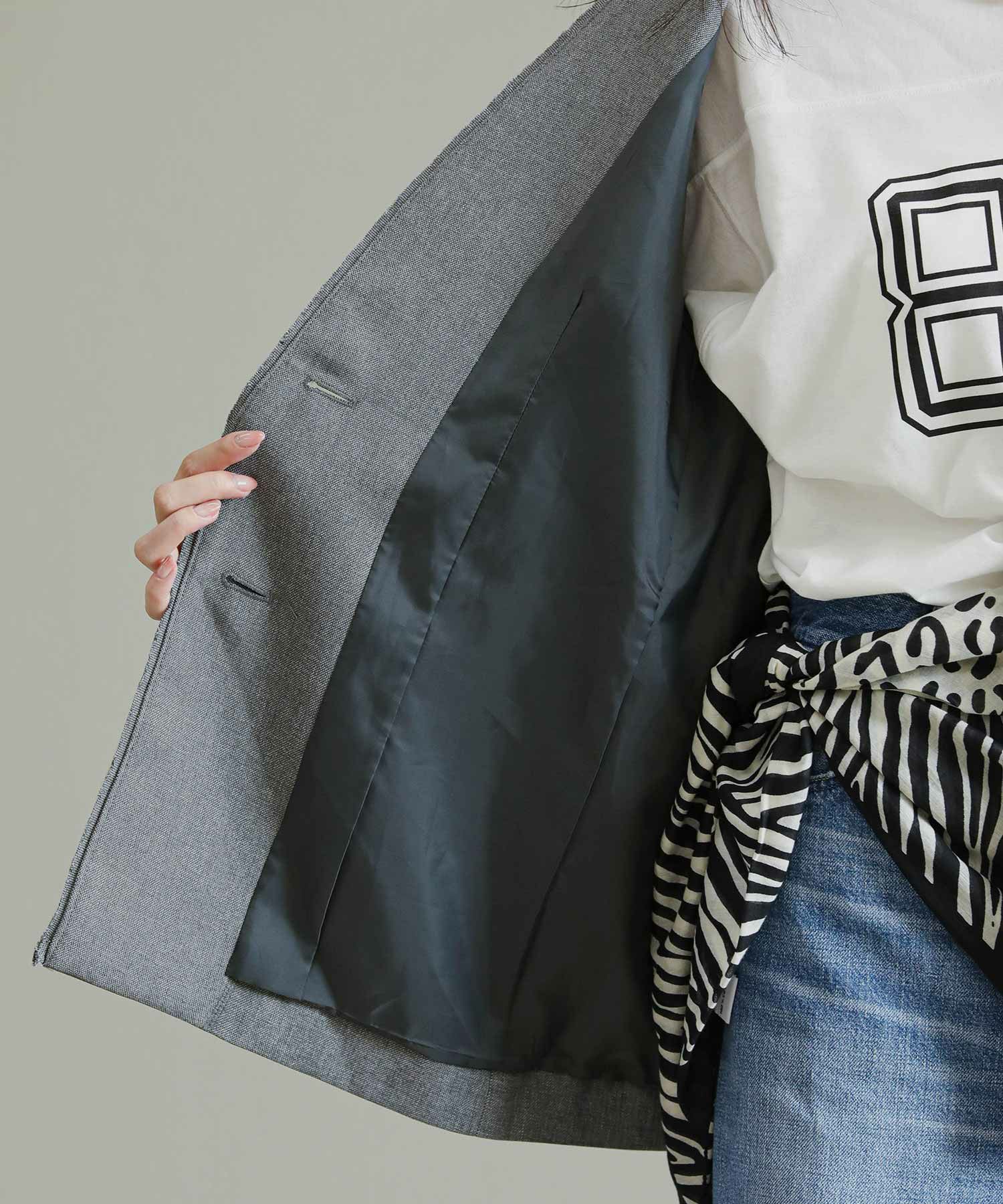 ツィード調のクラシカルな雰囲気にカラーレスのモードなデザイン要素が絶妙にマッチした1着。オーバー過ぎず、程よいサイズ感なのでデニムでカジュアルダウンしても、きれいめボトムとお仕事仕様にも、幅広いスタイルをお楽しみいただけます。
