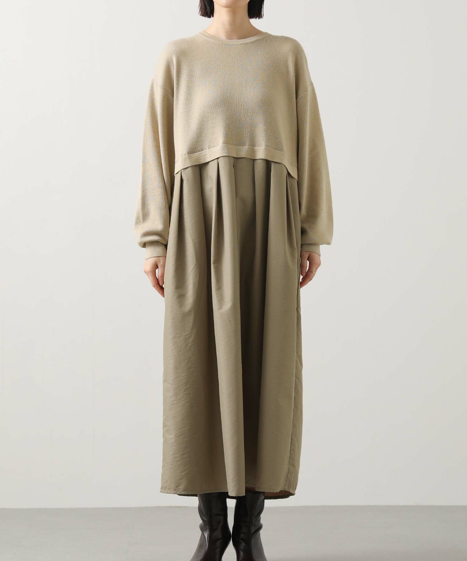 ニットワンピースはウエスト位置で布帛とドッキングしたデザイン。