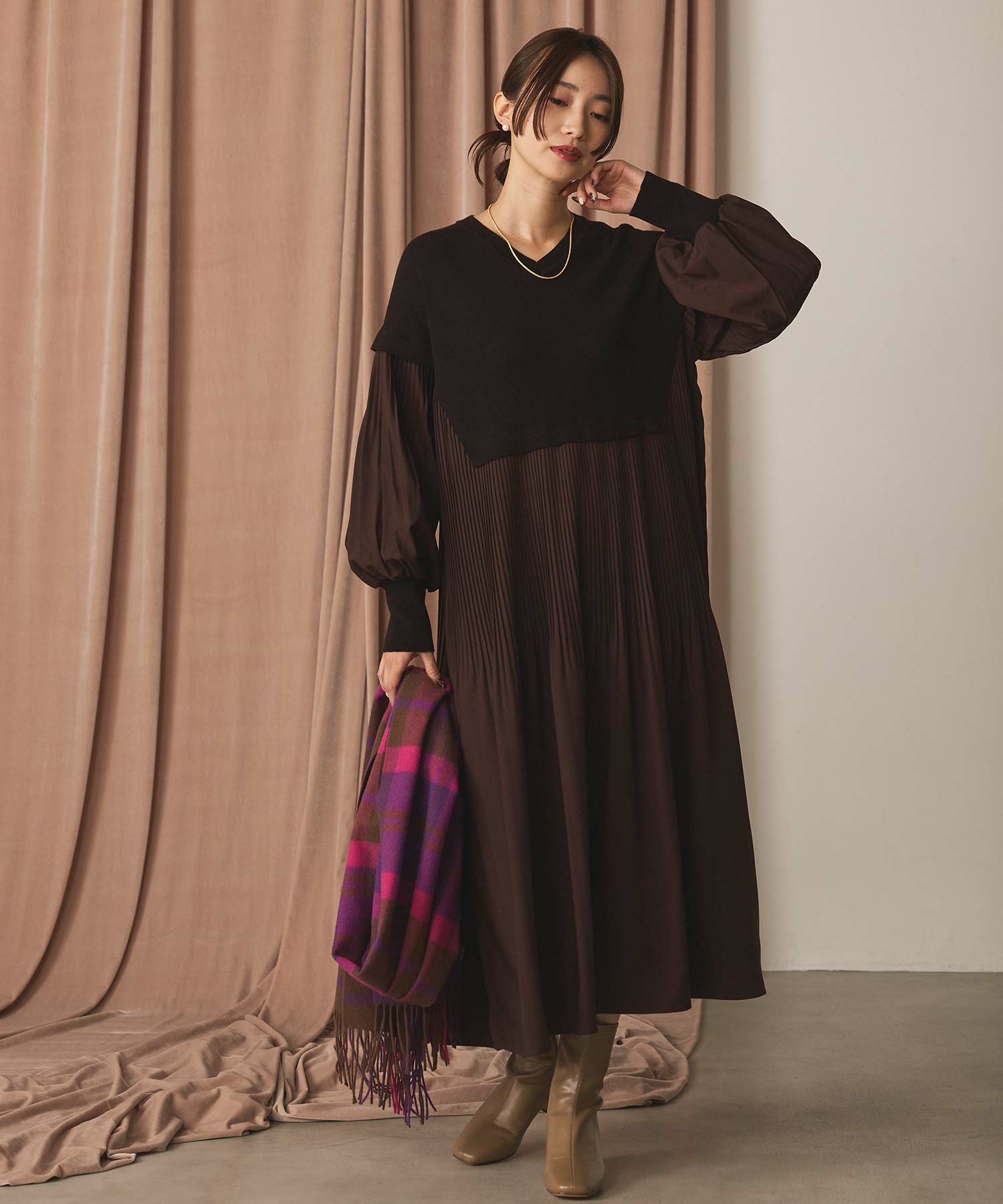 スッキリ見えするVネックのニットと異素材のプリーツがドッキングしたワンピース。