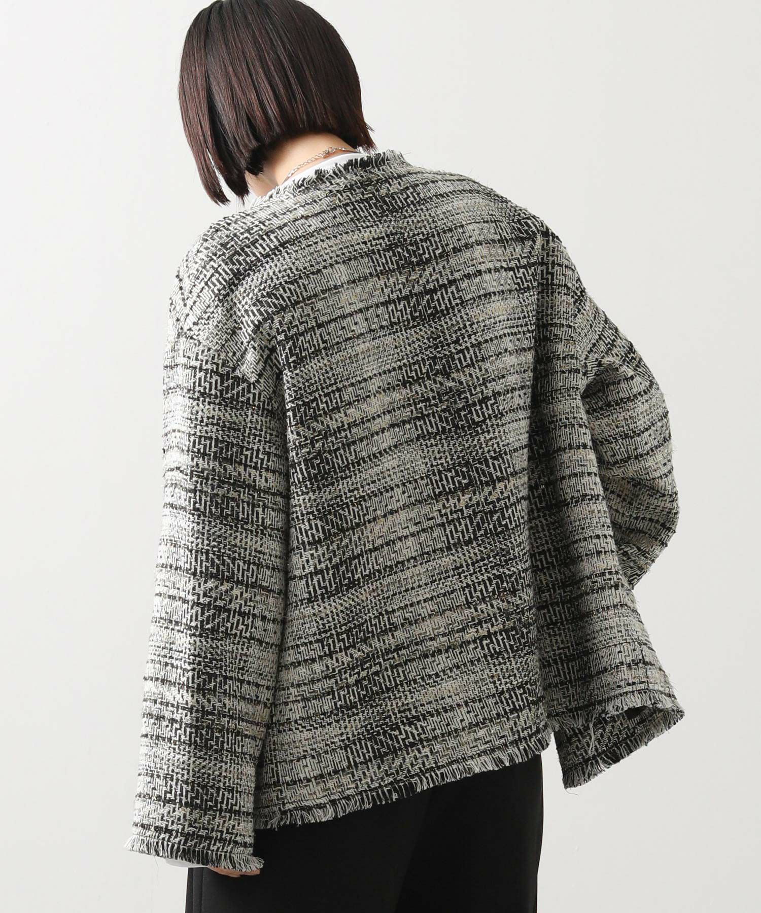 大胆なチェック柄の生地を使用したツイードジャケット。