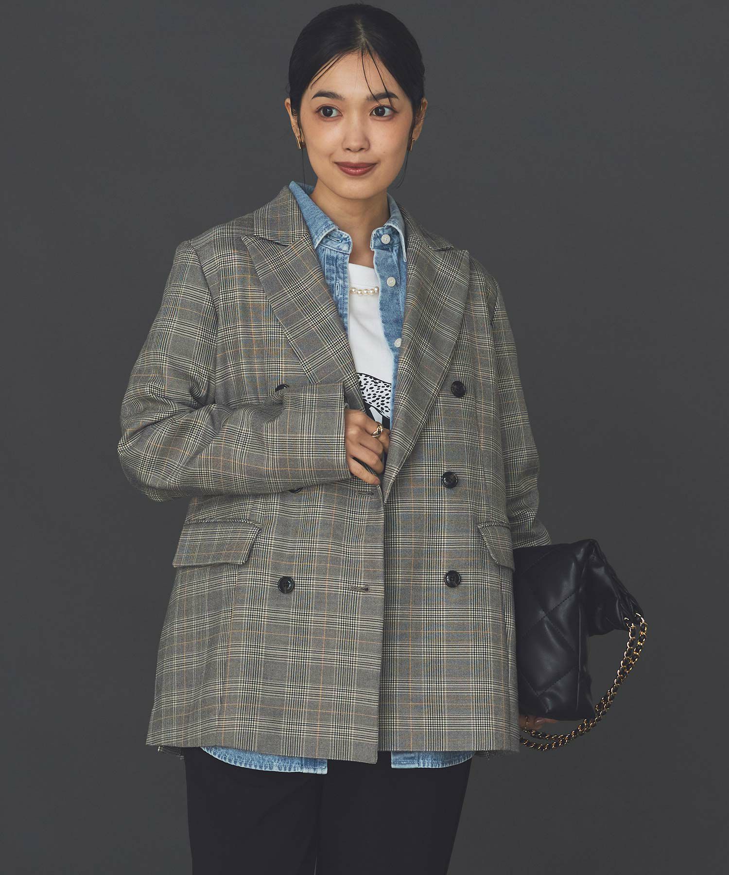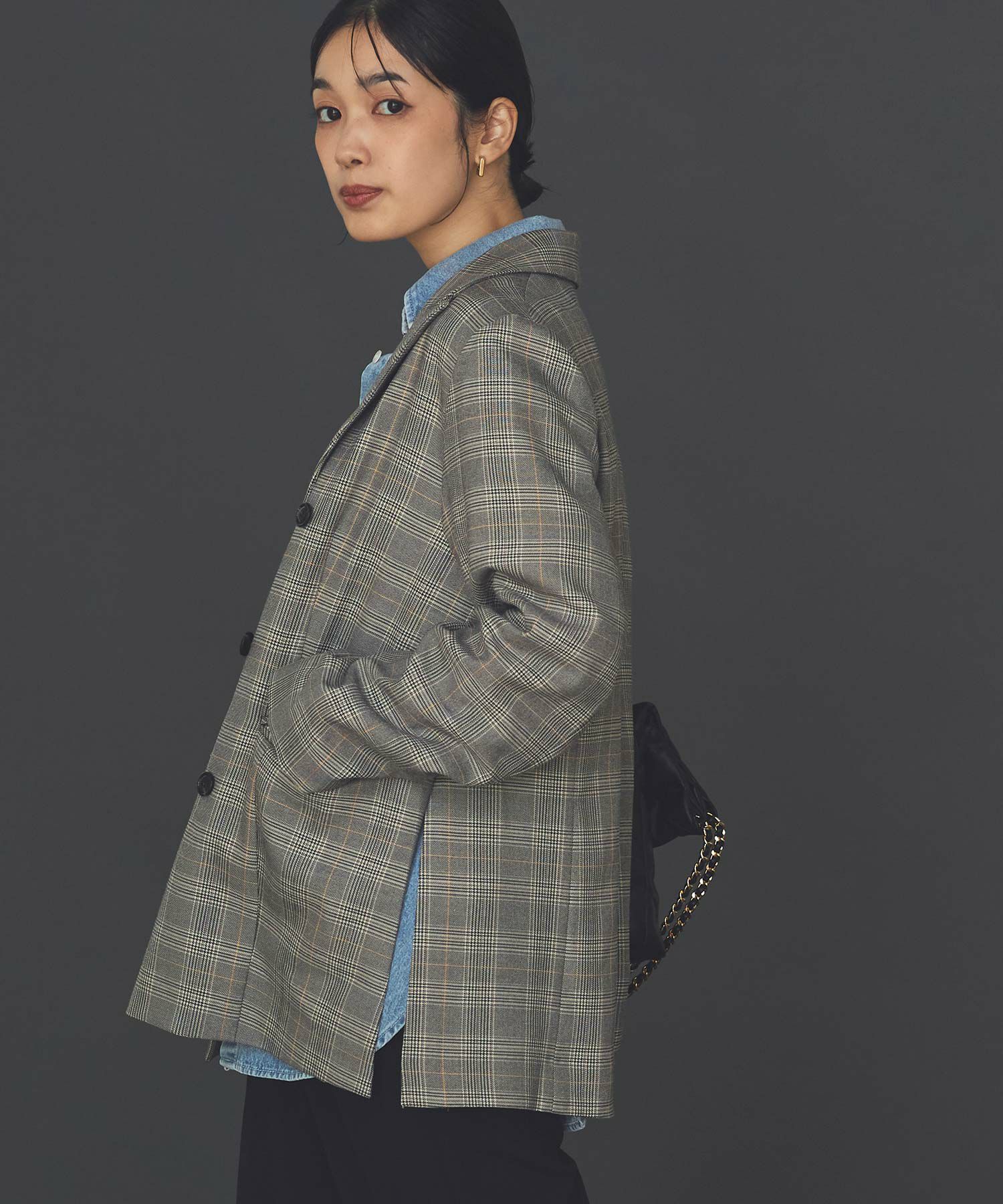 トラッドな印象ながら、ボクシーなシルエットやサイドのスリットで抜け感を演出。落ち着いたトーンと馴染みが良い柄で、着やすいチェックに。